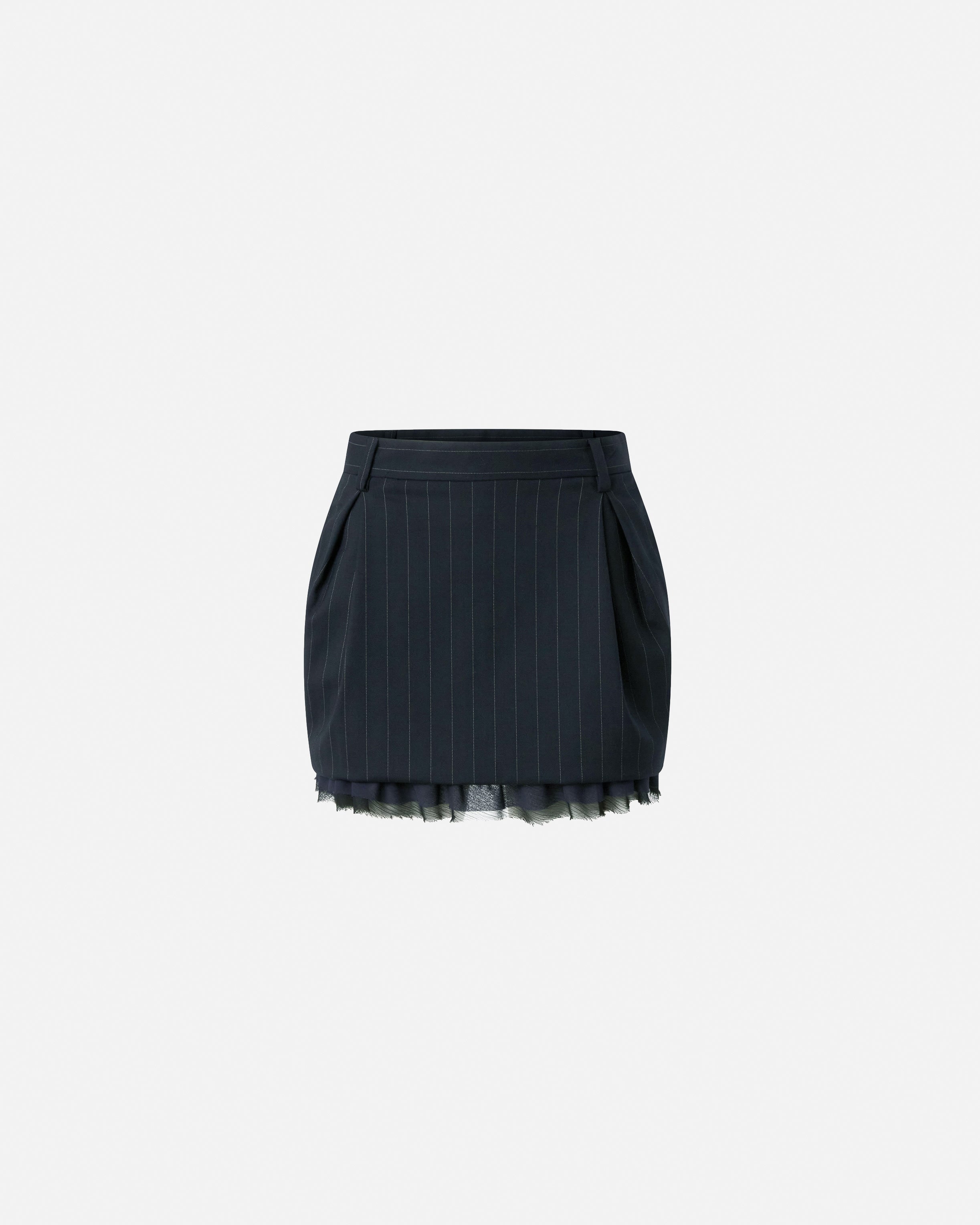 Short skirt lined with a balloon silhouette, highlighted by a soft pleated construction. The fabric used is a classic poly wool pinstripe characterized by a change of texture and light to emphasize the design of the material. The waist is equipped with comfortable belt loops, while the bottom is raw-cut for a lighter and more fluffy final effect. Invisible zip closure on the back. Combine the miniskirt with the jacket of the same pattern for a truly original total look that is impossible to forget.