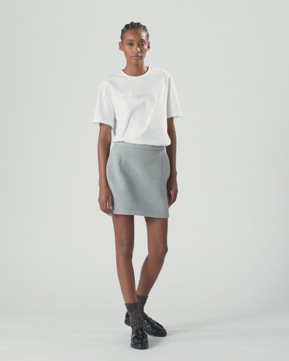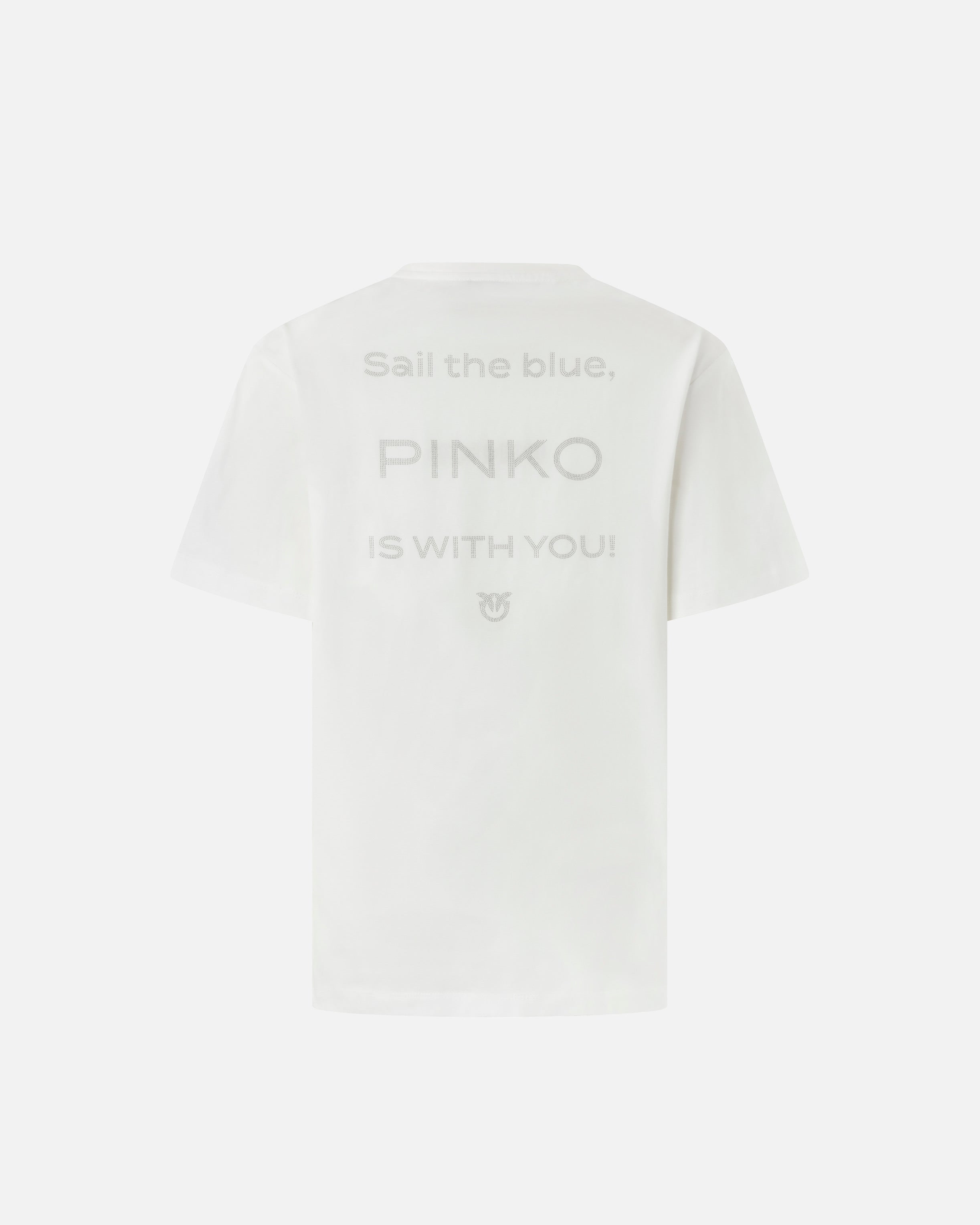 Pure cotton jersey T-shirt with round neck and short sleeves. The piece features shiny rhinestones that cover both the PINKO lettering logo on the front and the lettering on the back with the slogan Sail the blue PINKO IS WITH YOU and our must-have Love Birds logo. This T-shirt will work seamlessly with your favourite trousers, elevating your look in a simple, elegant and original way.