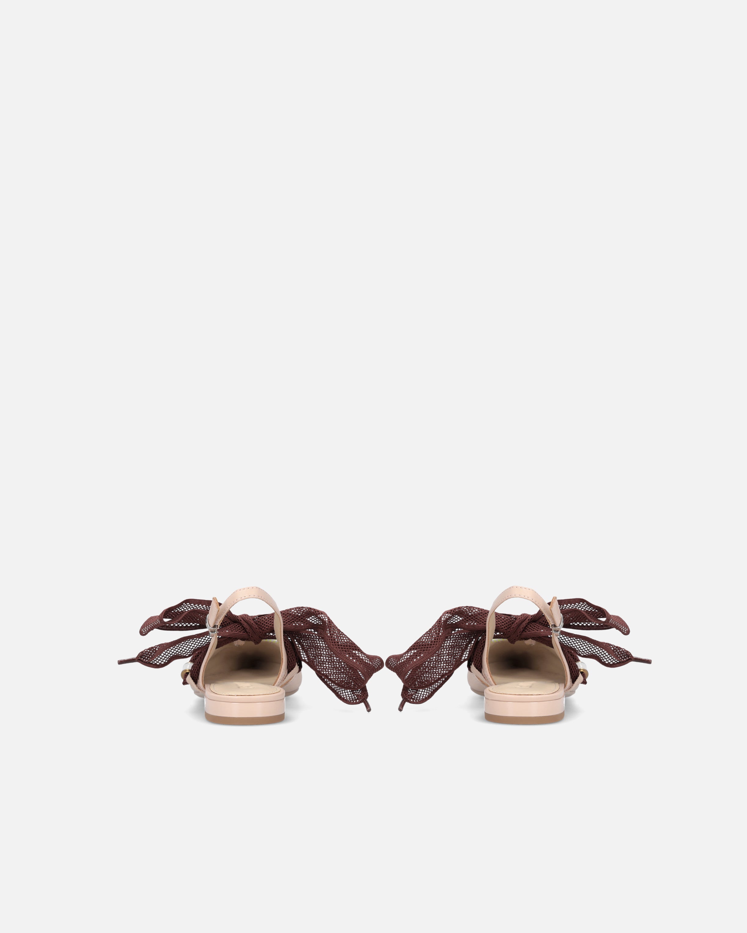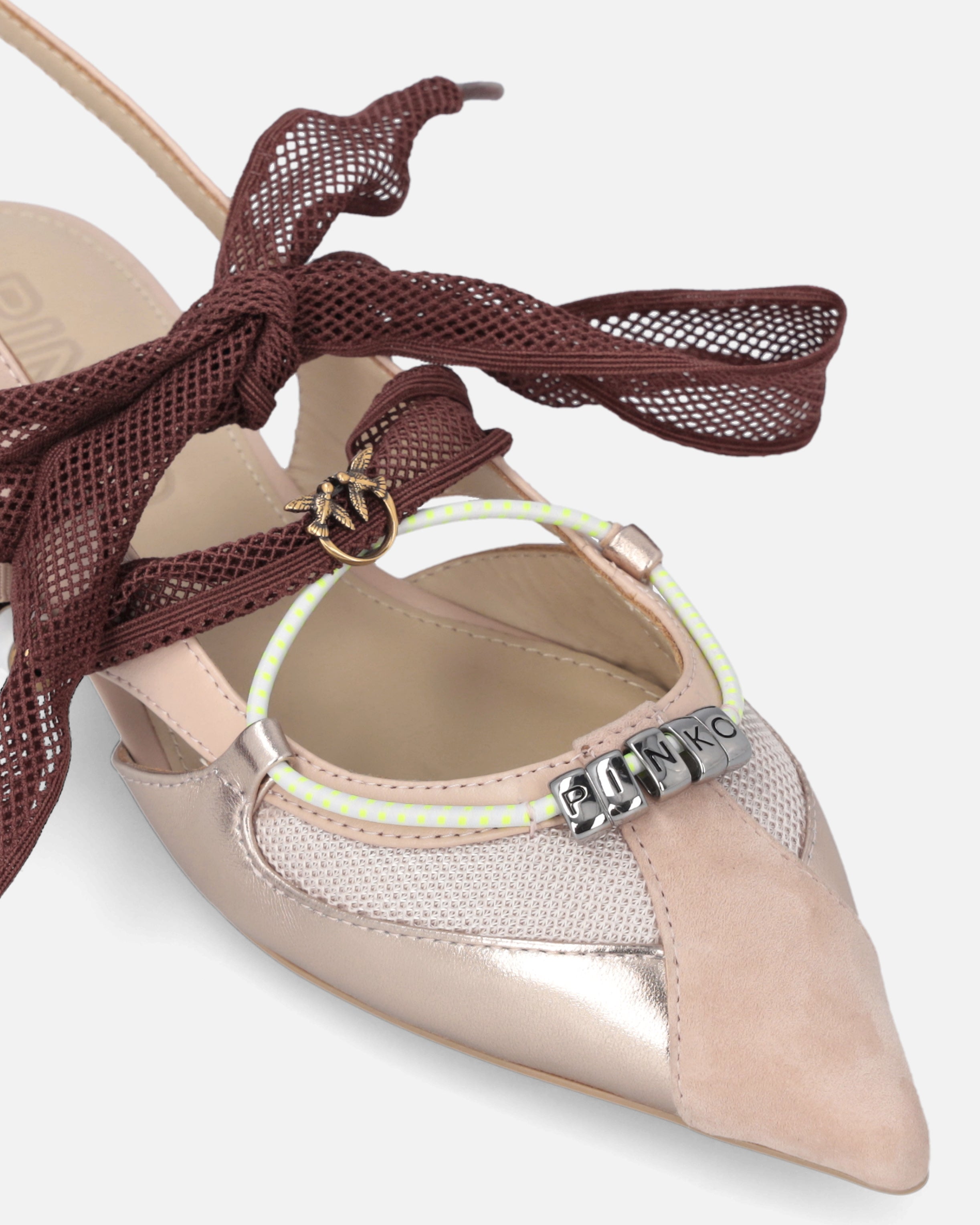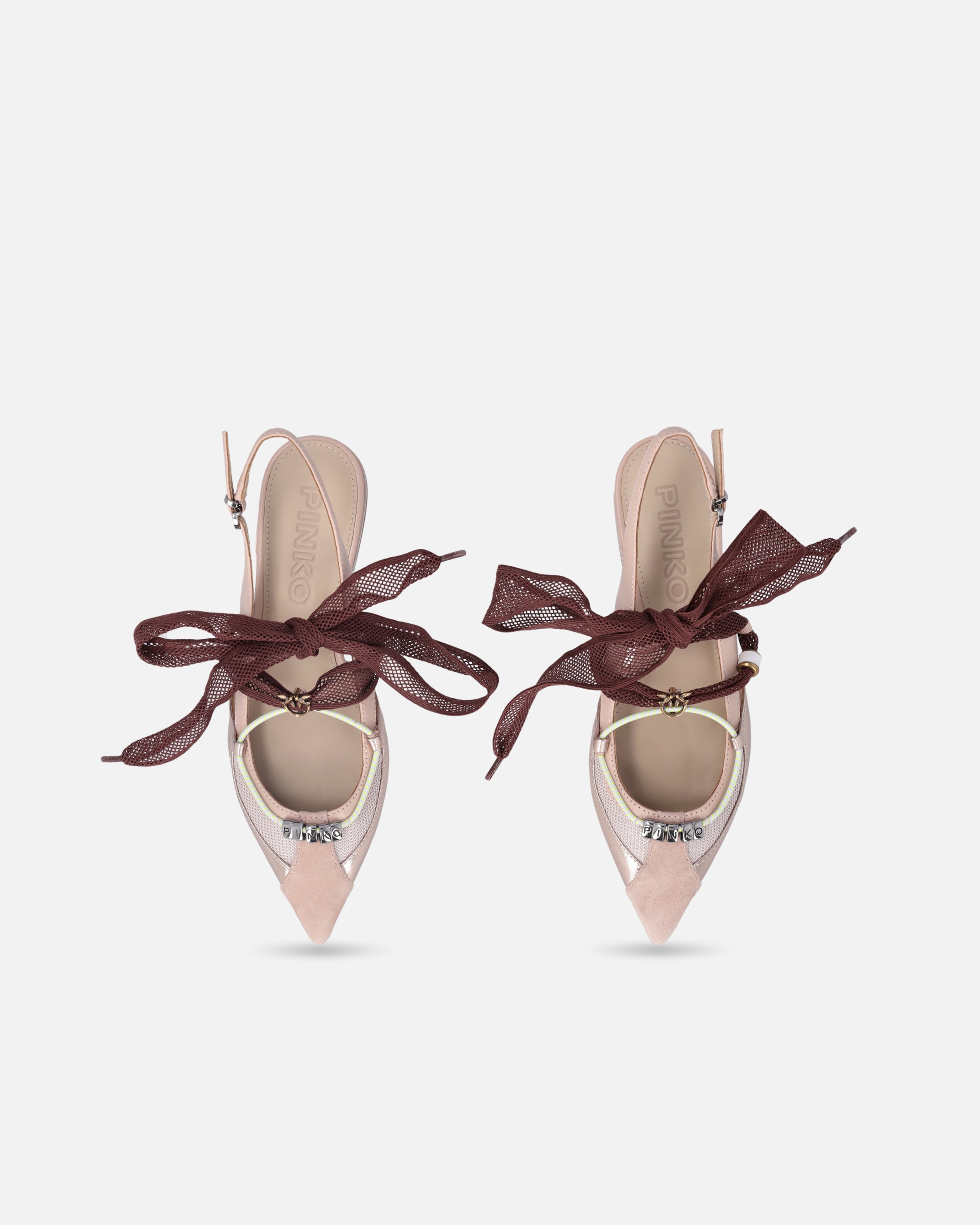 Give your wardrobe a touch of sophisticated femininity this spring with these flat slingbacks in soft smooth nappa leather with a suede toe and mesh panels. The straps to be tied in a bow, again made of mesh, are embellished with a charm and a metal detail with the Love Birds logo, while the lower strap, with subtle graphic elements, is enriched by metal rings arranged to form the iconic PINKO lettering logo. This model features a streamlined silhouette with a tapered toe that gives elegance to the fit, and a flat sole that ensures lightness and comfort for everyday wear, without compromising on style. Perfect for both daytime and evening looks, these ballerinas are sure to turn heads. - GIANIRA 30