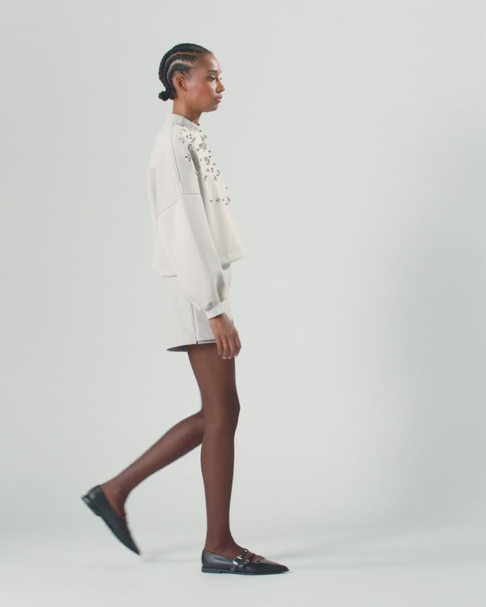Relaxed-fit crew-neck sweater with long balloon sleeves, made from technical neoprene fabric. The dropped shoulders and sporty, slightly oversized fit contrast with the sparkling crystal and sequin embroidery on the front—arranged to form stars—in an original way. This original piece will give your daytimes and outfits a healthy dose of radiant glow.