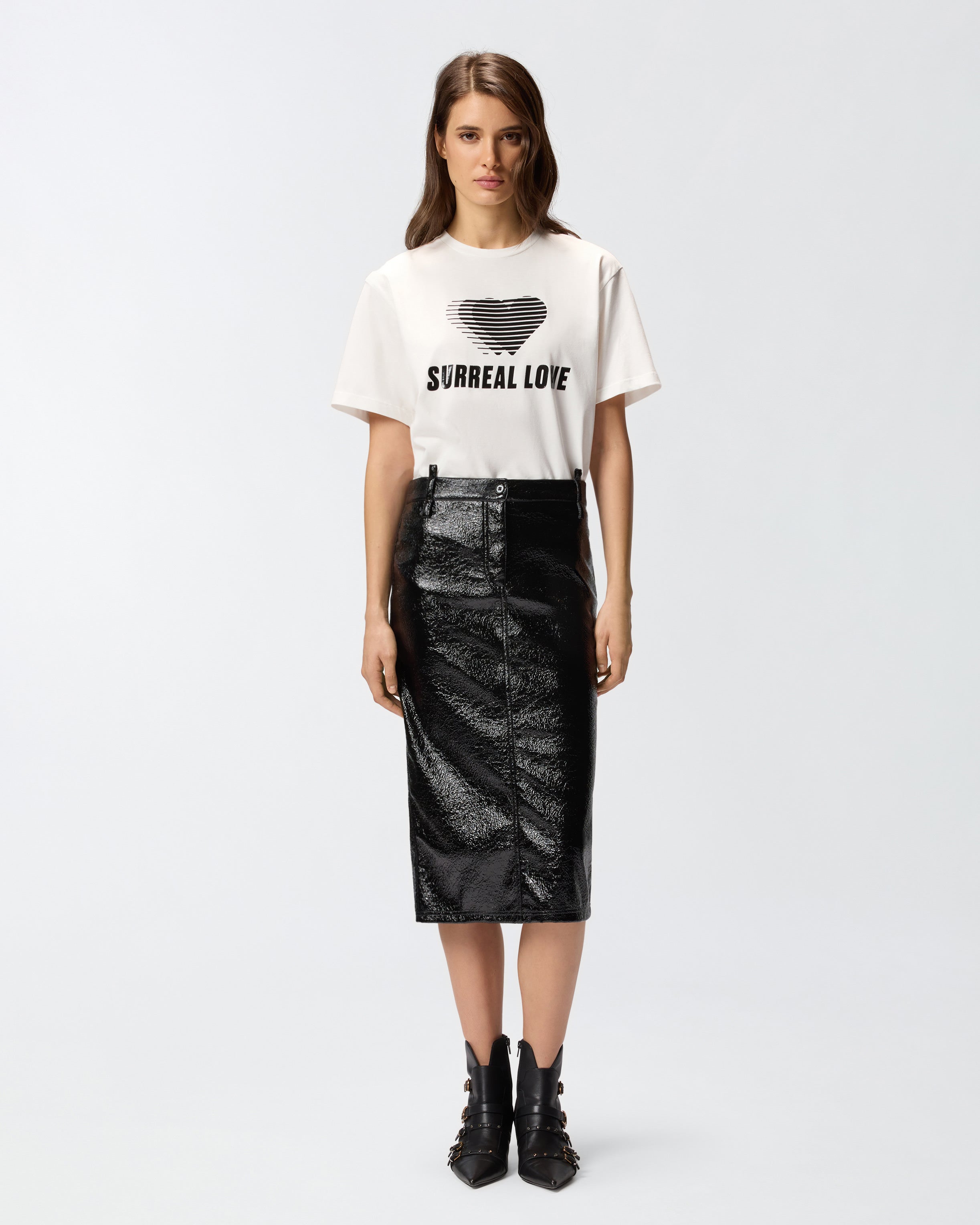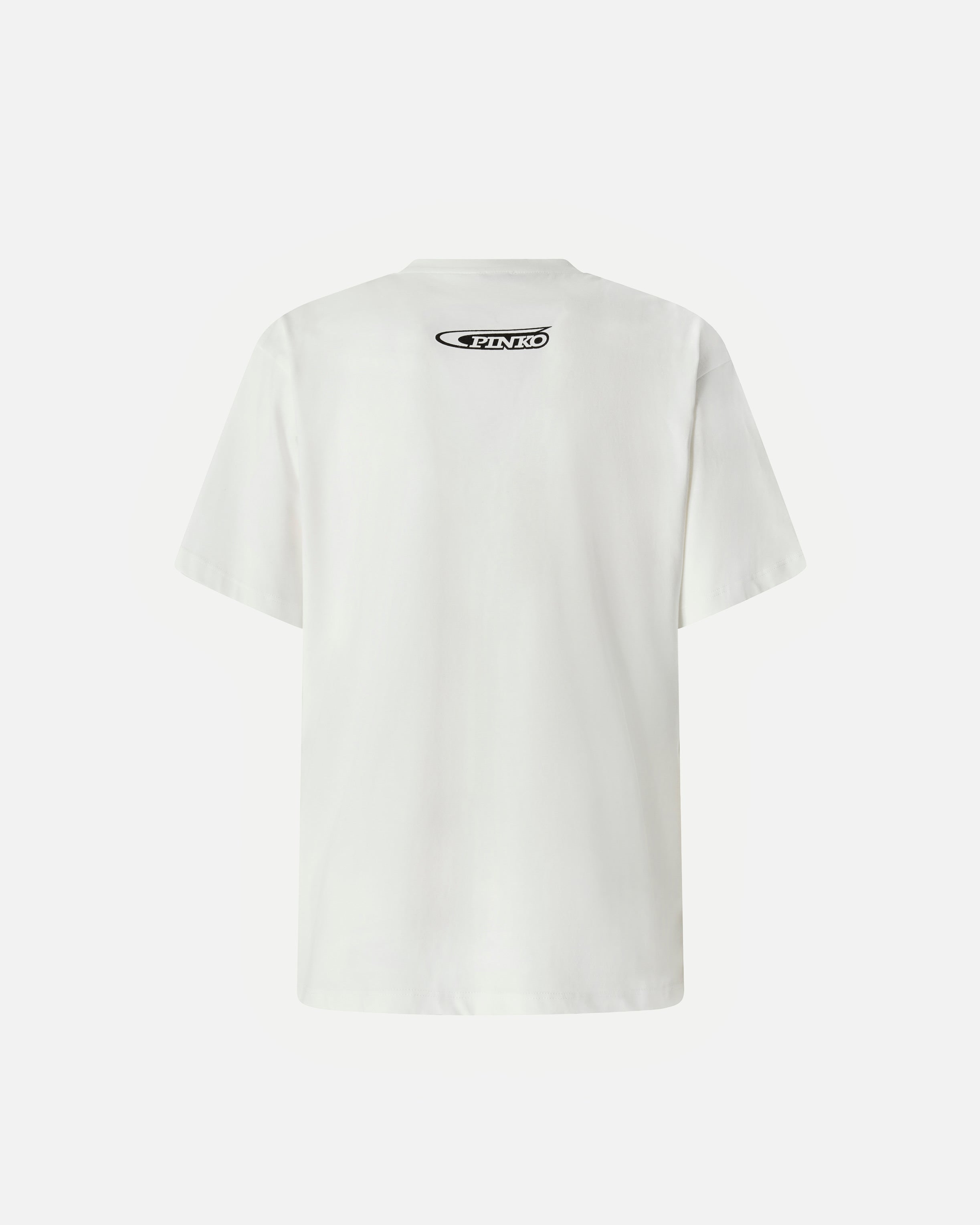 Cotton jersey crew-neck T-shirt with half sleeves. This piece is decorated with a contrasting front print with heart, PINKO lettering logo and the Surreal Love slogan. The brand logo also appears on the back, in the form of a small print under the neck. This T-shirt is perfect for giving everyday outfits a bold, personal twist.