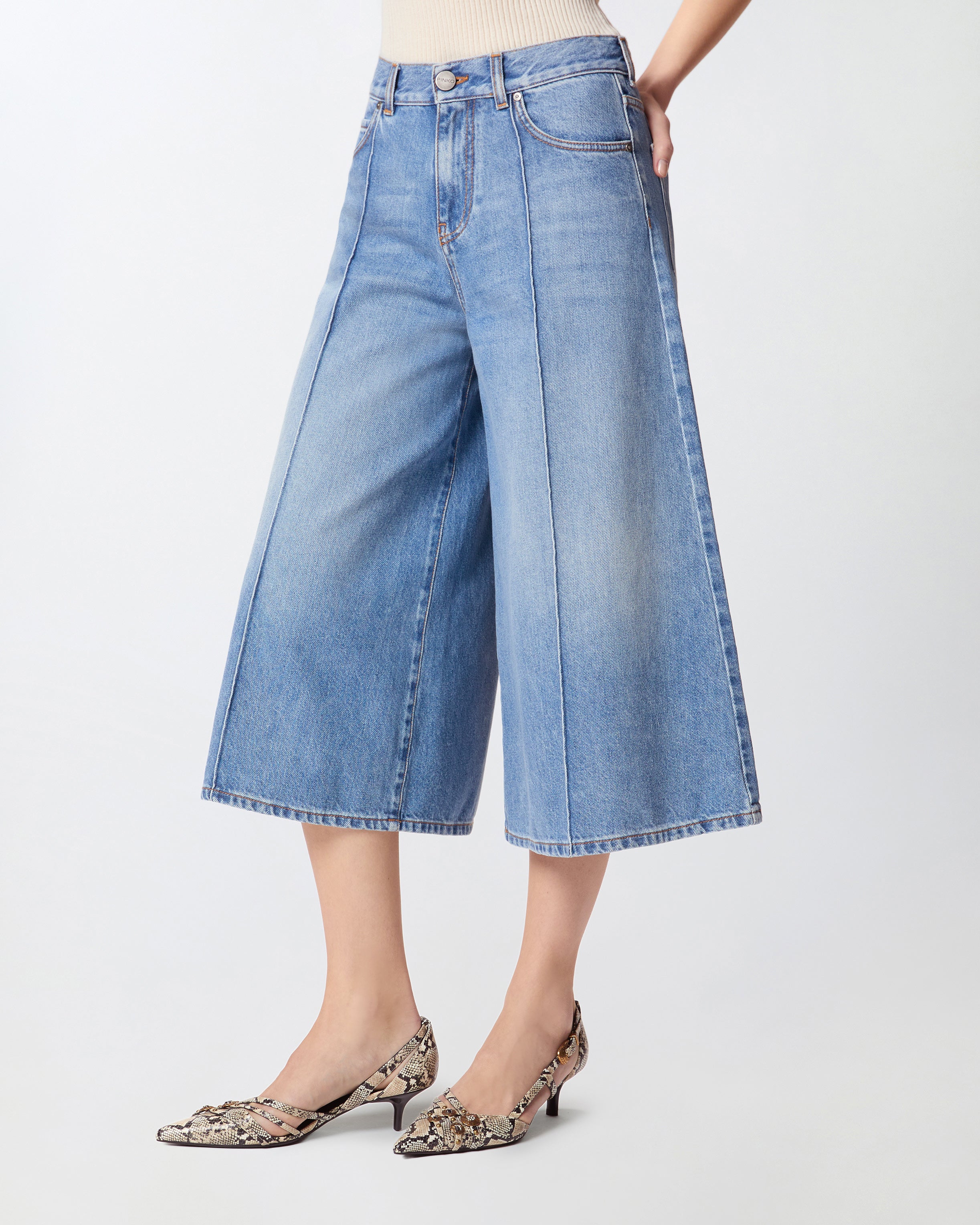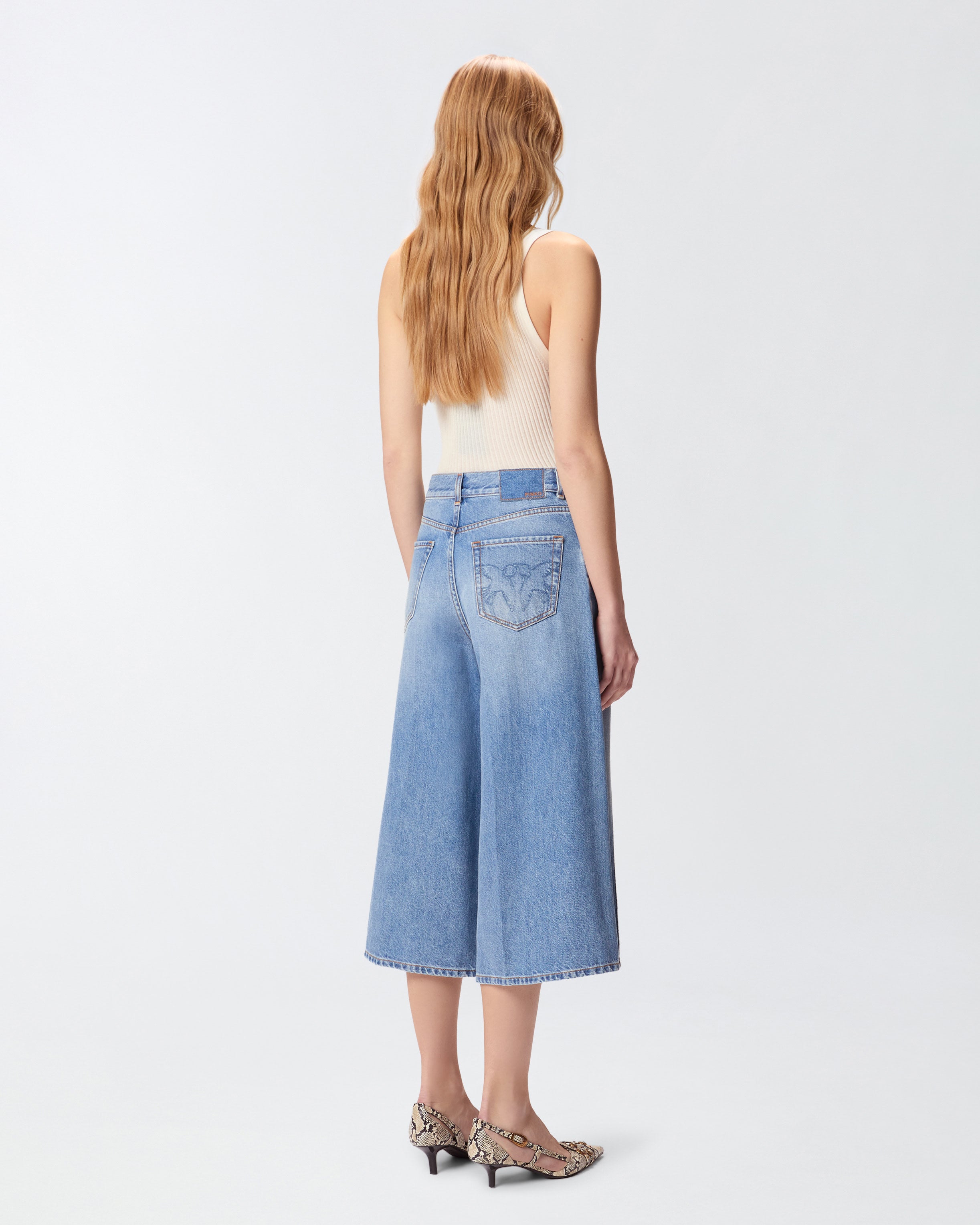 Five-pocket Bermuda shorts in soft cotton and lyocell denim with fading that creates a worn effect on the material and a central pleat down the legs. The brand's logo lettering embroidered on the back of the waistband and the Love Birds logo with embroidered birds on the right back pocket add pure PINKO style to the design.