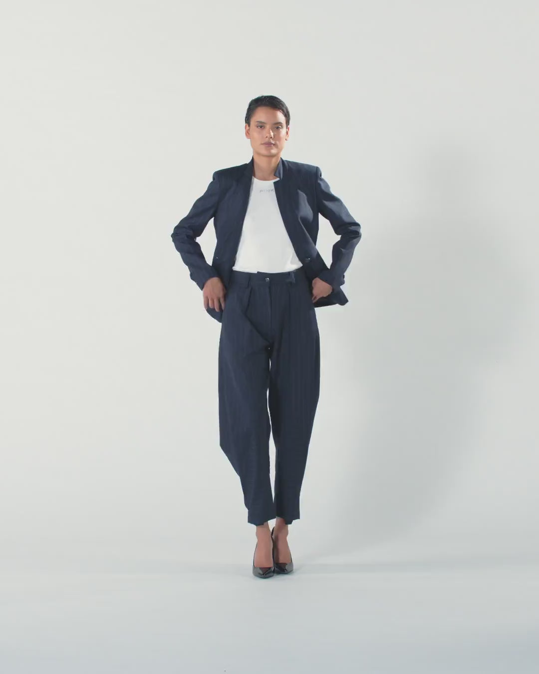 Balloon-fit trousers with a soft, rounded balloon leg at the top and narrower at the bottom, where there is also a strap to adjust the wear as needed. The fabric used is a classic poly wool pinstripe characterized by a change of texture and light to emphasize the design of the material. The tailored design of the garment is further highlighted by the pleats, the waist construction with belt loops and the welt pocket on the back. Concealed button and zip closure. Pair trousers with blazers in the same fabric for a suit effect, or wear a shirt for a formal, but not too formal look.