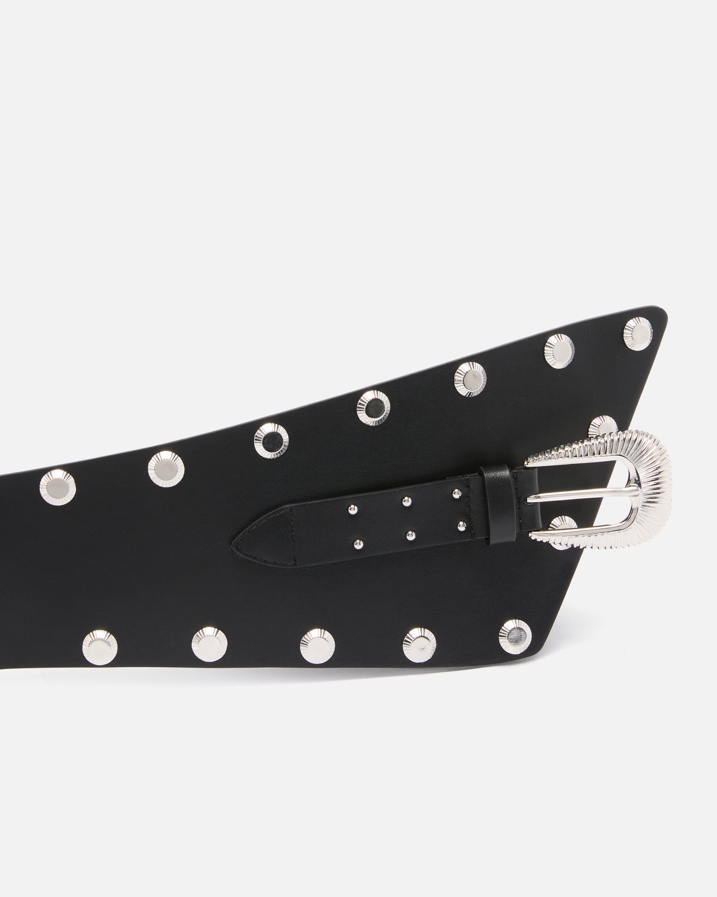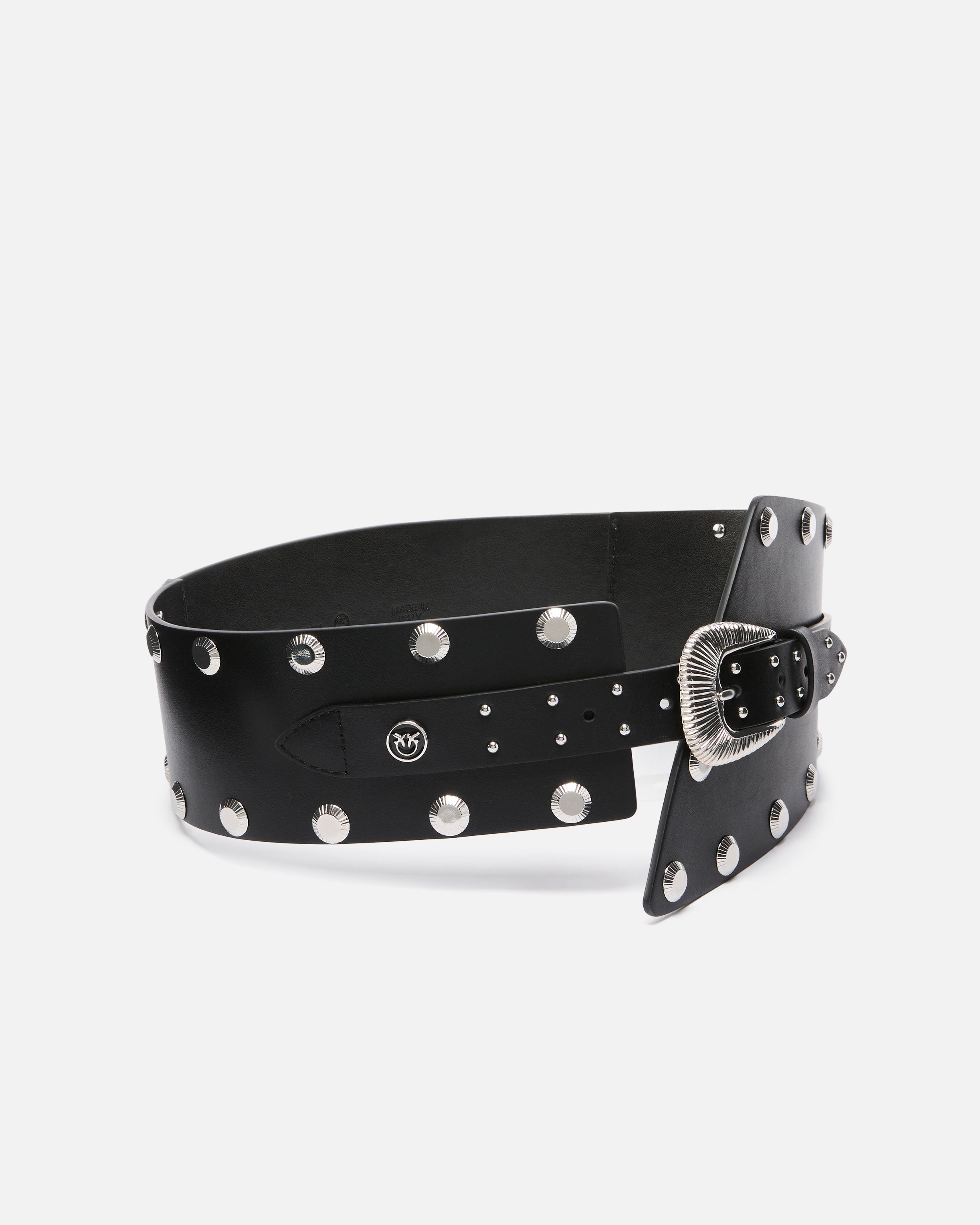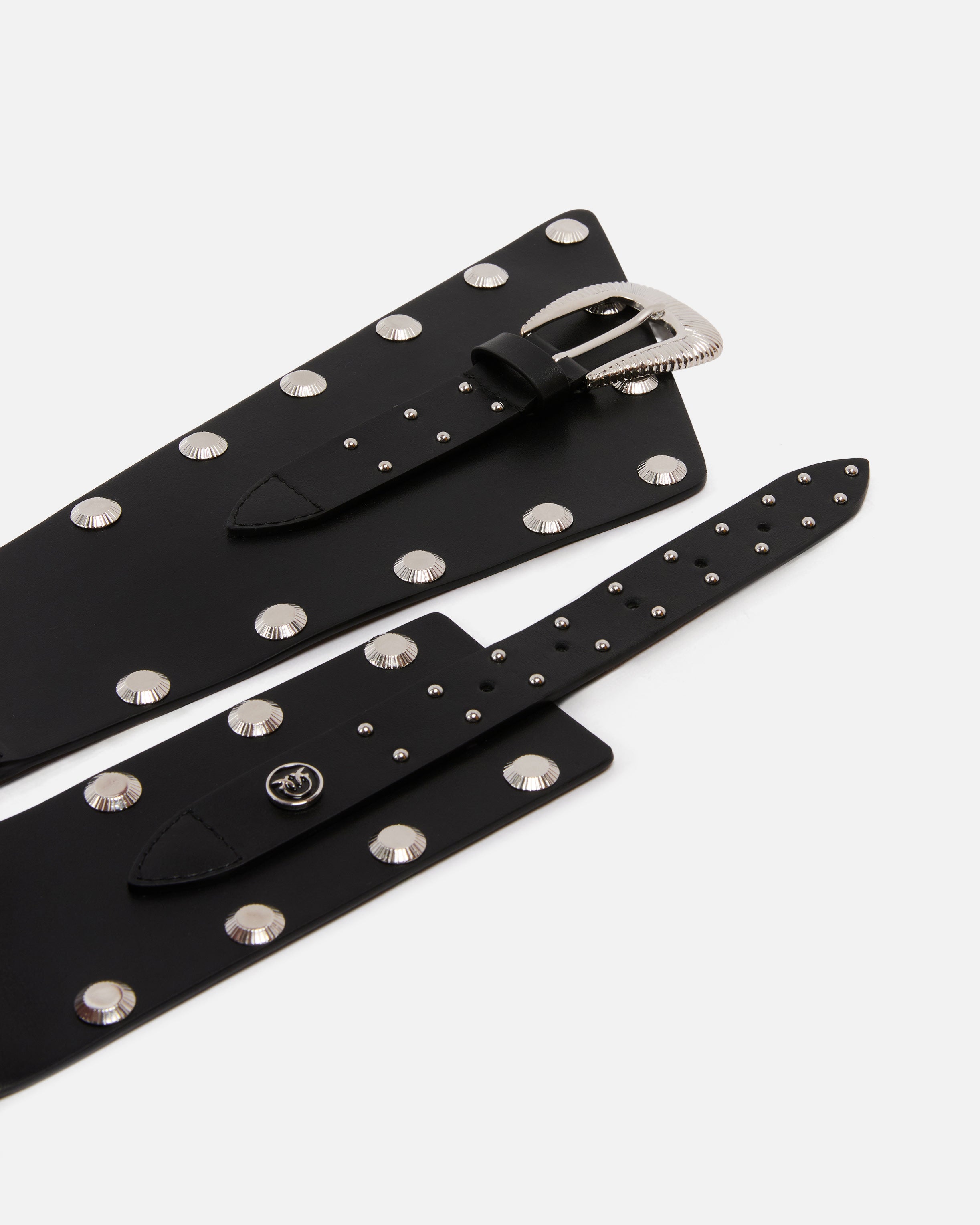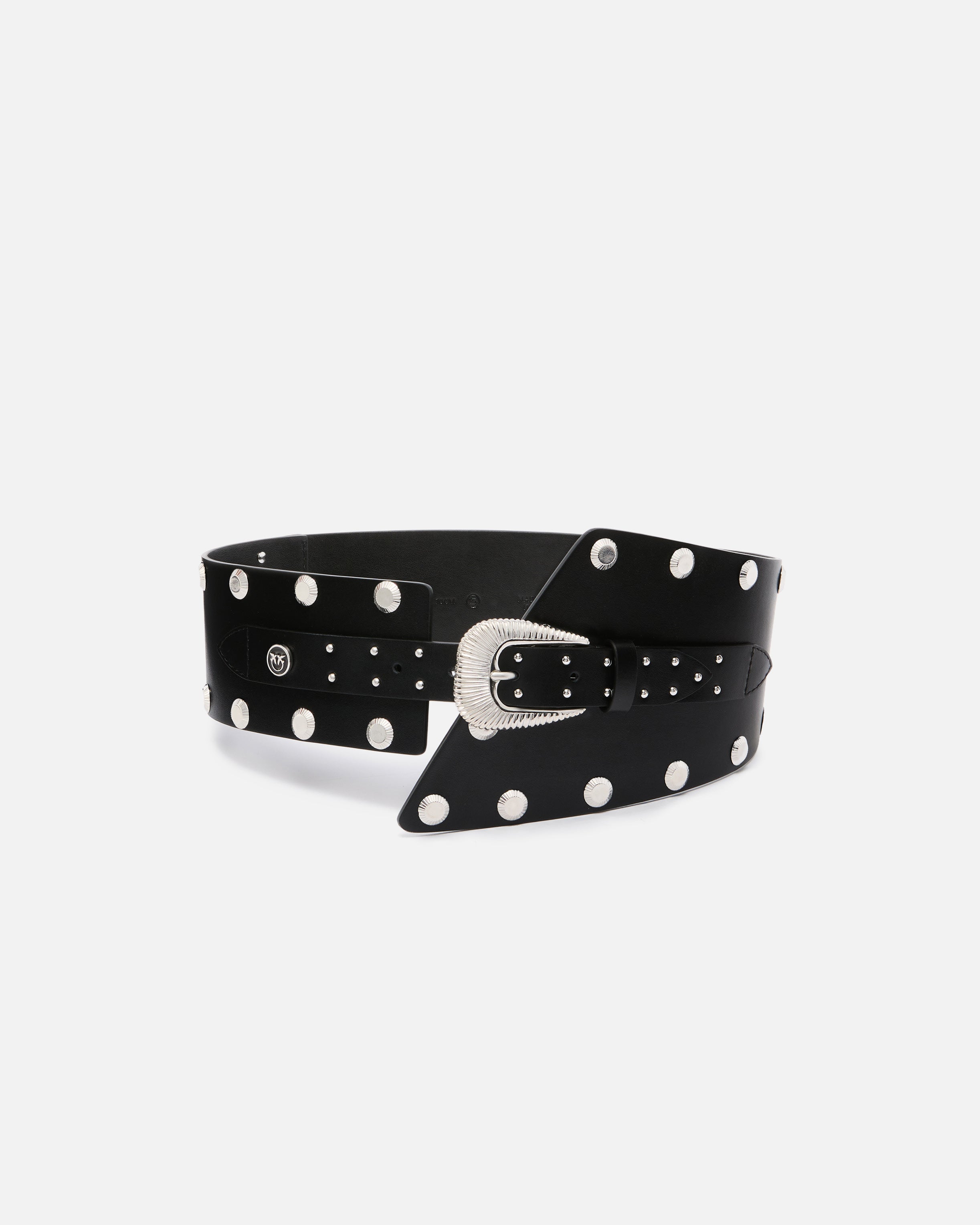 Soft leather belt with irregular design, featuring an extended 15 cm-high end. This belt, ideal for high-waisted wear, is enhanced by a row of bold studs along the edges and, at the ends, by a strap with appliqué featuring the Love Birds logo, small studs and buckle to fasten it. An accessory with a bold rock'n'roll edge to give your everyday outfits a boost of energy in that signature PINKO style. - BELT SASH+STUDS.HIGH