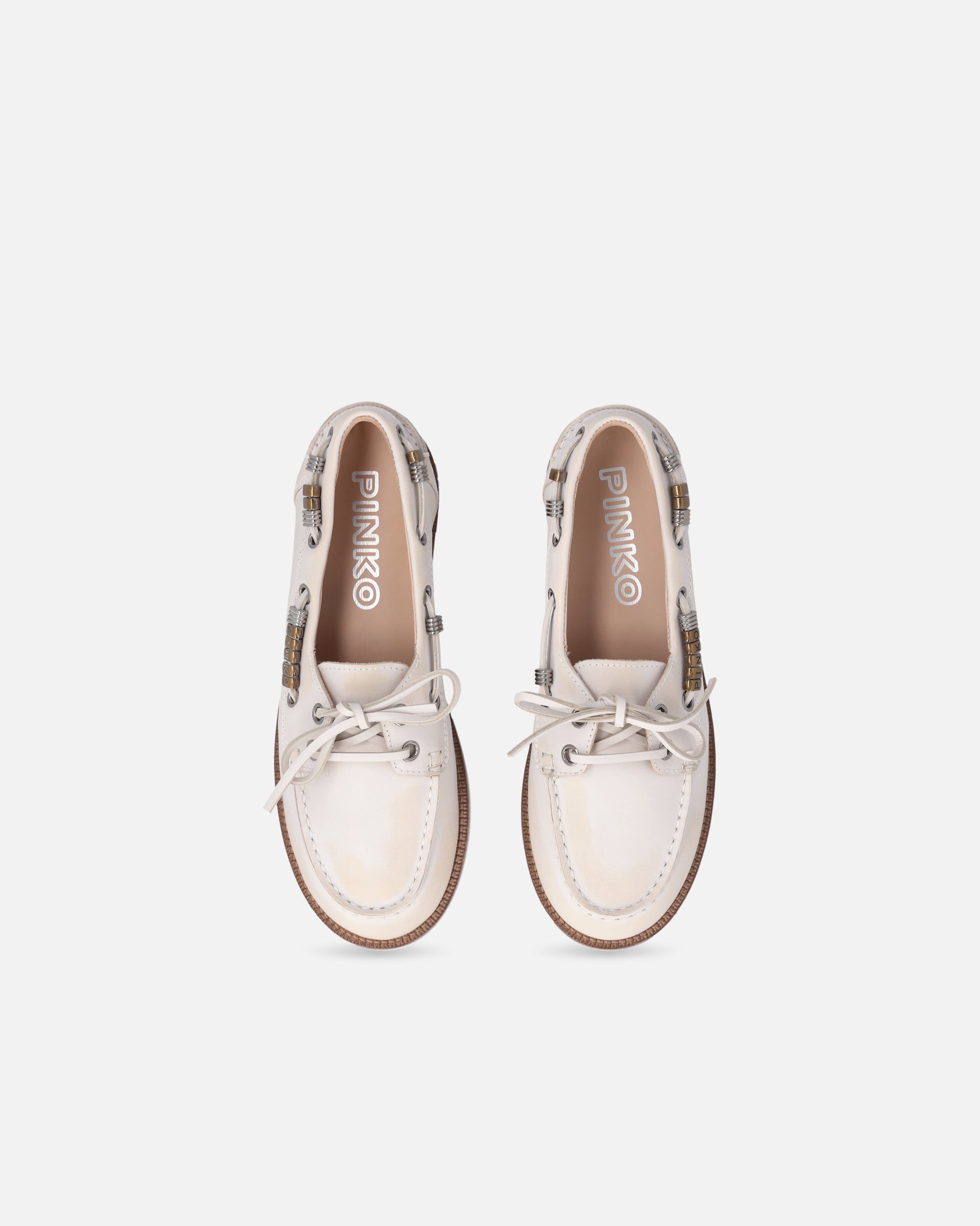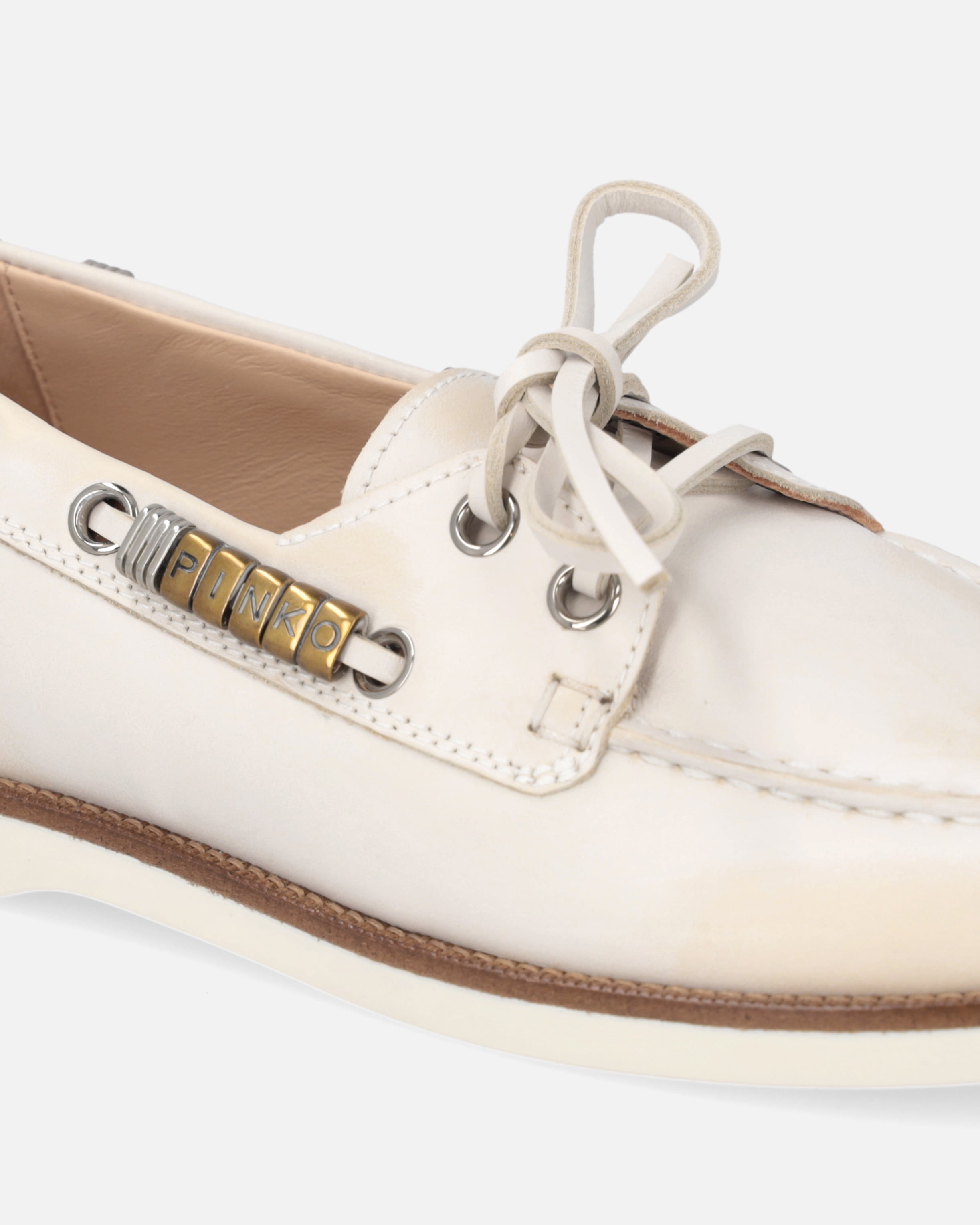 A reinterpretation of the boat shoe style with an urban and refined touch, these moccasins are made of Italian leather, synonymous with quality and tradition. The design is enhanced by pinched detailing on the vamp, an artisanal technique that highlights the hand-stitching and gives the shoe an authentic, distinctive look. Metallic details on the side laces, including gold rings forming the PINKO logo lettering, add shine and character, while the crepe-effect rubber sole ensures comfort and flexibility. The model you were looking for to complete your everyday outfits with a casual and contemporary elegance.
