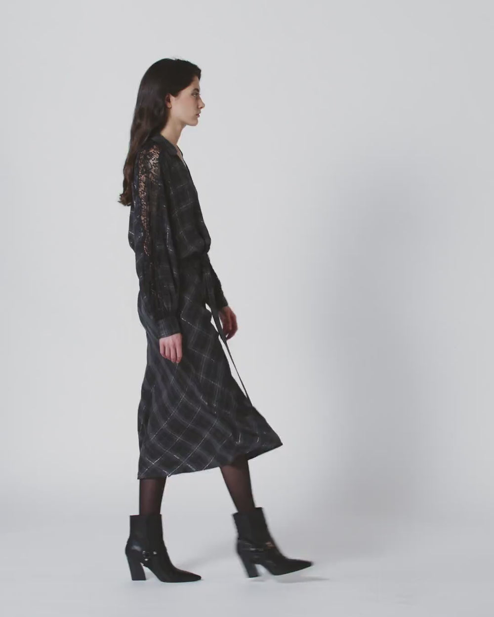 Relaxed-fit, long-sleeved long dress in warm, enveloping fabric that adapts to the wearer's body shape, featuring a shirt-style collar that opens into a V-neckline and a crossover button placket. This dress, featuring a matching belt at the waist, is embellished with a metallic-thread check motif and sophisticated scalloped lace inserts inlaid on the sleeves. Elevate your off-duty looks in the right way with this flowing, versatile garment.