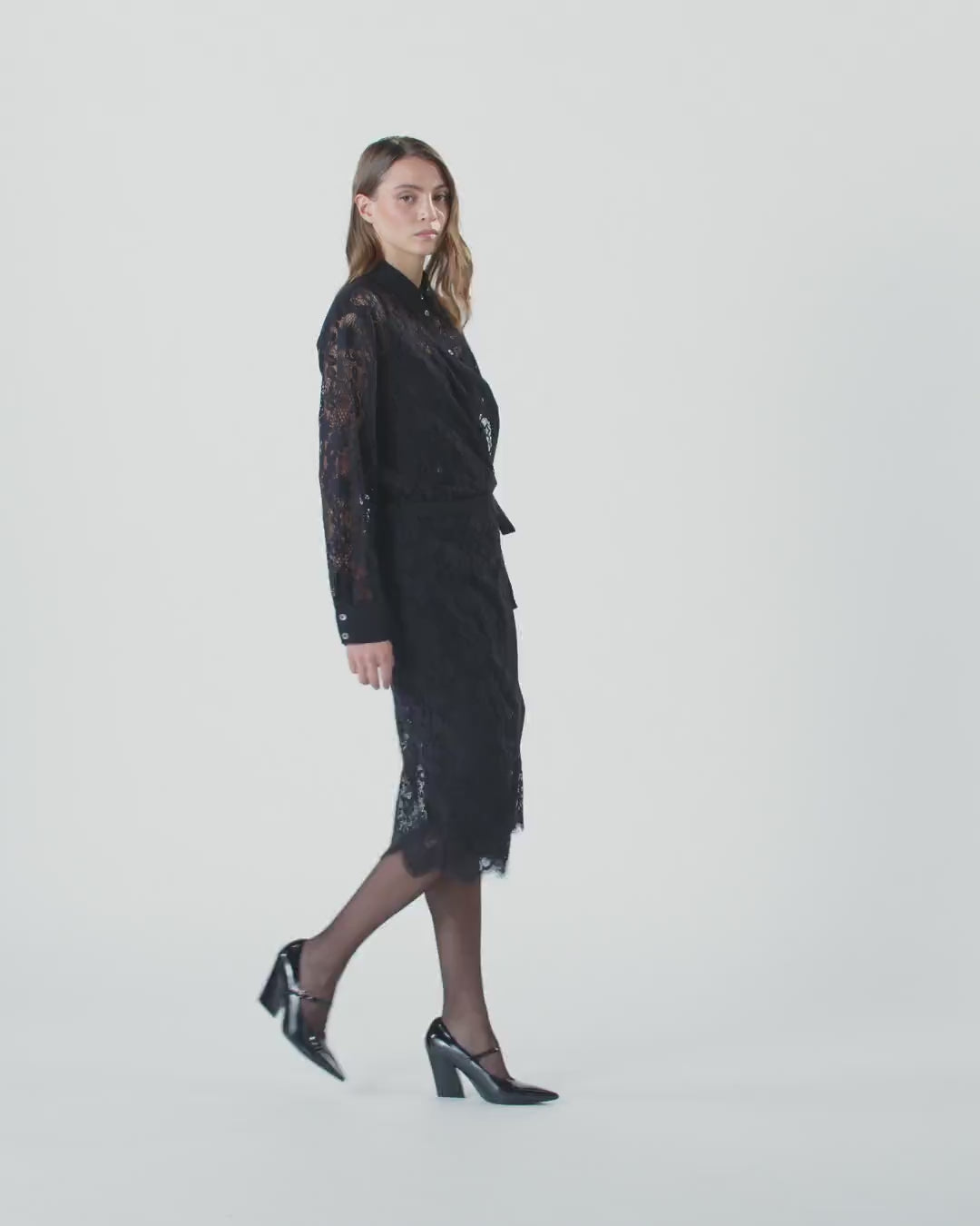 Long shirt dress with fitted waist, shirt collar and long balloon sleeves with buttons at the end. Finished with plain-coloured fabric edging, this piece is made from refined rebrodé lace that allows you to experiment with sheer effects and delicately drops with fringing at the bottom. The dress is complete with a small matching-fabric belt to tie at the waist, allowing you to personalise the fit and style.