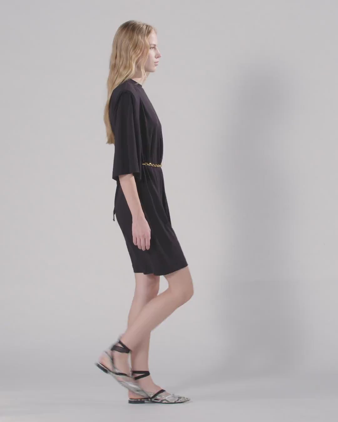 Round-neck mini dress with wide three-quarter sleeves, made of stretch crepe jersey with a shiny silk-like appearance. This garment features a straight, soft silhouette, made bolder by the structured internal straps, and is complete with a removable waistband with a fabric front, to be tied as you wish, and a chain back, for an edgy detail that expresses the PINKO DNA. This dress is ideal for a feminine daytime look with a pair of low shoes or a special-evening outfit with a pair of pumps. - ALLIE DRESS