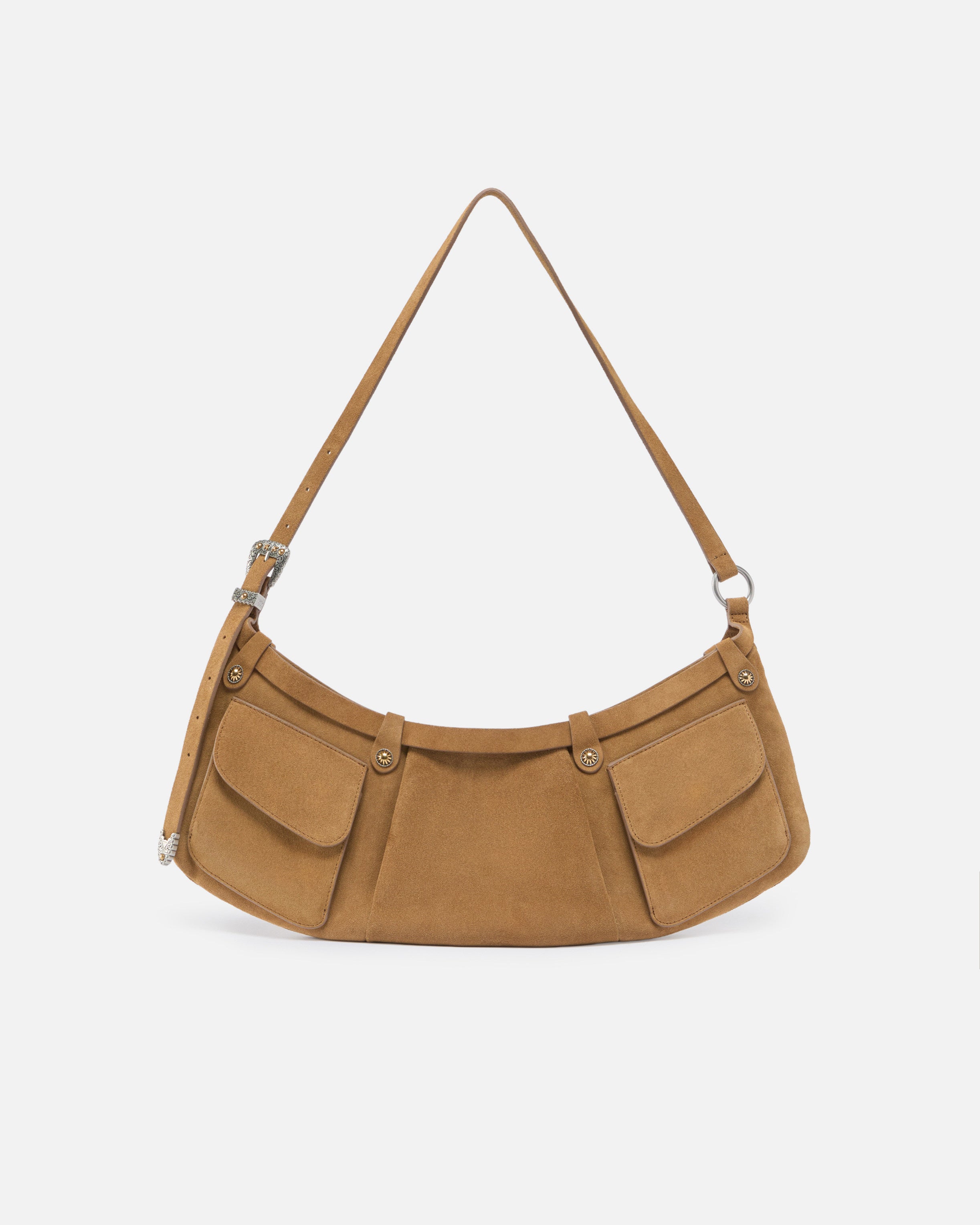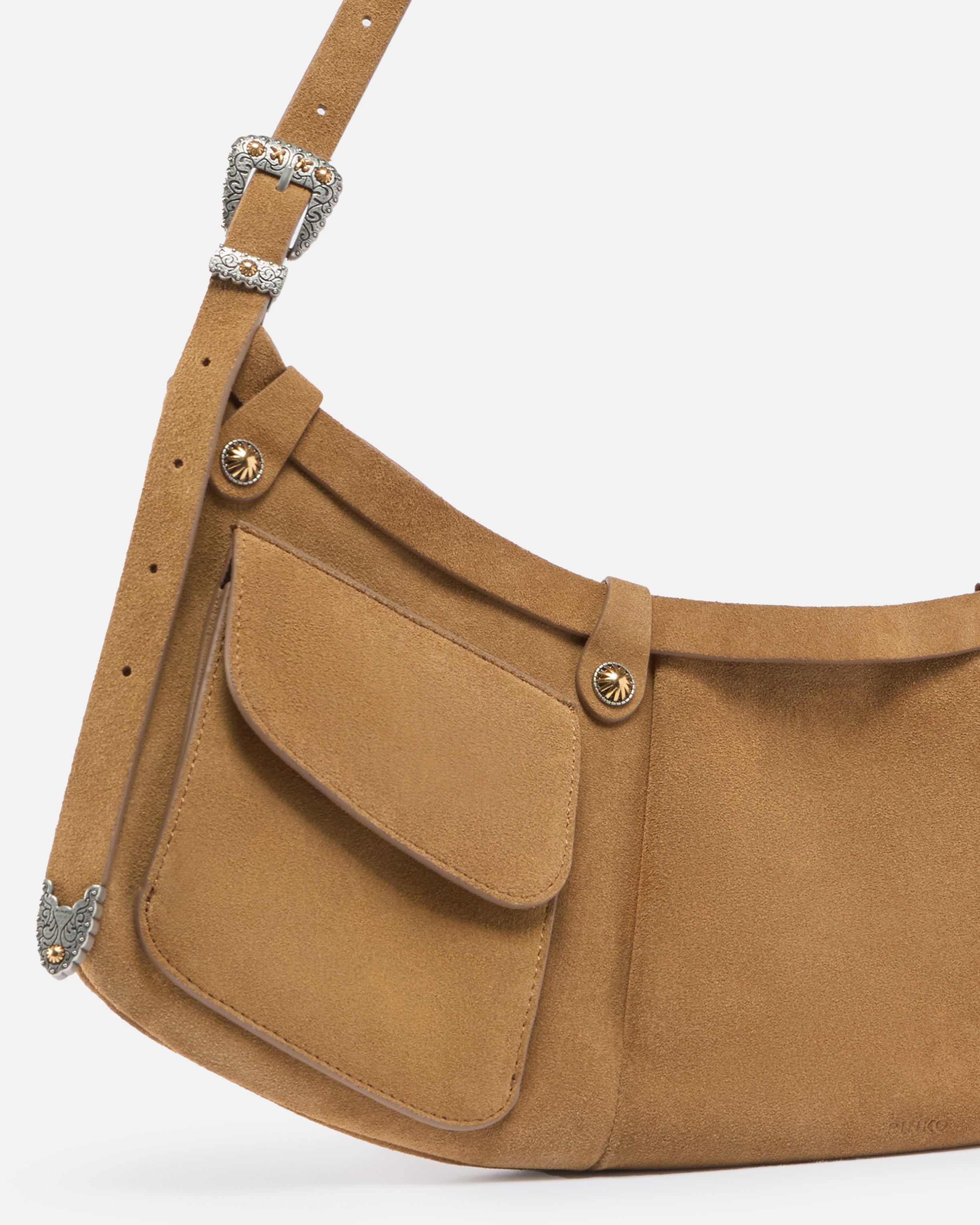 Pocket Body Bag large bag in soft suede with a flat design, featuring an arched, elongated hobo-inspired shape. The bag, featuring an adjustable suede shoulder strap to be worn over the shoulder or crossbody, stands out for its two front flap pockets and details that are a nod to Texan style: the tip, buckle, and loop are enhanced with intricate detailing inspired by traditional Country wear. The zip fastening opens to reveal an interior lined in cotton drill, with a slip pocket with zip and a branded tag. Activate your PINKO bag: verify the authenticity of your product and access a personalised experience by scanning the Love Birds embroidery on the back of the bag with your smartphone!