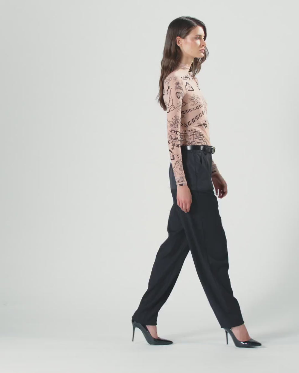 This tulle sweater features a slim-fit line with long sleeves and a mock polo-neck. The run-resistant mesh is a very durable fabric that has undergone special treatment to prevent the stitching from unravelling when torn. The placed print that adorns the piece, on the other hand, is inspired by the sailing world and attests to PINKO's skill with different fabrics and complex manufacturing techniques. Make any outfit extra elegant and feminine with this top, which is perfect to wear under a jacket, paired with either tailored trousers or even a pair of special jeans.