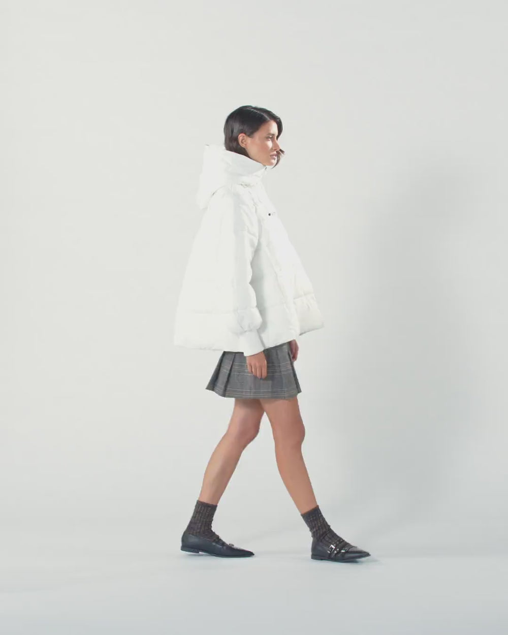 Short, padded and slightly bell-shaped down jacket in technical canvas. The style stands out for its sportier look, provided by the matte finish of the fabric, and for its functional elements, such as the pockets with invisible zip, the rib knit on the high collar and cuffs, and the large adjustable hood with a trekking-inspired drawstring equipped with a peak to protect you from the rain. The patch with rubber-effect Love Birds logo on the front left side customises this piece of outerwear in pure PINKO style. Two-way metal zip fastening on the front. Lined model.
