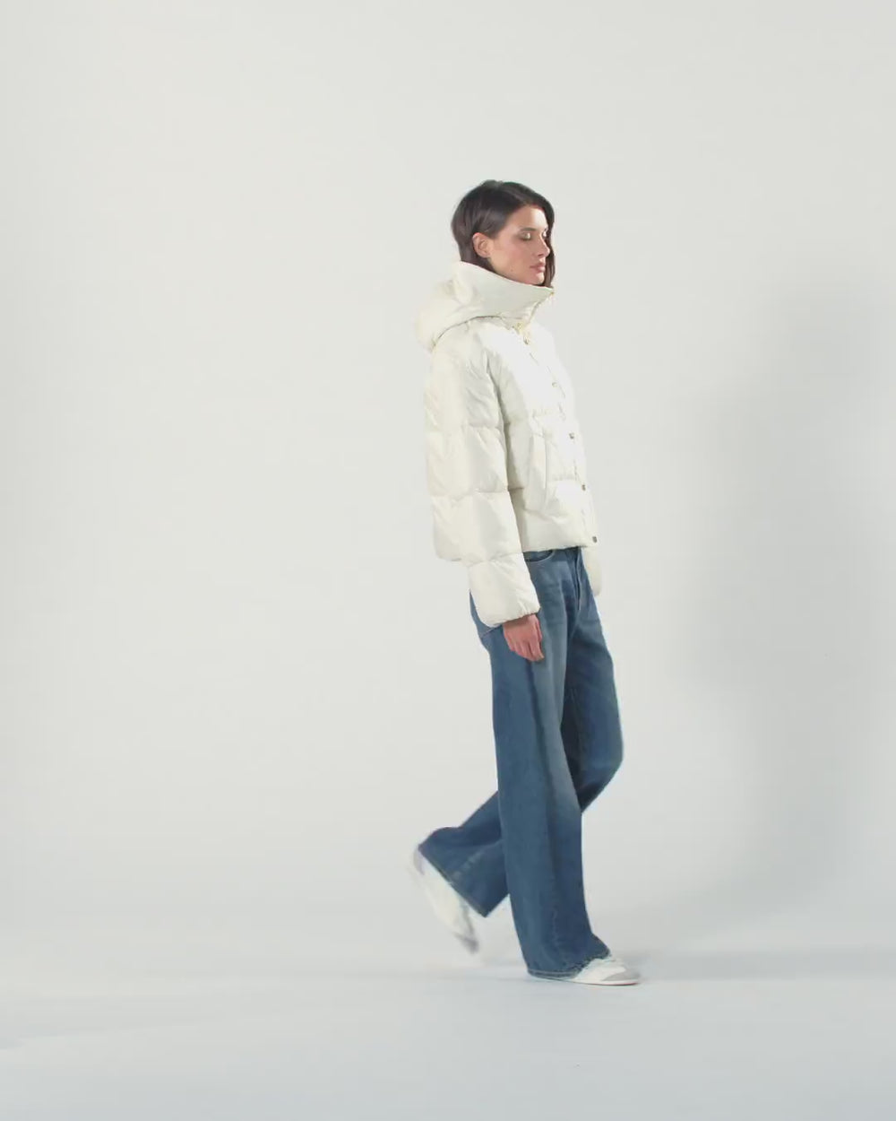 Down jacket in padded technical fabric with special semi-glossy finish. The style features a large cosy hood with an adjustable drawstring and comfortable vertical welt pockets. Metal press-stud fastening. The cropped cut of the puffer jacket makes it the perfect everyday outerwear to tackle the first cold days of the season.