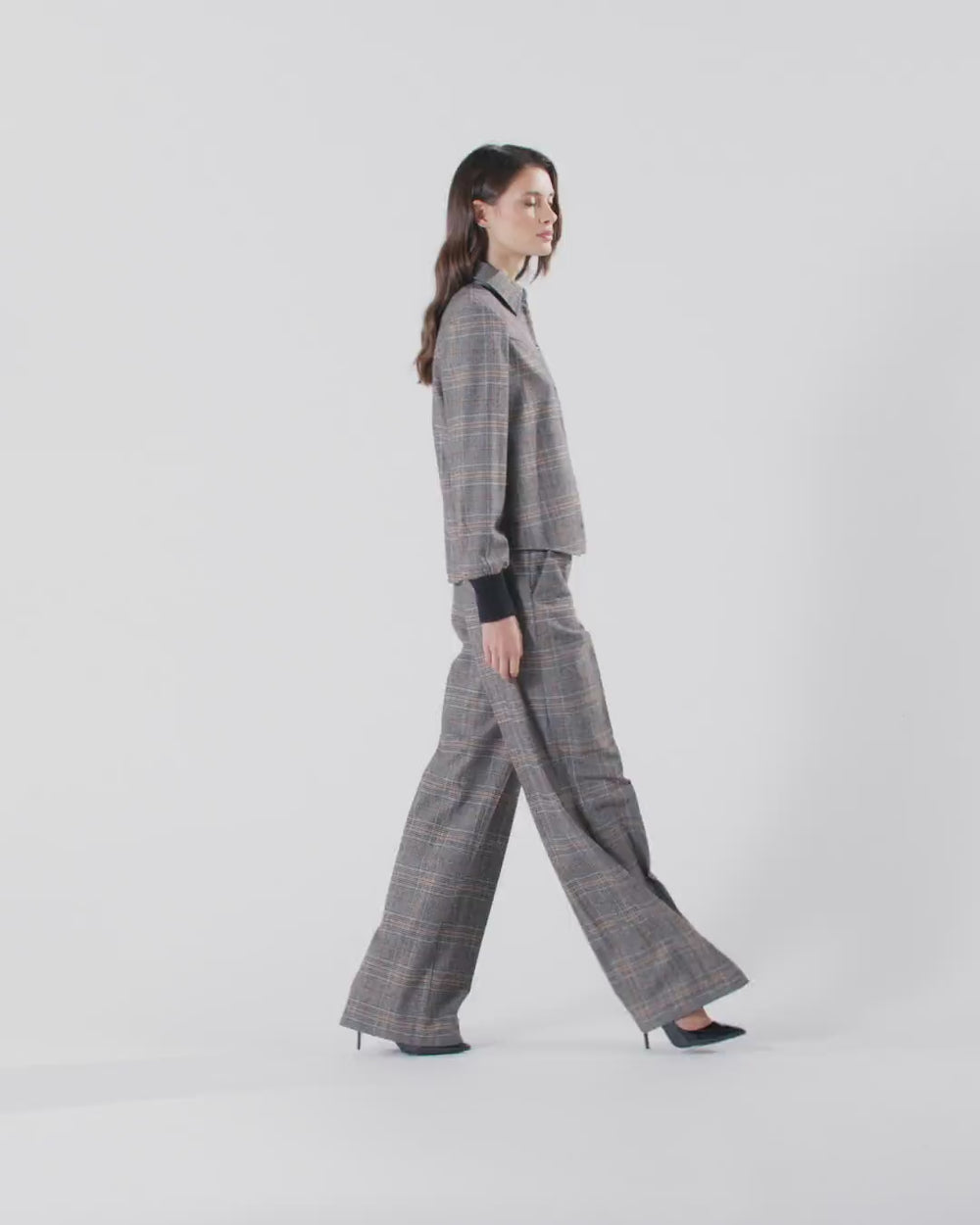 Long-sleeved shirt with structured shoulders, classic collar, front button placket, and front and rear yoke detail. Made from yarn-dyed wool-blend fabric with a Prince of Wales-inspired check motif, this piece is totally original, as demonstrated by the ribbed knit cuffs that provide interesting colour and fabric contrast. Give your office looks a twist with this innovative reimagining, brimming with that signature PINKO style.