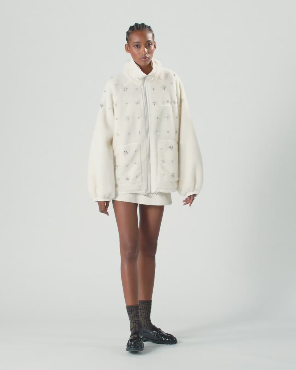 Oversized bomber jacket with high neck and balloon sleeves, made from soft and warm teddy-effect fleece. This garment combines style and functionality with its large front pockets, full-length zip fastening and drawstring at the bottom, while the sparkling crystal and sequin embroidery adorning the front and part of the back—arranged to form stars—provides original contrast against the otherwise sporty design.