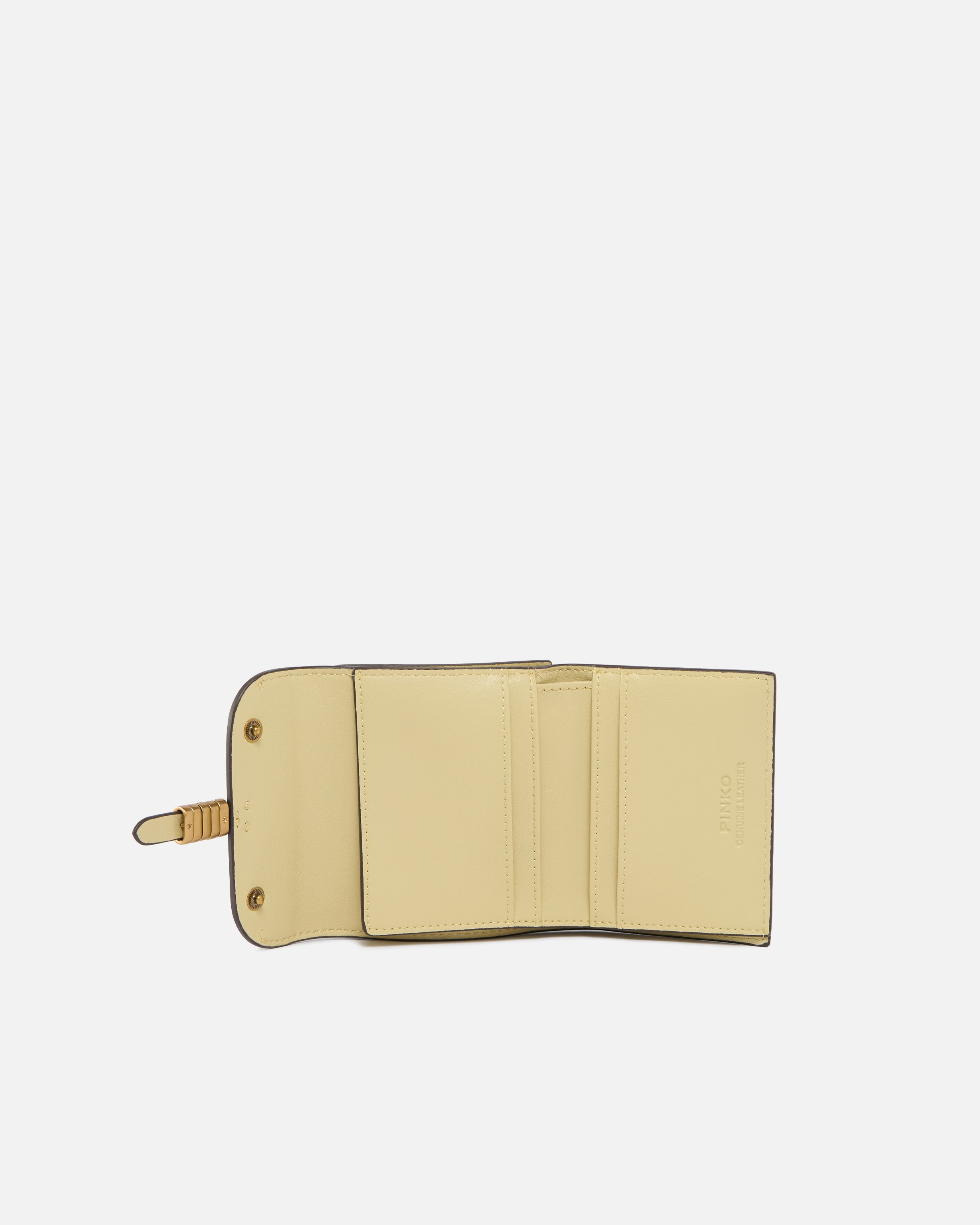 Compact wallet in soft leather with a square shape. This style, equipped with wall pockets on the back and various internal compartments, pays tribute to the inimitable style of the brand through elegant metal rings that form the PINKO lettering logo and complete the flap fastening. Activate your PINKO accessory: verify the authenticity of your product and access a personalised experience by scanning the Love Birds embroidery on the back with your smartphone! - SADDLE WALLET