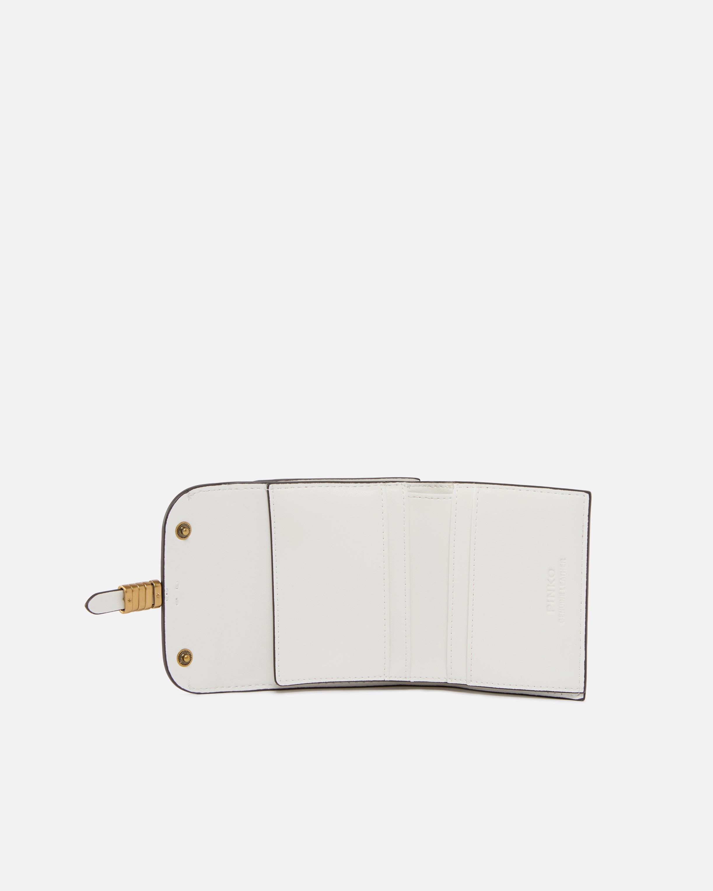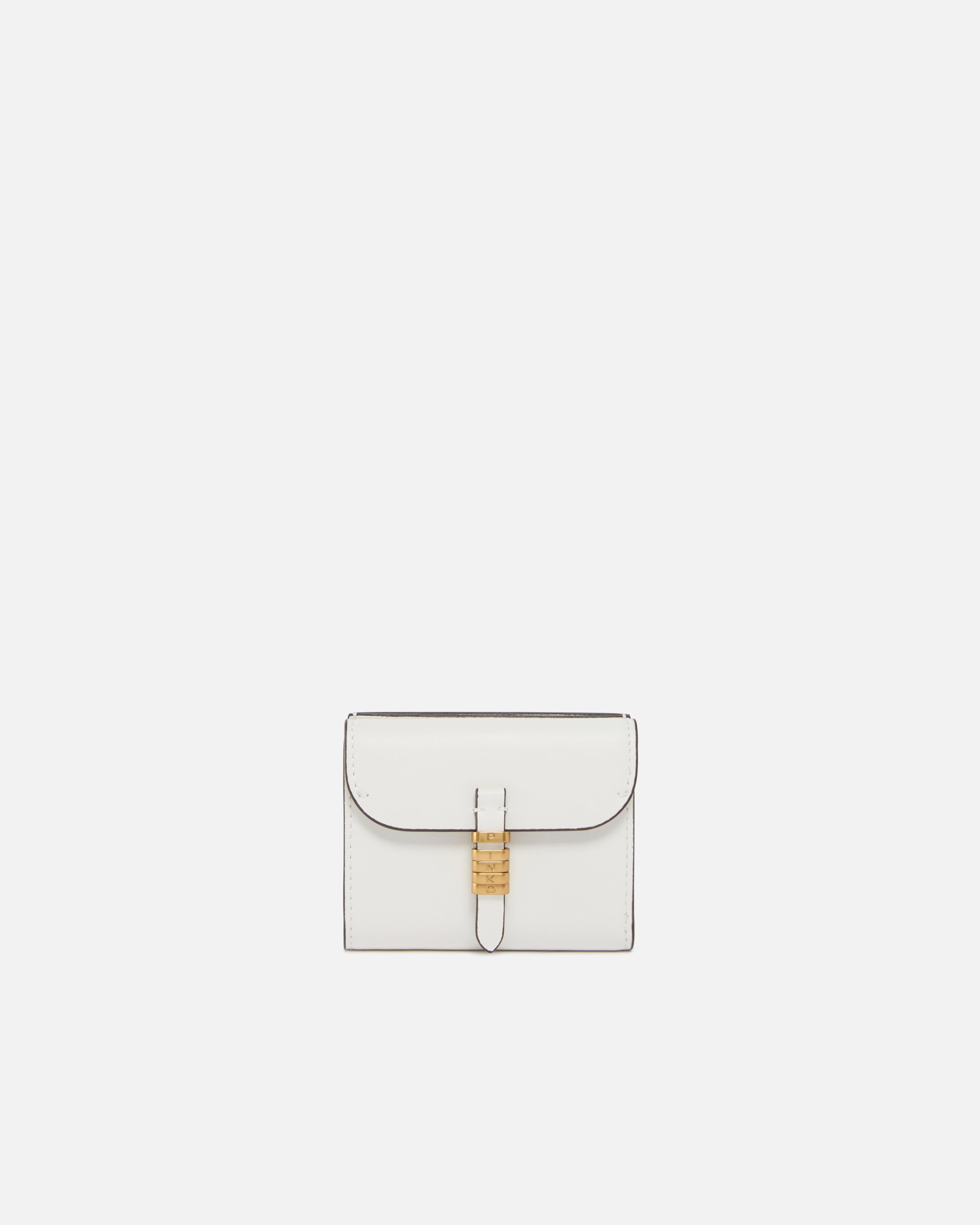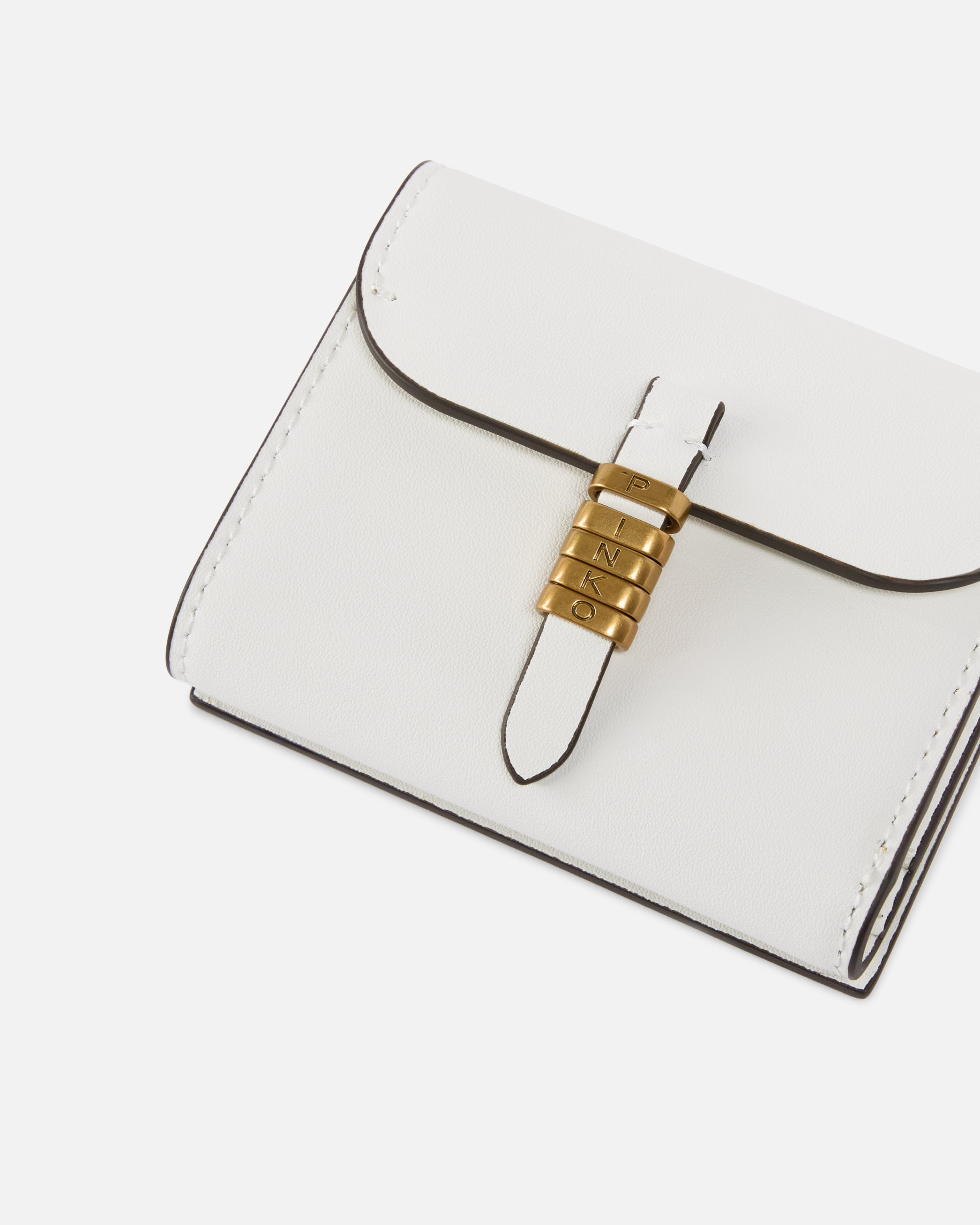 Compact wallet in soft leather with a square shape. This style, equipped with wall pockets on the back and various internal compartments, pays tribute to the inimitable style of the brand through elegant metal rings that form the PINKO lettering logo and complete the flap fastening. Activate your PINKO accessory: verify the authenticity of your product and access a personalised experience by scanning the Love Birds embroidery on the back with your smartphone! - SADDLE WALLET