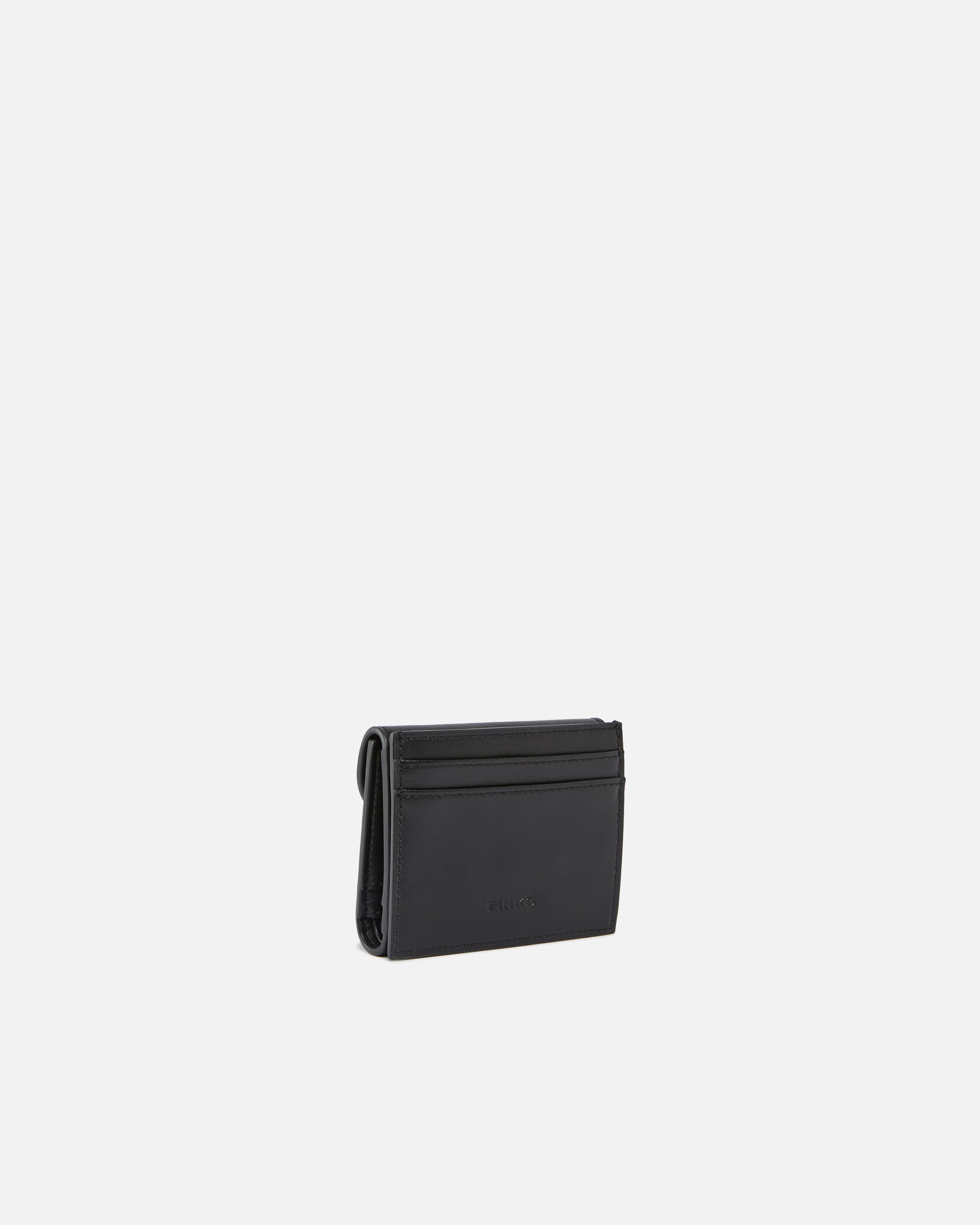 Compact wallet in soft leather with a square shape. This style, equipped with wall pockets on the back and various internal compartments, pays tribute to the inimitable style of the brand through elegant metal rings that form the PINKO lettering logo and complete the flap fastening. Activate your PINKO accessory: verify the authenticity of your product and access a personalised experience by scanning the Love Birds embroidery on the back with your smartphone! - SADDLE WALLET