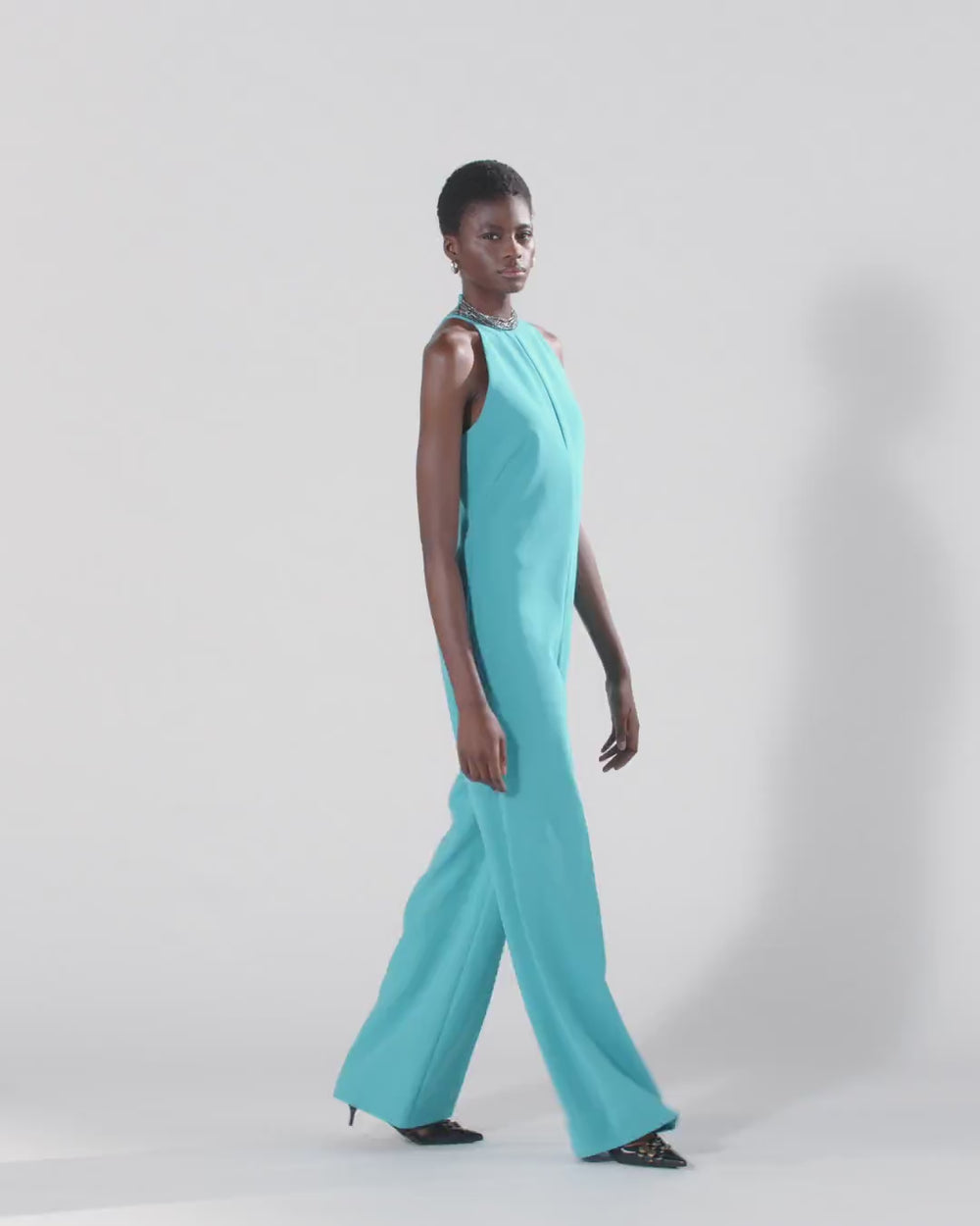 Straight-cut playsuit with long trousers made of a technical canvas fabric with a compact and contemporary look and lined in lightweight georgette for a more comfortable fit. This model stands out for its sleeveless upper with a refined halterneck, embellished with a thin vertical cut-out on the front and a jewel detail with rhinestones, also on the front, recreating a multi-strand choker necklace. This elegant jumpsuit is fastened with an invisible zip in the middle at the back to keep the look as clean as possible, making it perfect for both ceremonies and special evenings with a formal dress code. - DRAGON FRUIT JUMPSUIT