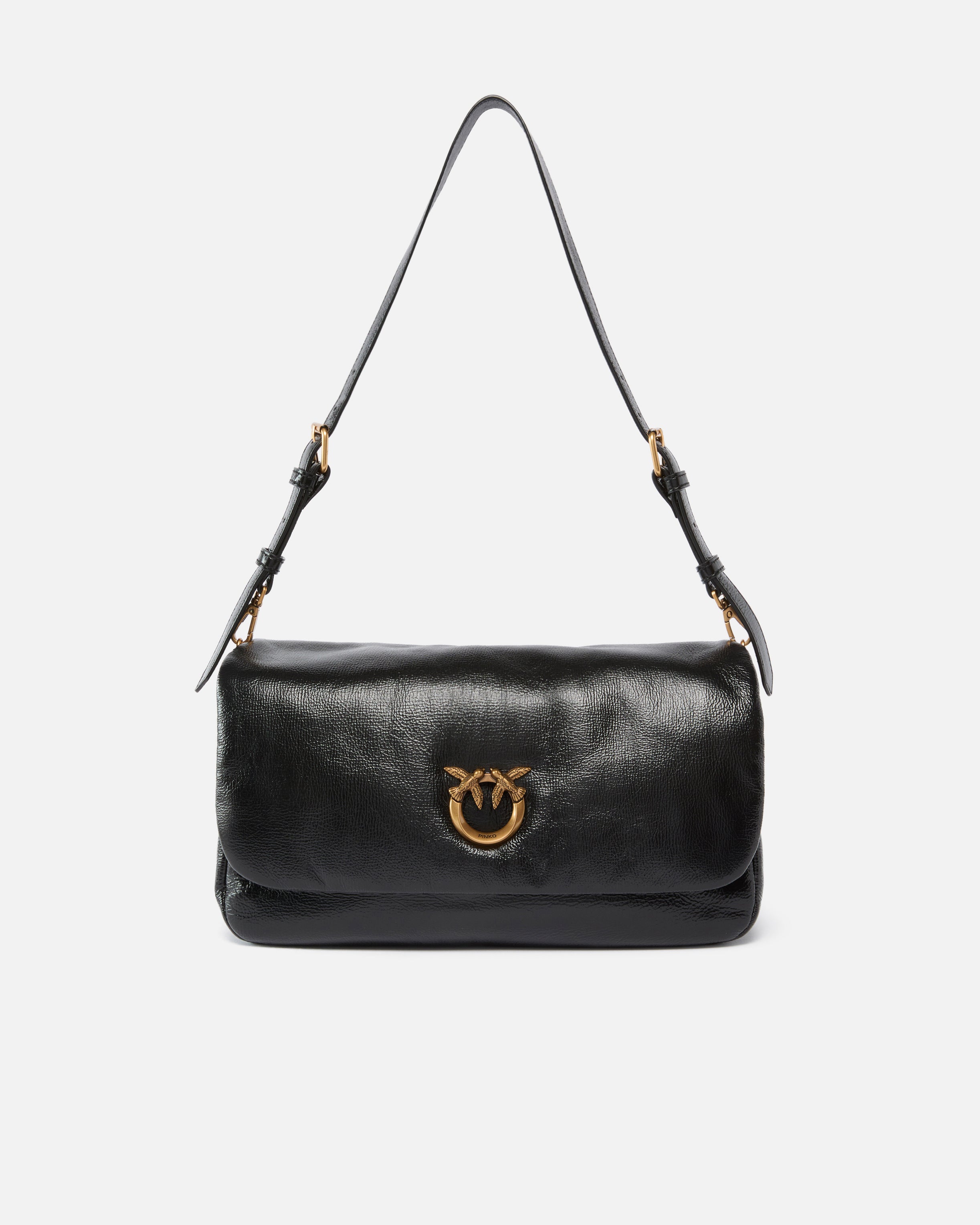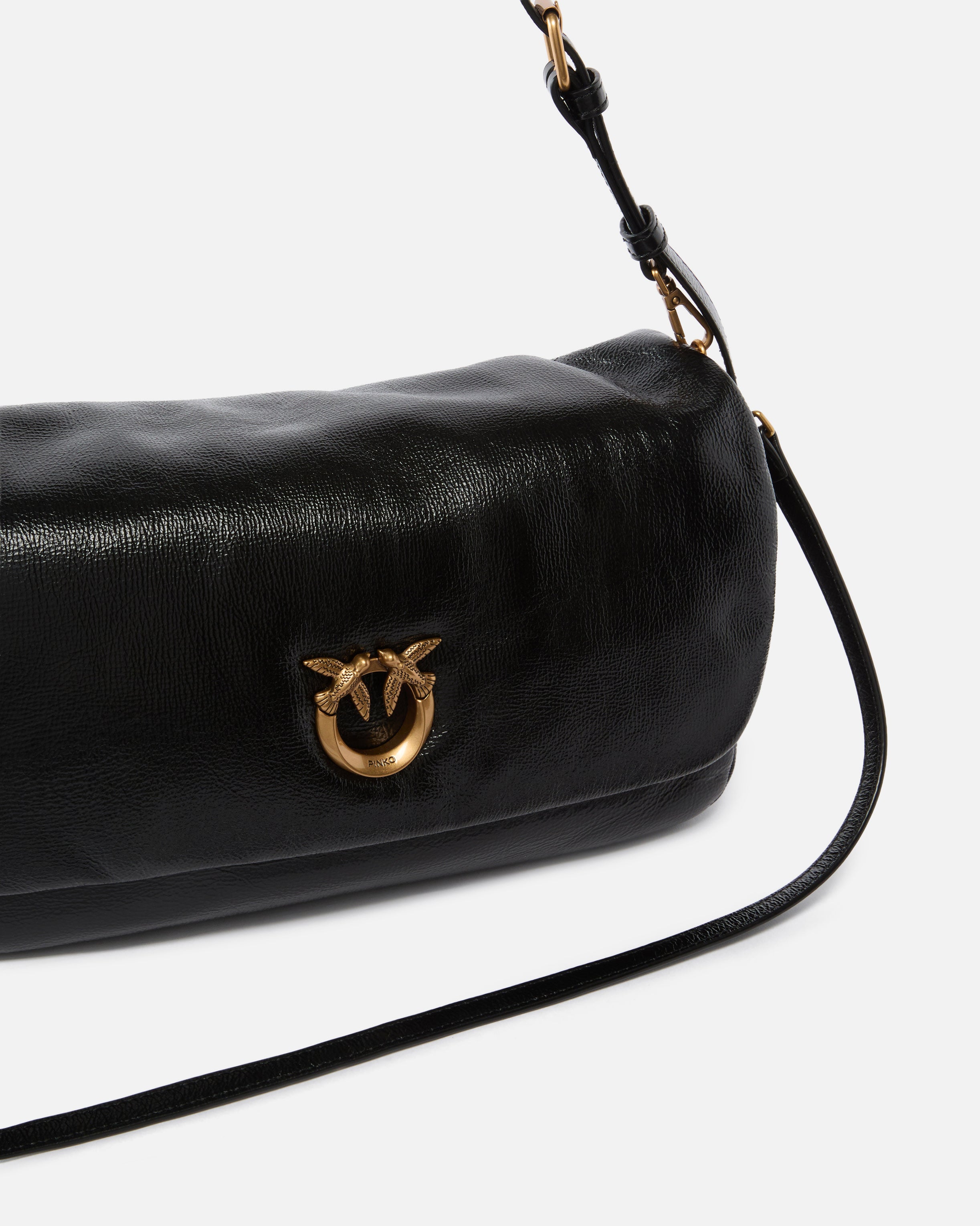 Love Bag Click Soft Horizontal Handle medium-sized bag in vintage-effect shiny leather with elongated rectangular shape. The bag, customised with the iconic Love Birds Diamond Cut metal logo on the front, can be worn crossbody or on the shoulder thanks to the two adjustable and removable leather shoulder straps—one shorter and one longer. Fastened with two inner magnetic buttons, the cotton drill-lined interior features a zipped central divider pocket and zipped slip pocket with logo-branded tag. Activate your PINKO bag: verify the authenticity of your product and access a personalised experience by scanning the Love Birds embroidery on the back of the bag with your smartphone!