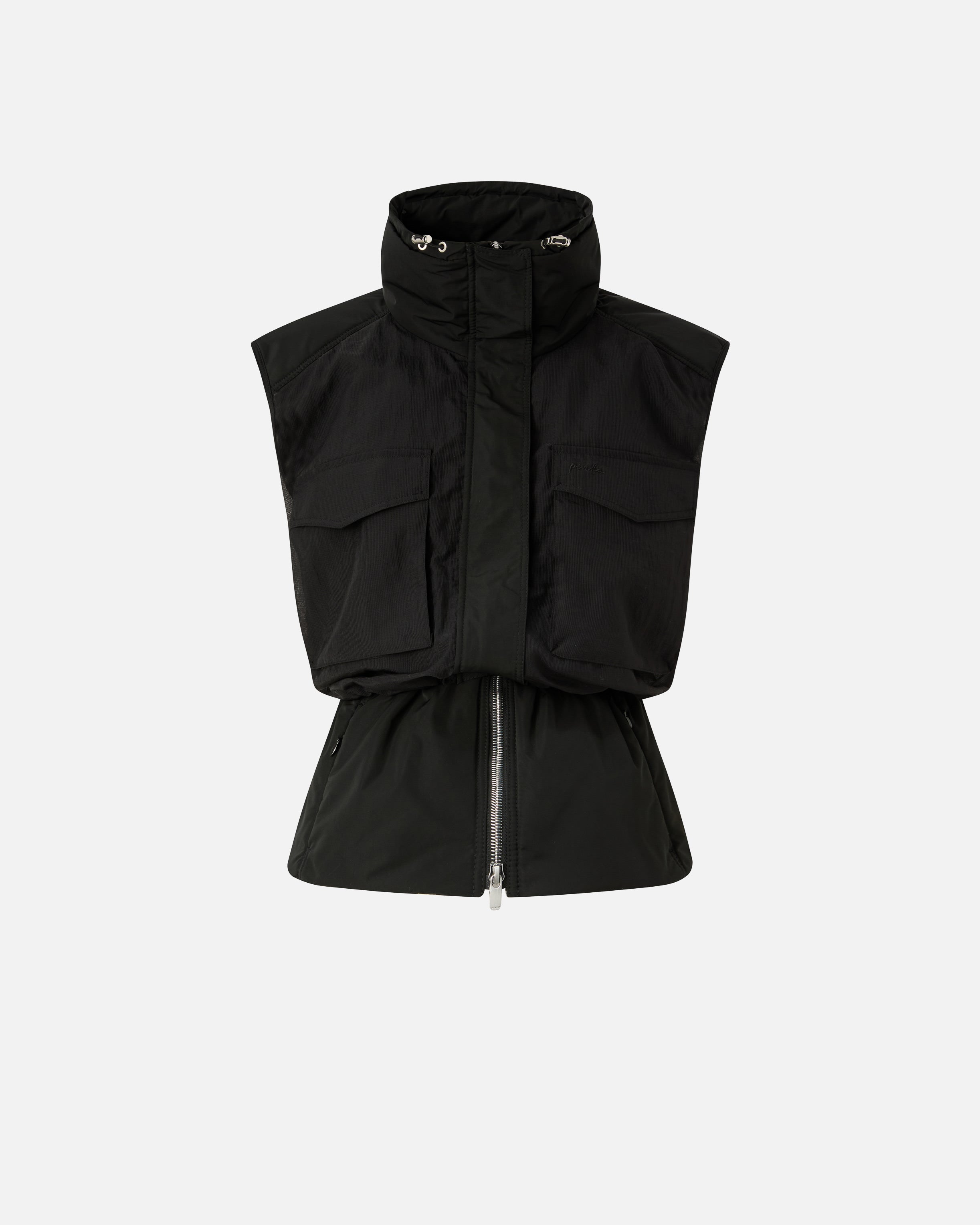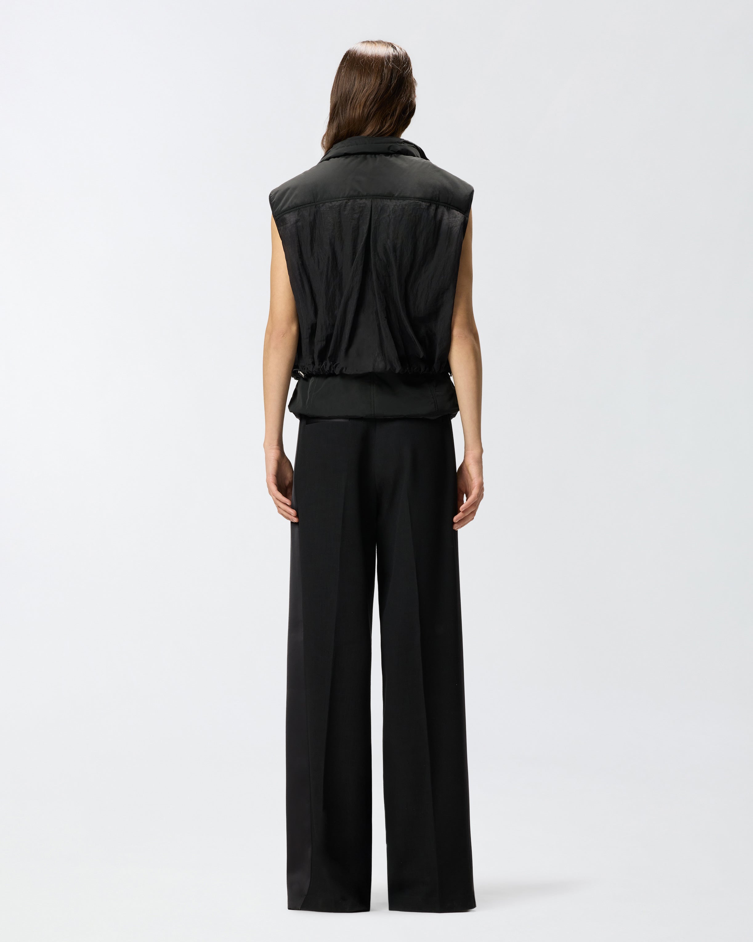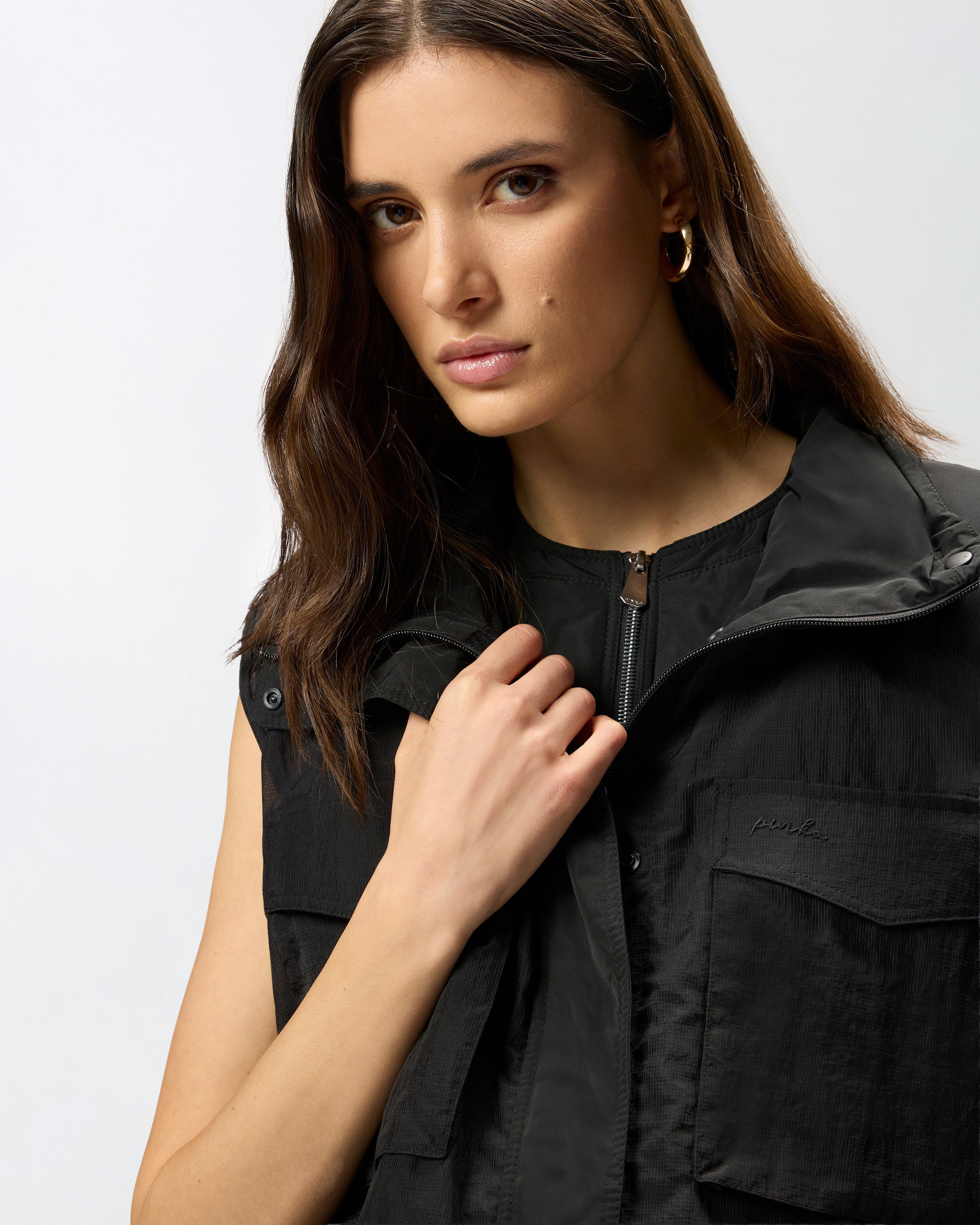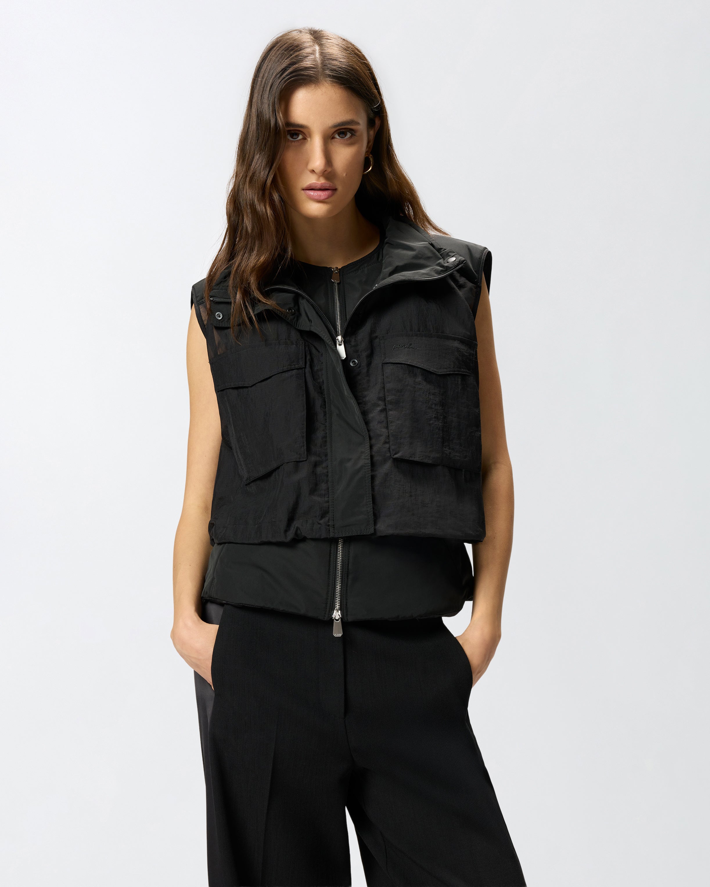 Sleeveless down jacket featuring a two-material composition: an upper section in crisp organza nylon ripstop and a lower section in technical taffeta-effect fabric, creating a contemporary blend of lightness and structure. The upper part features a stand-up collar, a concealed zip and press-stud fastening, two pockets with flap, one of which is finished with matching embroidered PINKO logo lettering, and two drawstrings: one on the neck and one at the hem for a customizable waist adjustment. The lower part of the down jacket has a two-slider zip and hidden pockets. - GERALDINE VEST