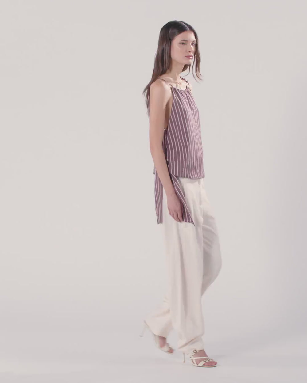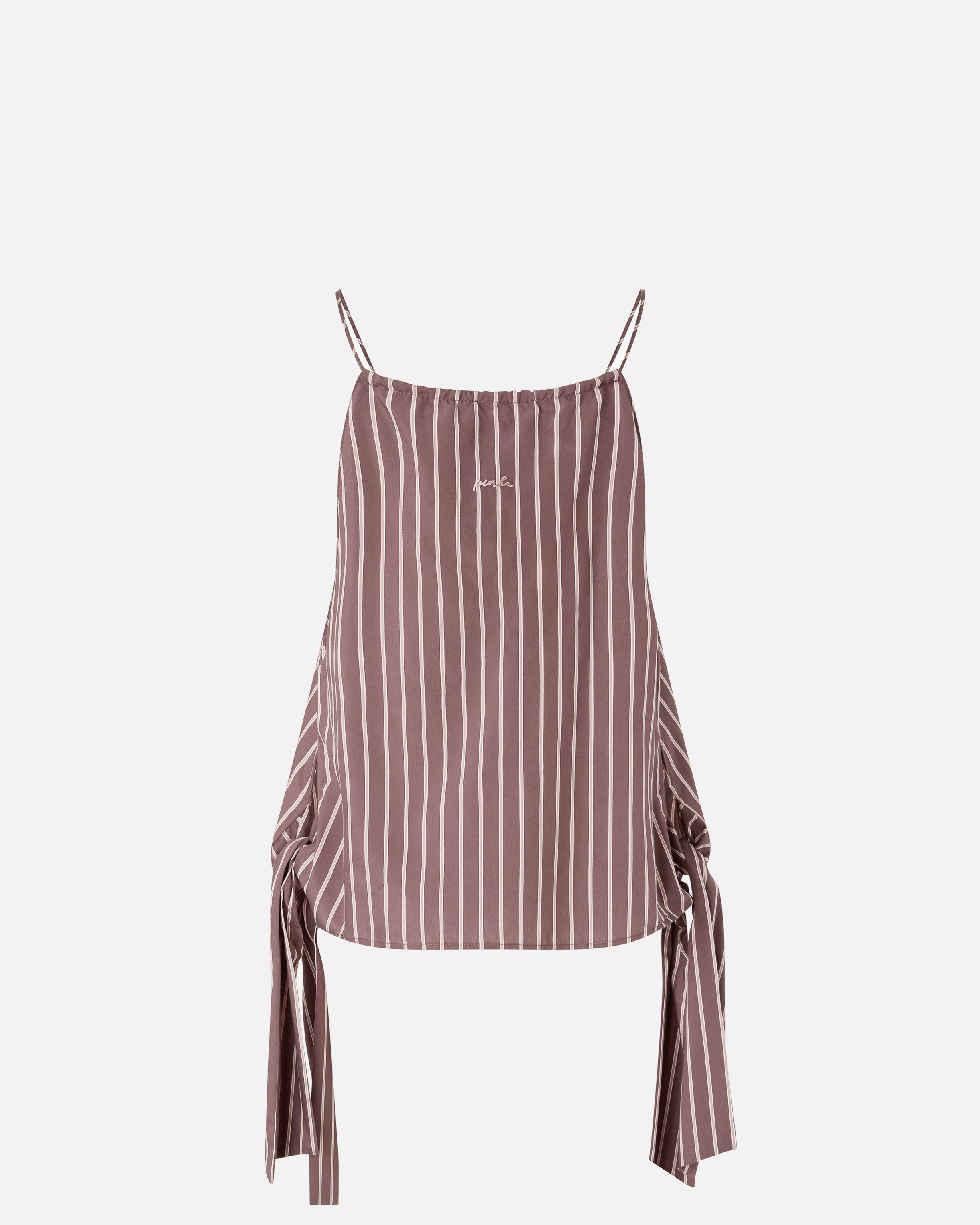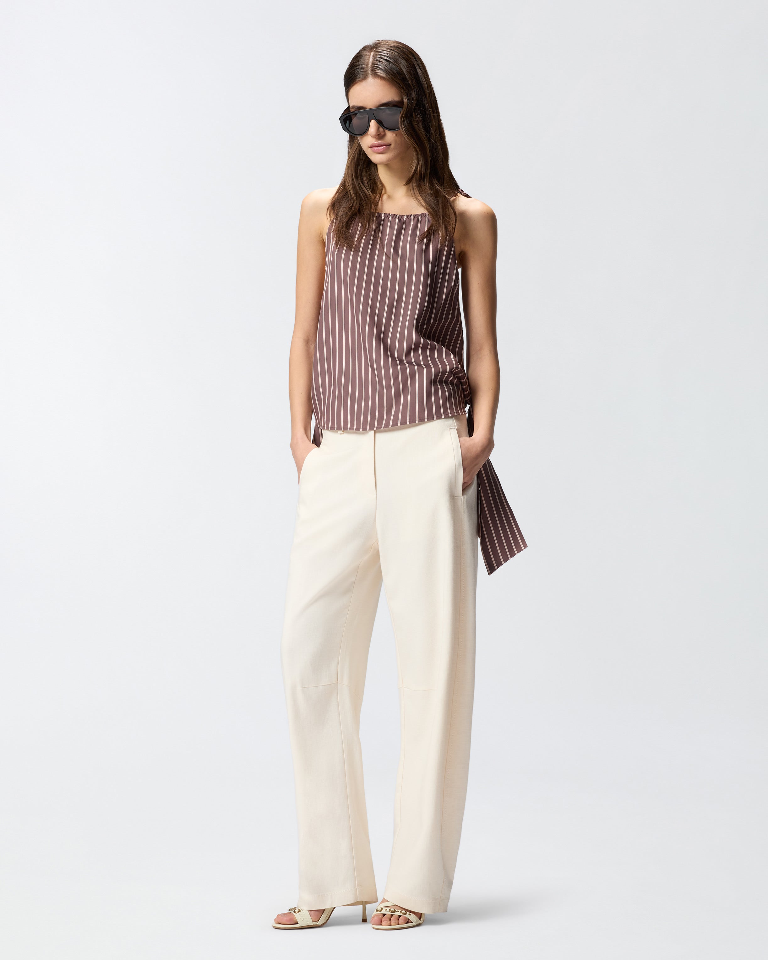 Loose-fitting top in lightweight yarn-dyed viscose fabric with vertical-stripe motif. Featuring comfortable thin straps adjustable with tonal ties, the garment is customised with the PINKO logo embroidered in cursive on the back, as a nod to the brand’s DNA, and is enhanced by side bows at the hem that can be tied to personalise both the styling and fit. Wear this top for a fluid, slinky effect that elegantly enhances the female silhouette with elegance.