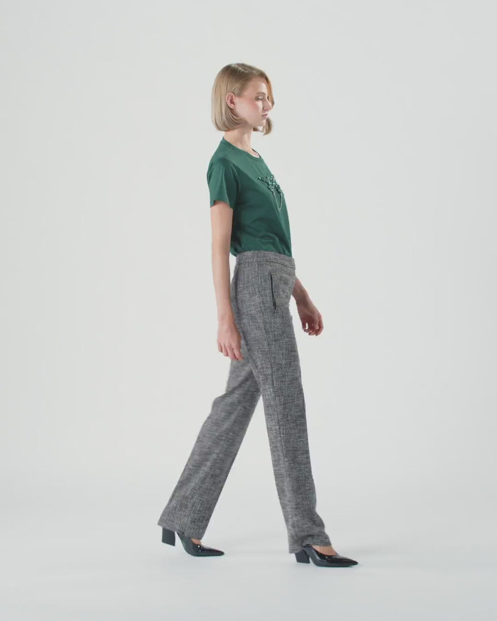 Short-sleeved cotton jersey T-shirt. This piece is embellished with the Love Birds logo decorated with hand-embroidery consisting of pearls, crystal chain with a baguette cut and rhinestones in different shapes attached with special claws on the sides to make them more secure. This T-shirt is perfect to wear for any occasion, from formal to more sporty, bringing an iconic, feminine touch.