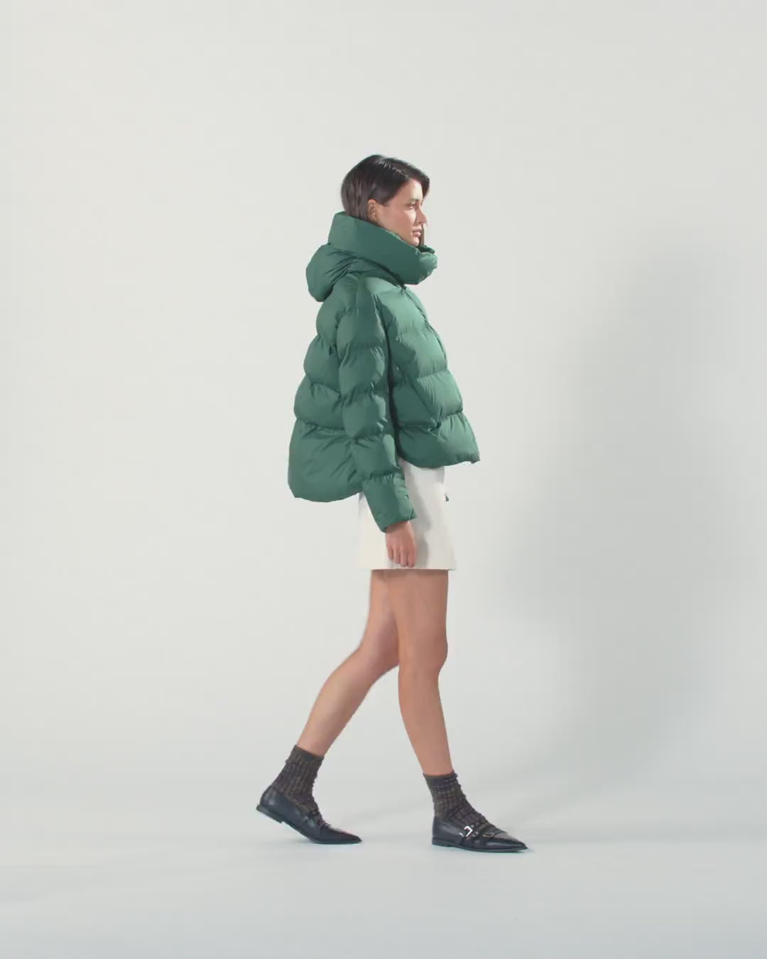 Short padded jacket, made from technical fabric with a special matte finish and horizontal quilting. The style features a wide collar with a cosy hood and comfortable vertical pockets with an invisible zip. Fastening with customised contrasting logo tape and two-way zip on the front. This outerwear is ideal for wearing on cooler early-season days in the open air with maximum comfort without sacrificing a touch of style.