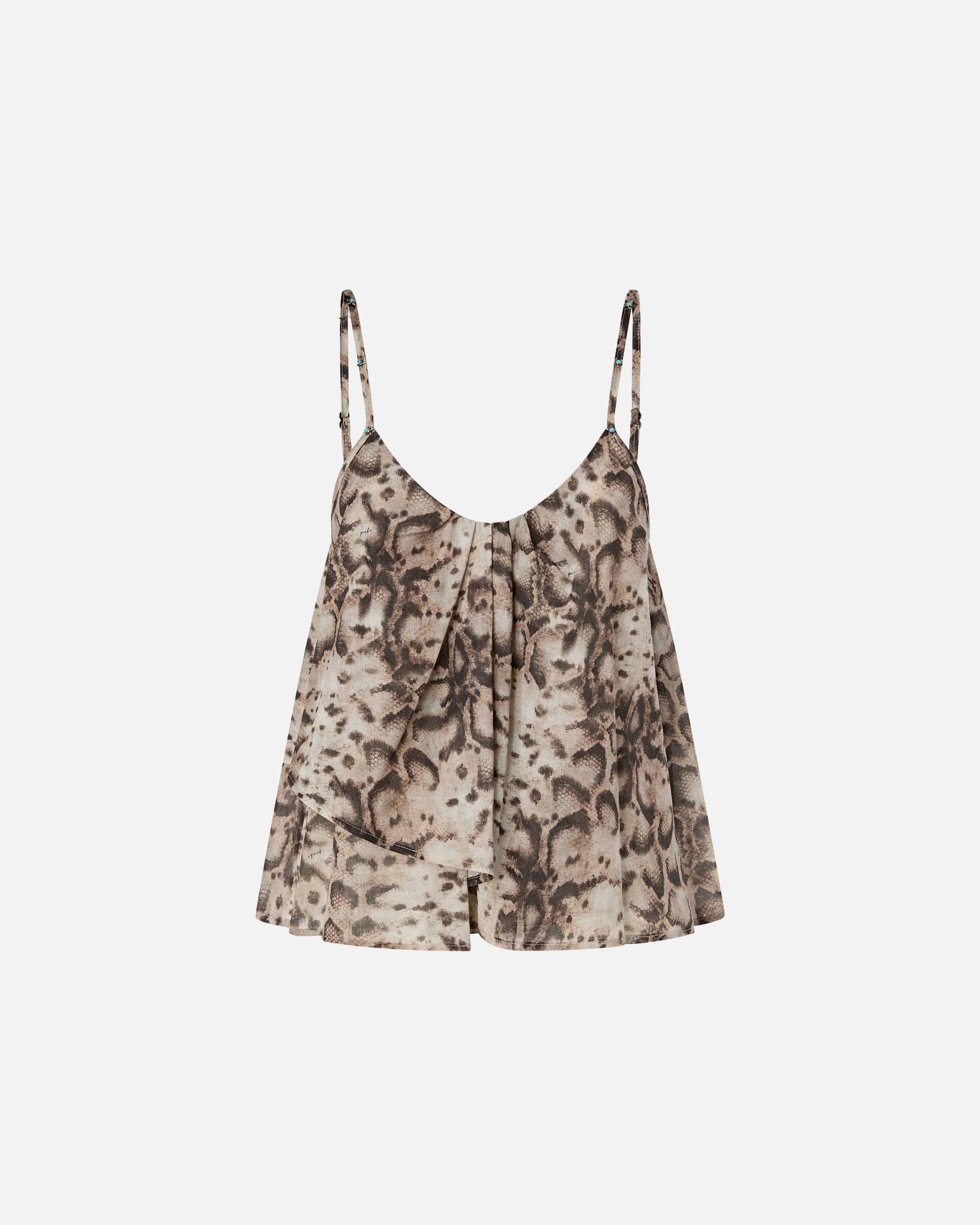 Top embellished with alluring all-over snake print, made from lightweight cotton muslin for maximum comfort and freshness. This sleeveless garment features adjustable spaghetti straps embellished with small coloured-stone jewel details, a wide round neck at the front and an elasticated straight neck at the back. Thanks to its airy, feminine silhouette and bold, modern pattern epitomising PINKO's DNA, this top will win over animal-print lovers and more the moment they see it.