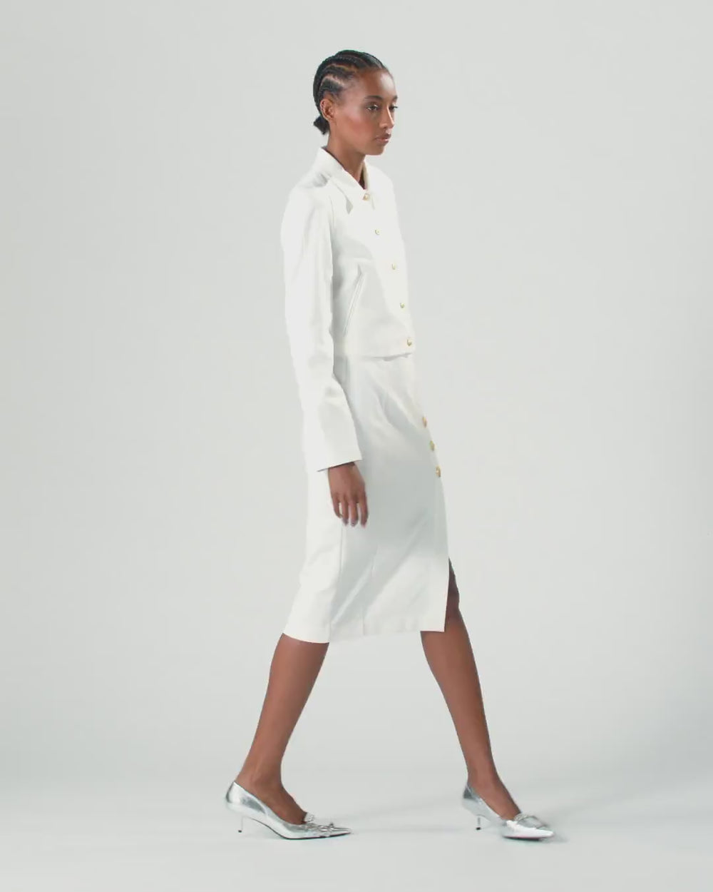 Calf-length pencil skirt in technical, full Milano-knit stretch viscose fabric. On the front, the slim-fit silhouette of the garment is emphasised by the side slit, which is topped by three metal buttons decorated with stars. Invisible zip fastening. Pair this skirt with a blazer in the same fabric for a suit look or with a shirt for a slightly but not overly formal look.