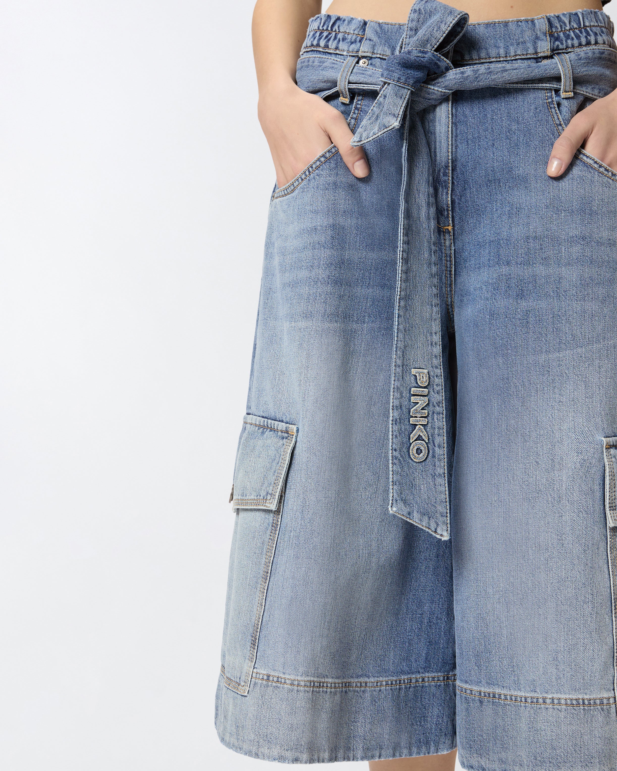 Relaxed-fit Bermuda shorts in pure cotton denim with medium wash and fading for an eye-catching worn effect. As well as the jean-typical five pockets and concealed zip and button fastening, this model features two utility pockets with buttoned flap on the legs, an elasticated waist with belt loops and a matching-fabric belt finished with raised PINKO logo lettering.