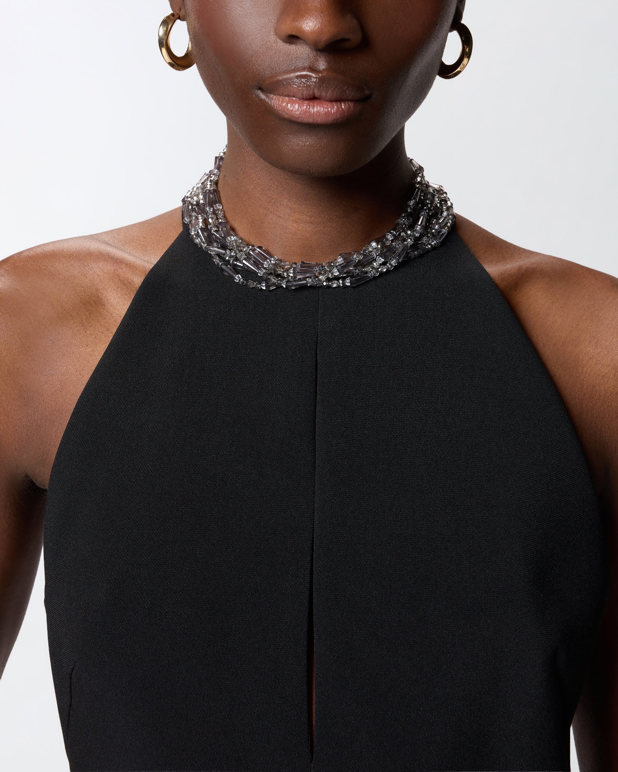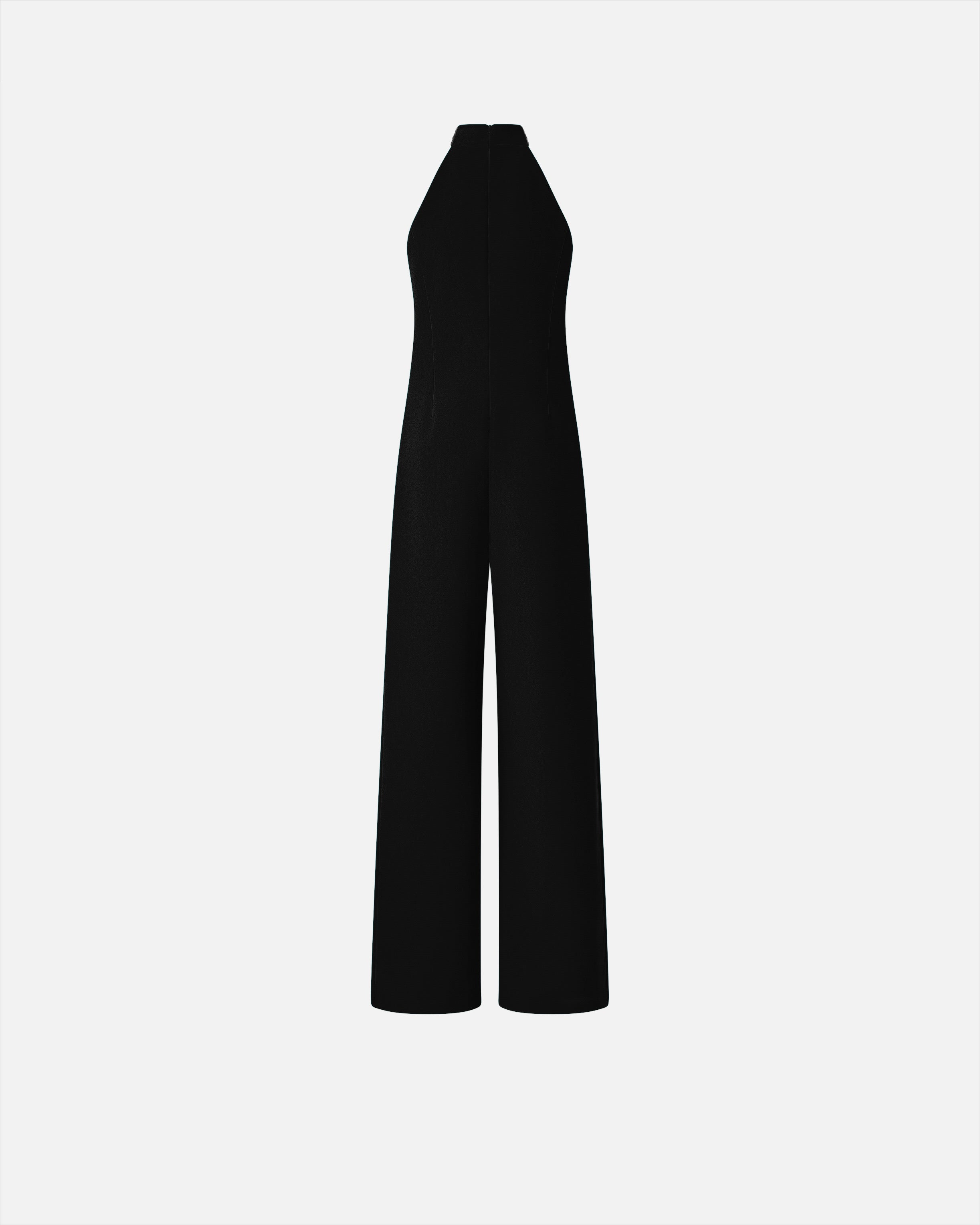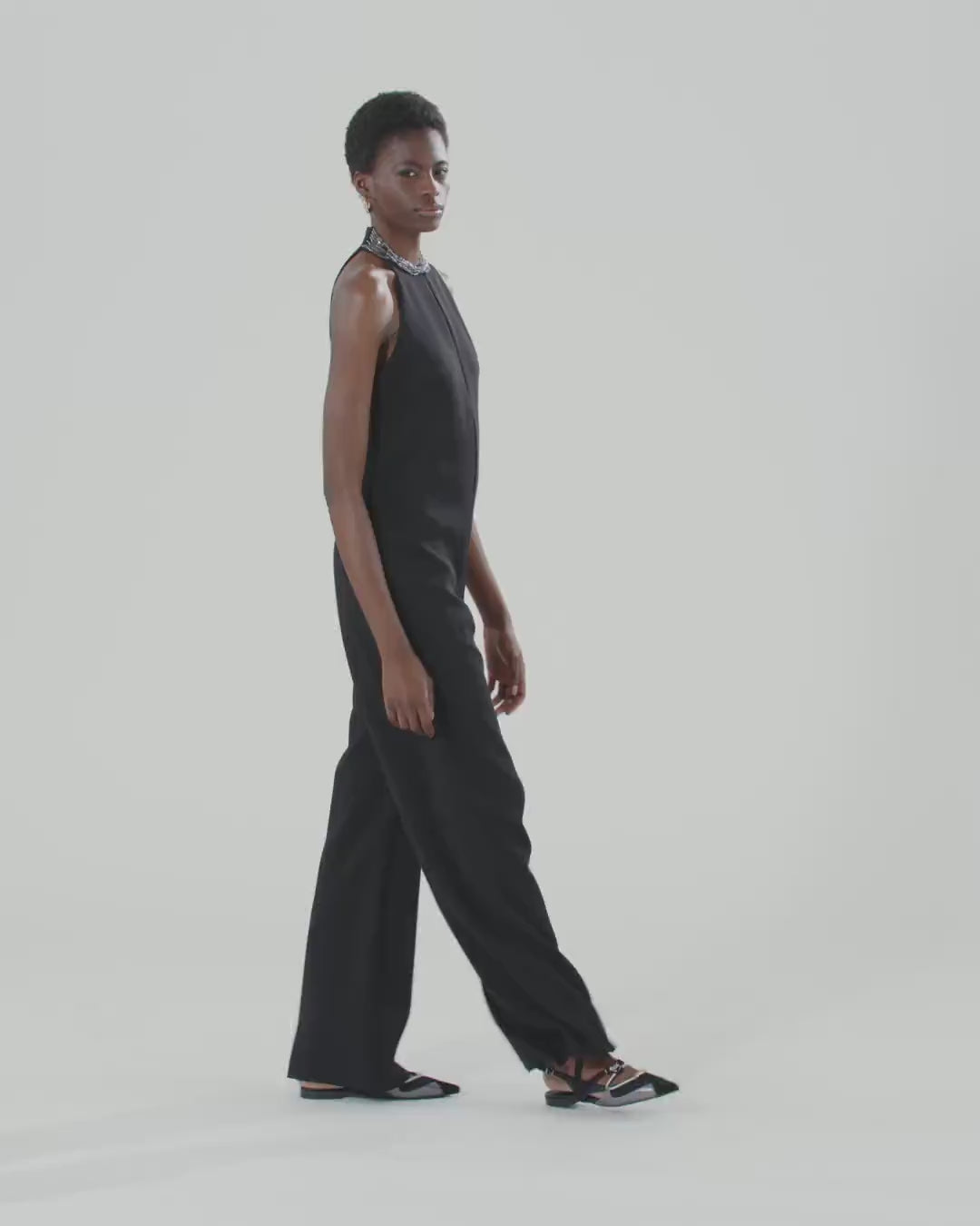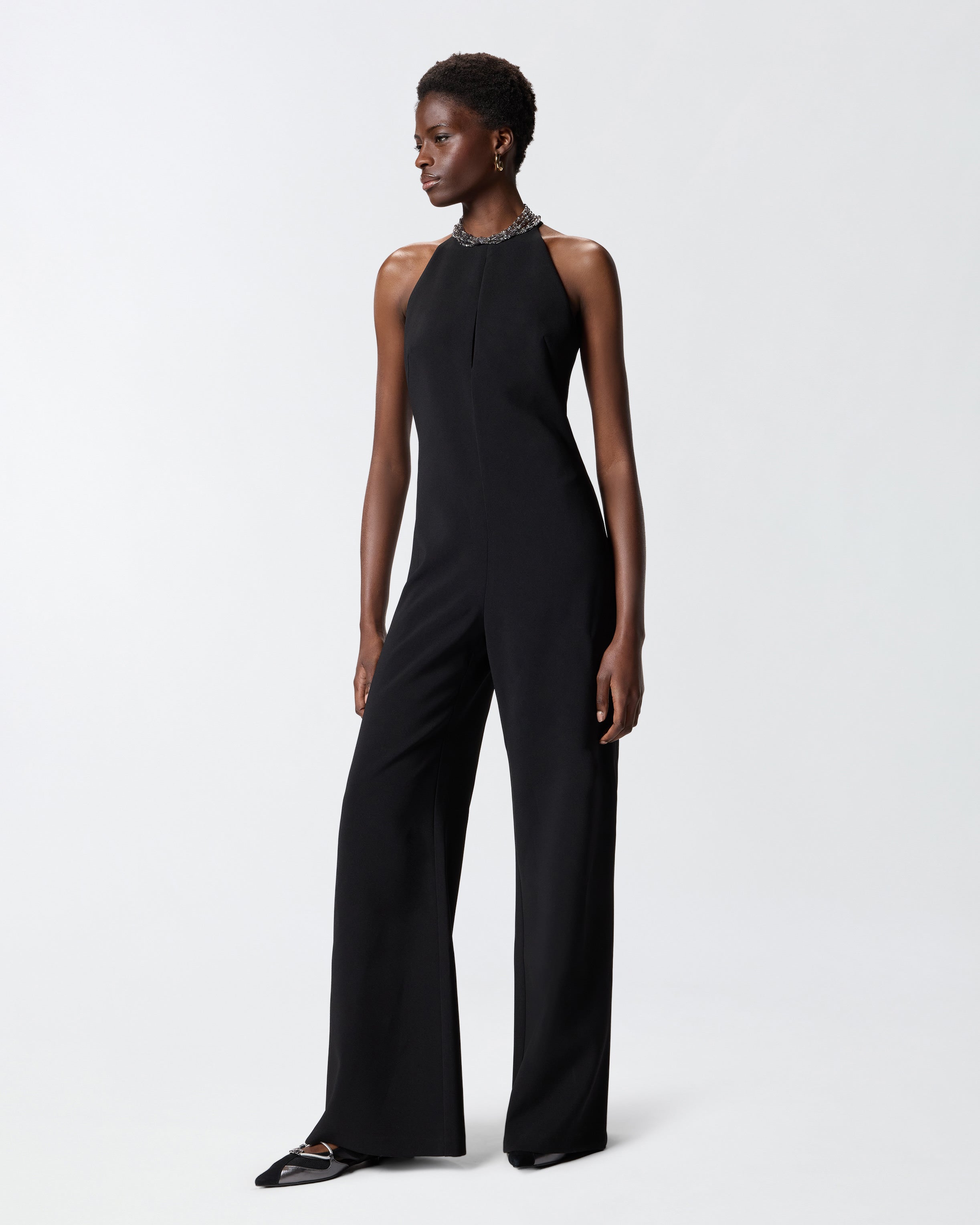 Straight-cut playsuit with long trousers made of a technical canvas fabric with a compact and contemporary look and lined in lightweight georgette for a more comfortable fit. This model stands out for its sleeveless upper with a refined halterneck, embellished with a thin vertical cut-out on the front and a jewel detail with rhinestones, also on the front, recreating a multi-strand choker necklace. This elegant jumpsuit is fastened with an invisible zip in the middle at the back to keep the look as clean as possible, making it perfect for both ceremonies and special evenings with a formal dress code.