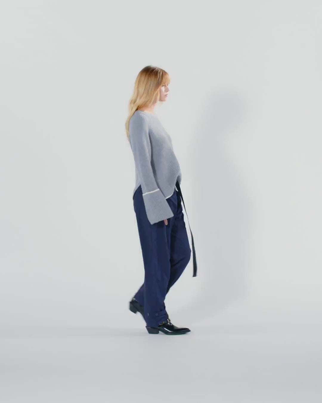 Soft merino wool and cashmere-blend crew-neck sweater with extra-long sleeves. The contrasting yarn on the hem and on the wide turn-up cuffs is a delicate touch of class. Everything is completed by the tone-on-tone label with PINKO lettering logo behind the neck. The piece has undergone finishing tests to minimise the possible formation of pilling, ensuring greater fabric softness and durability. This essential-design sweater will become a real go-to piece for your winter outfits.