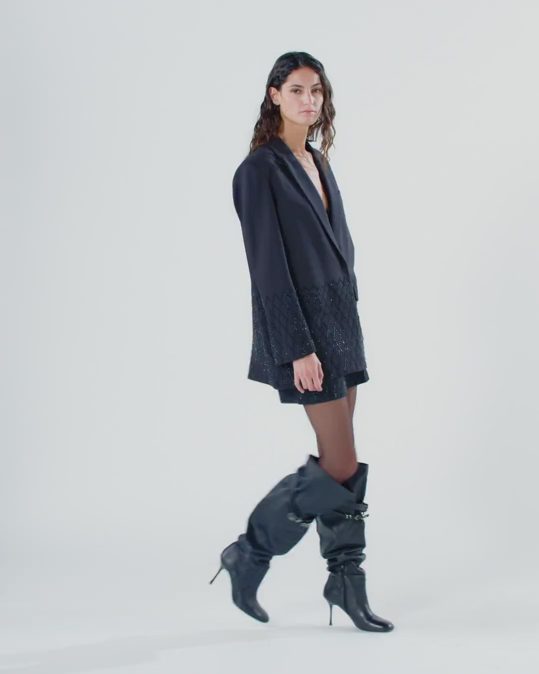 Fitted miniskirt with zip on the back. This design features rhinestone appliqué of different shapes and sizes that creates a sophisticated all-over geometric design. The detailing gives the garment a fine, luminous effect that elevates the understated quality of the silhouette. Opt for a refined, scintillating total look with the matching skirt for the most special occasions.