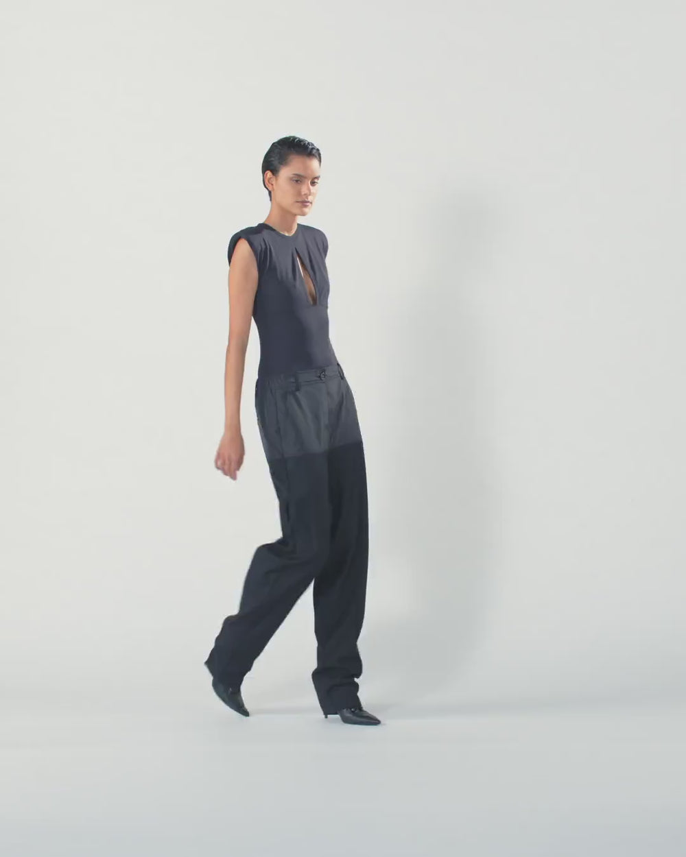 Cap-sleeved bodysuit in run-resistant stretch fabric that feels like a second skin when worn. The material is lined with contrasting fabric to create a sports-inspired technical look. The slim fit of the garment makes it highly feminine and sensual, but the most eye-catching detail is the simple yet striking cut-out on the chest.