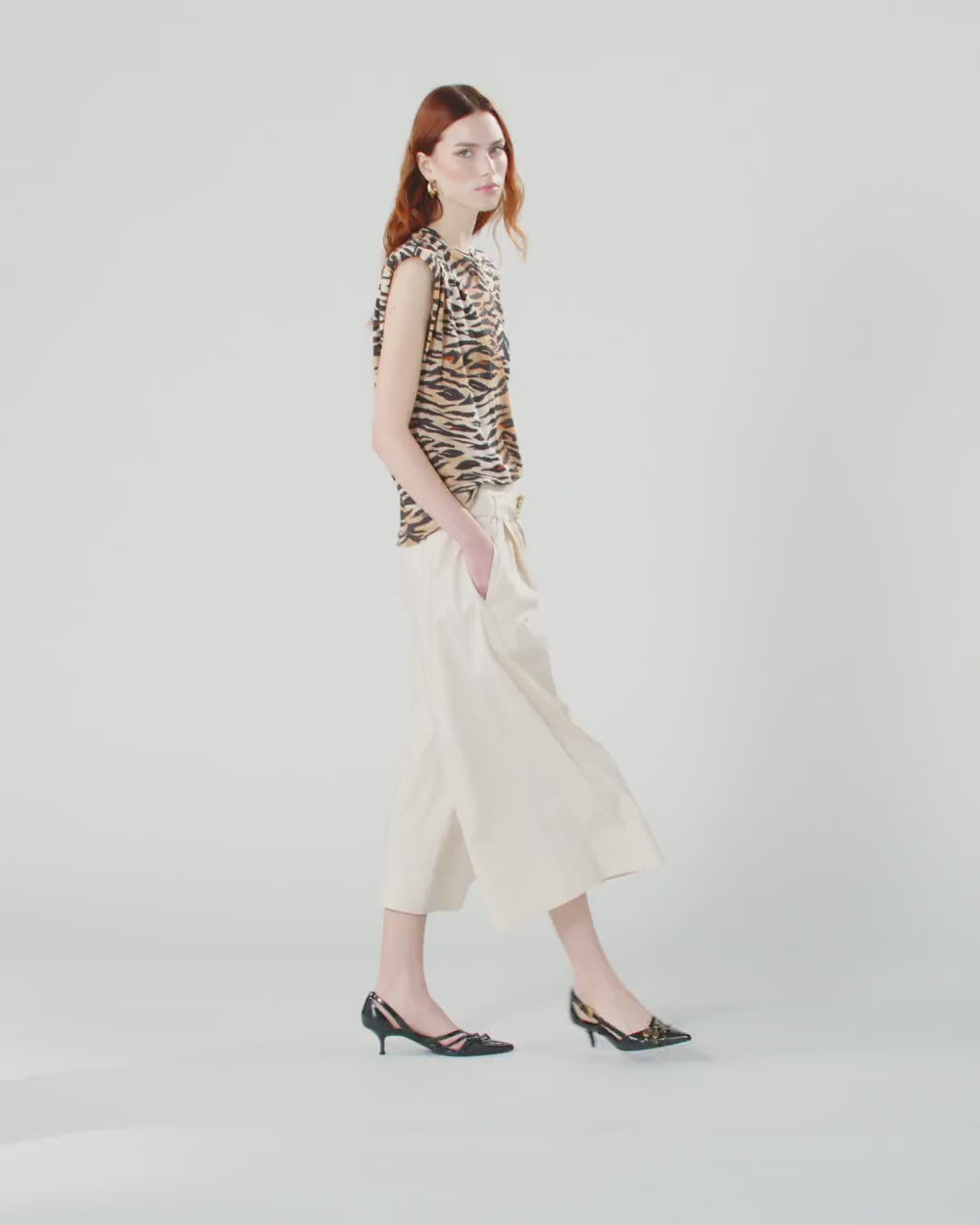 Sweater made from pure cotton slub jersey. This sleeveless model has a refined draped effect at the shoulders and features a bold all-over tiger print with small, discreet PINKO signatures written in italics. Thanks to its edgy, modern aesthetic, epitomising the brand's DNA, this piece will win over animal-print lovers and more the moment they see it.