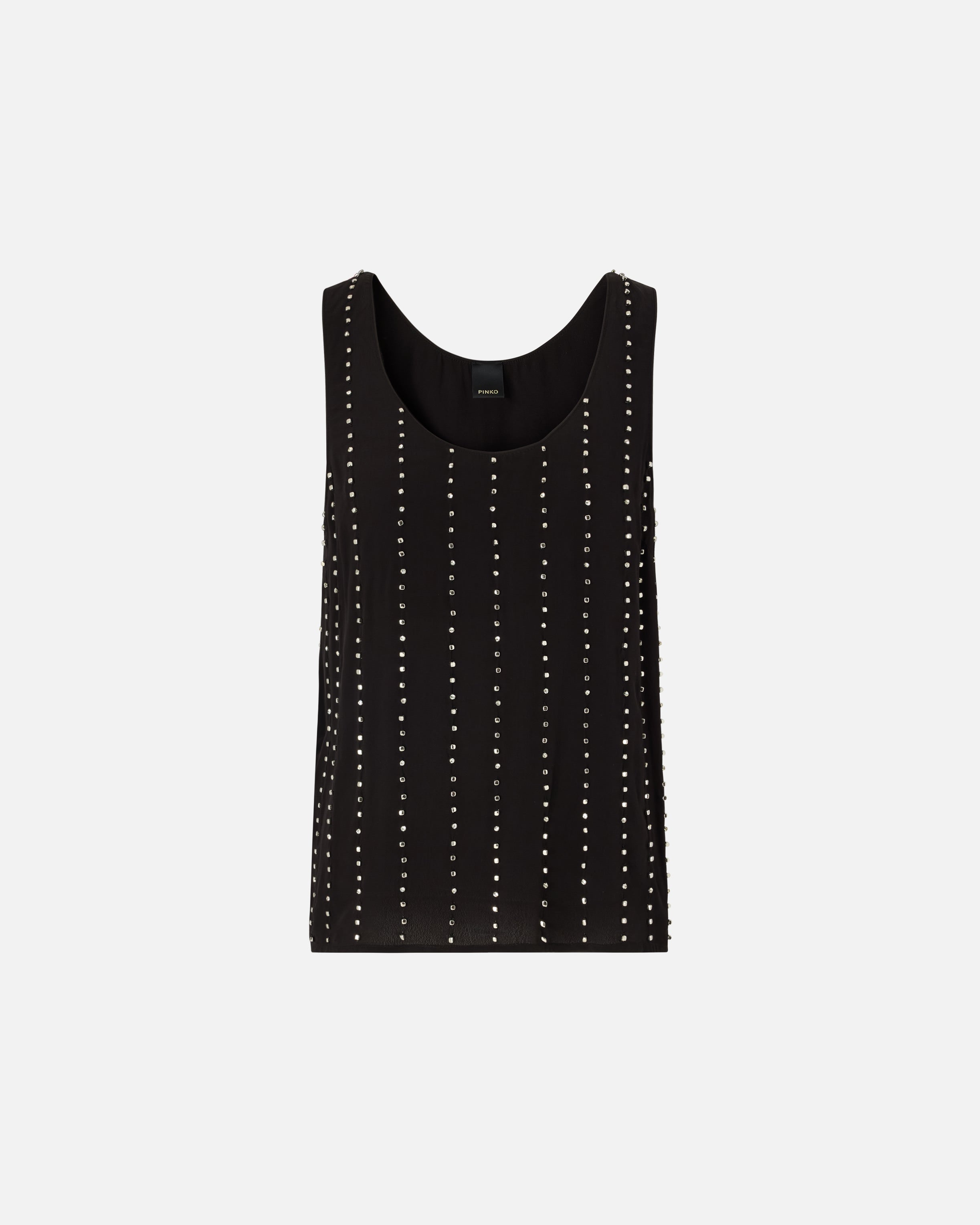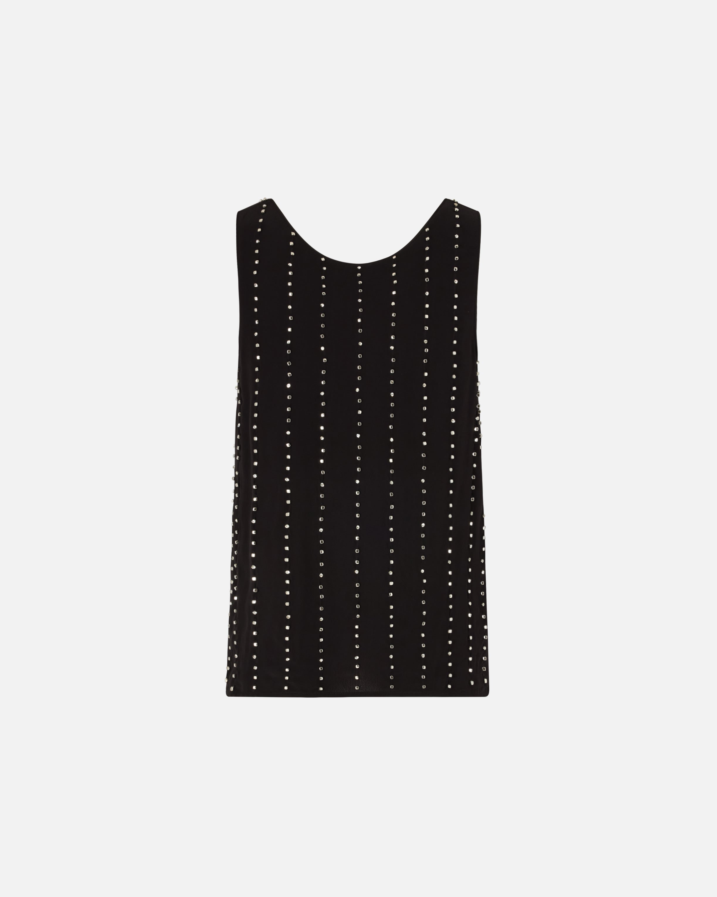 Vest top with a wide round neck, made of viscose crepe fabric with a fluid and flowing feel. Thanks to the striking, pinstripe-inspired motif formed by alternating small cube-shaped metallic elements and hand-embroidered set crystals, this piece is a real gem—literally. Thanks to its versatile yet elegant design, it's perfect to wear under a jacket and with tailored trousers, or with a pair of special jeans.