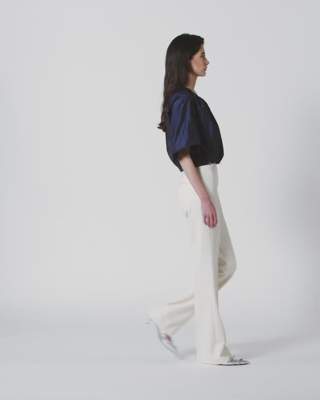 Bomber-style cropped jacket with a regular fit in taffeta, equipped with zip, short balloon sleeves to be extended up to three-quarters and elastic at the bottom. The fabric, light and shiny, creates iridescent reflections and blends perfectly with the soft and dynamic volume that distinguishes the garment. The studied cuts and contemporary lines of this elegant outerwear are enriched by distinctive details, such as the gathers on the crew neck.