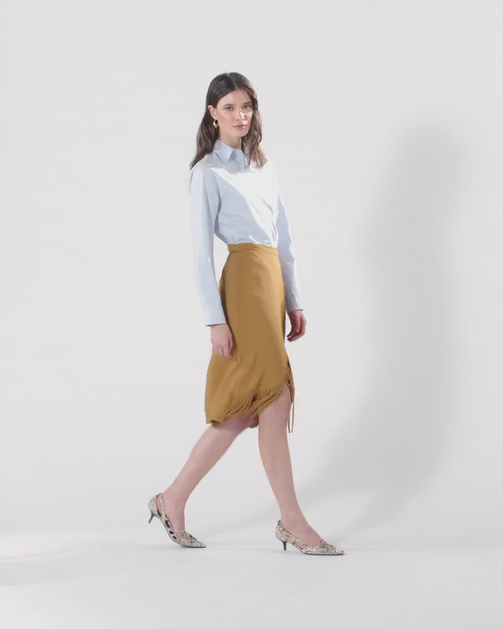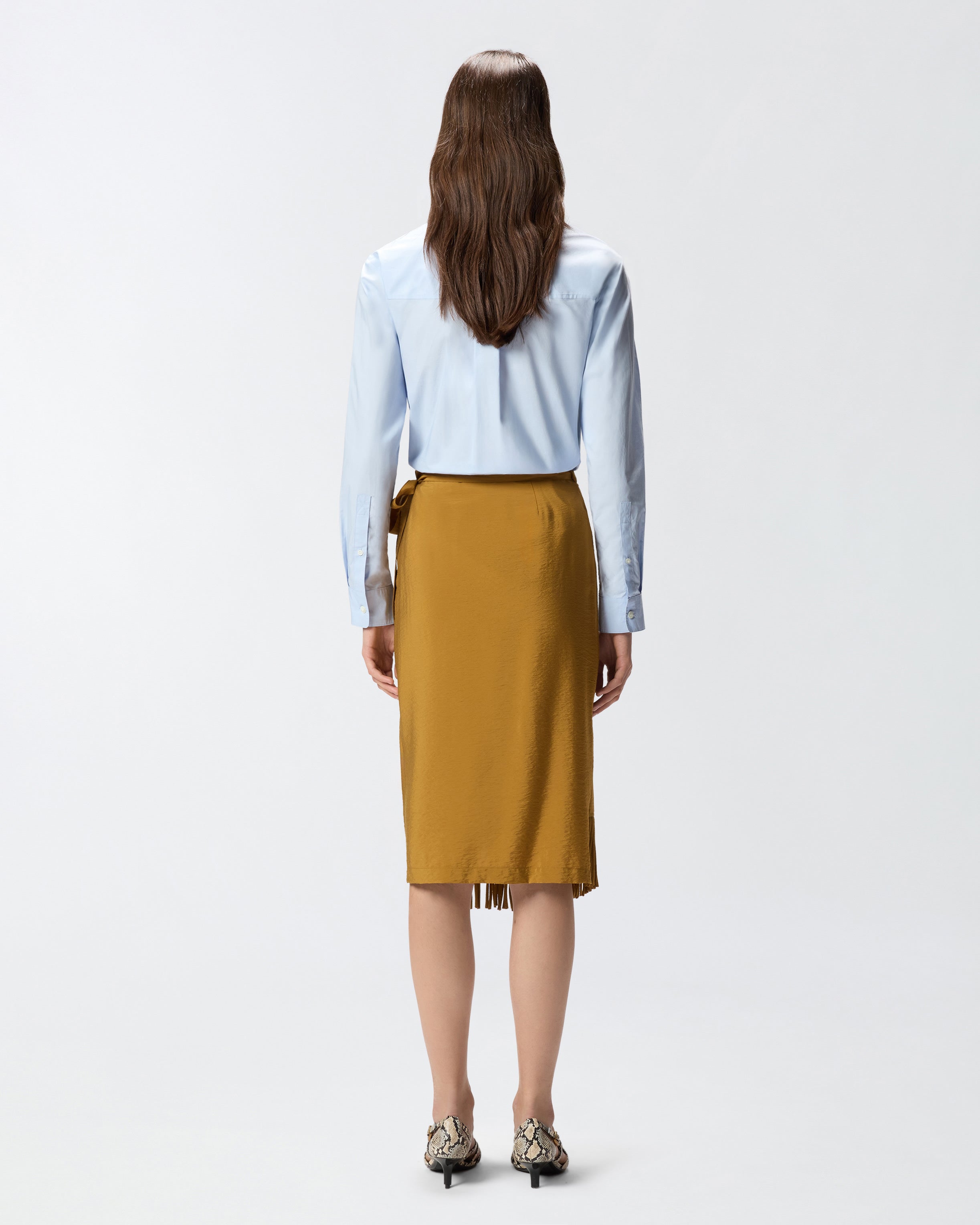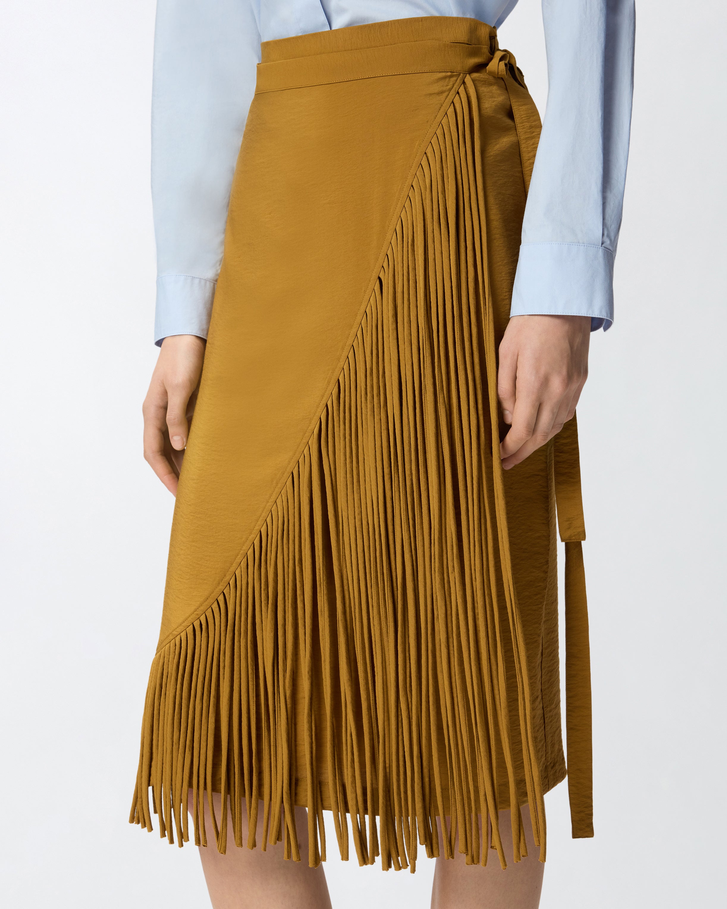 Calf-length skirt in washed viscose canvas with a slightly crinkled, semi-shiny finish, featuring a straight yet fluid silhouette and a wrap-style fastening with ribbons to tie at the side. The style has a Western-inspired design reinterpreted in true PINKO style, with long tubular hand-made fringes which outline the front panel, adding movement to every step you take. Pair this skirt with a minimalist top for a beach or pool party, or if you have a soft spot for Country style, wear it with the matching fringe shirt to give your daytime looks a playful twist.