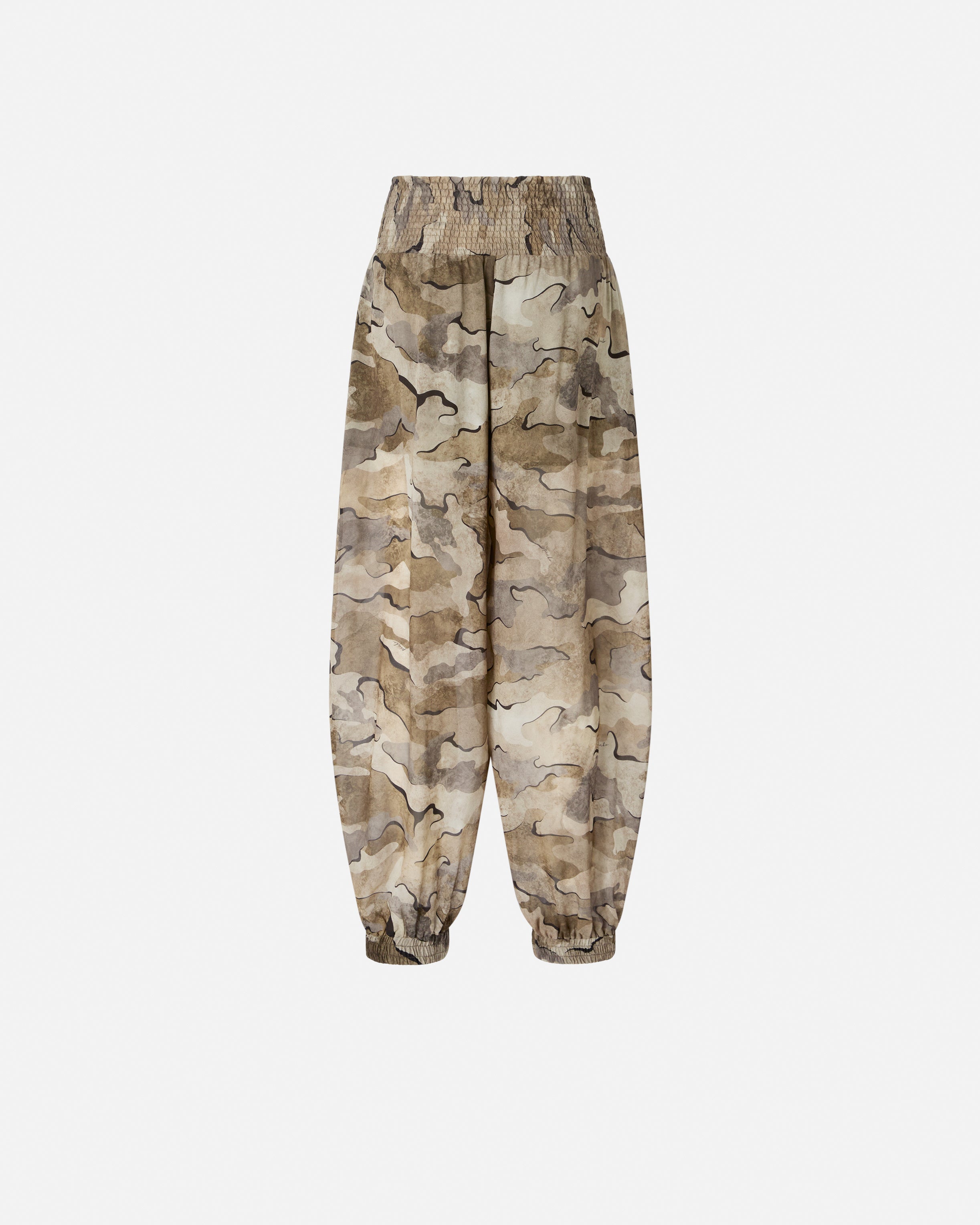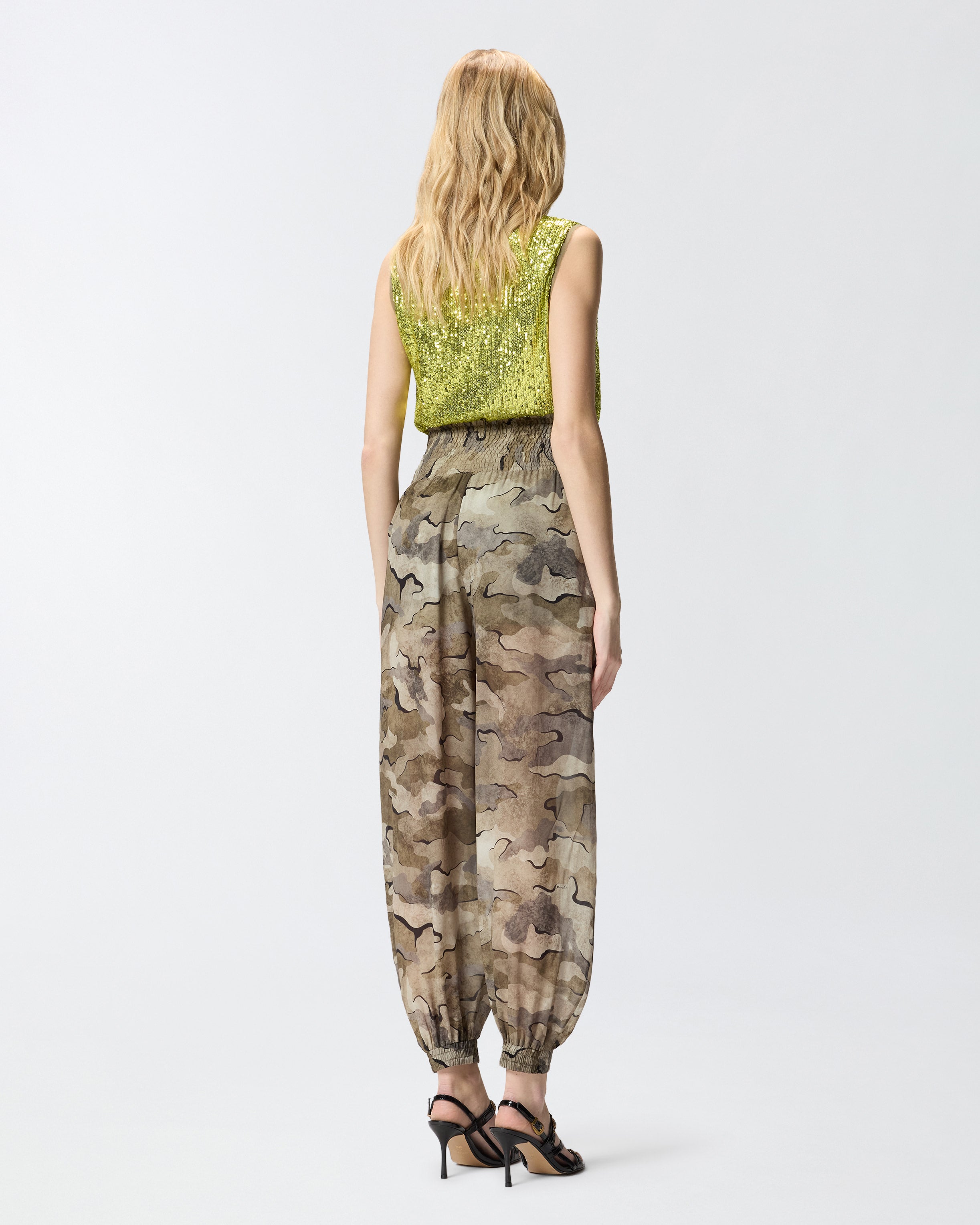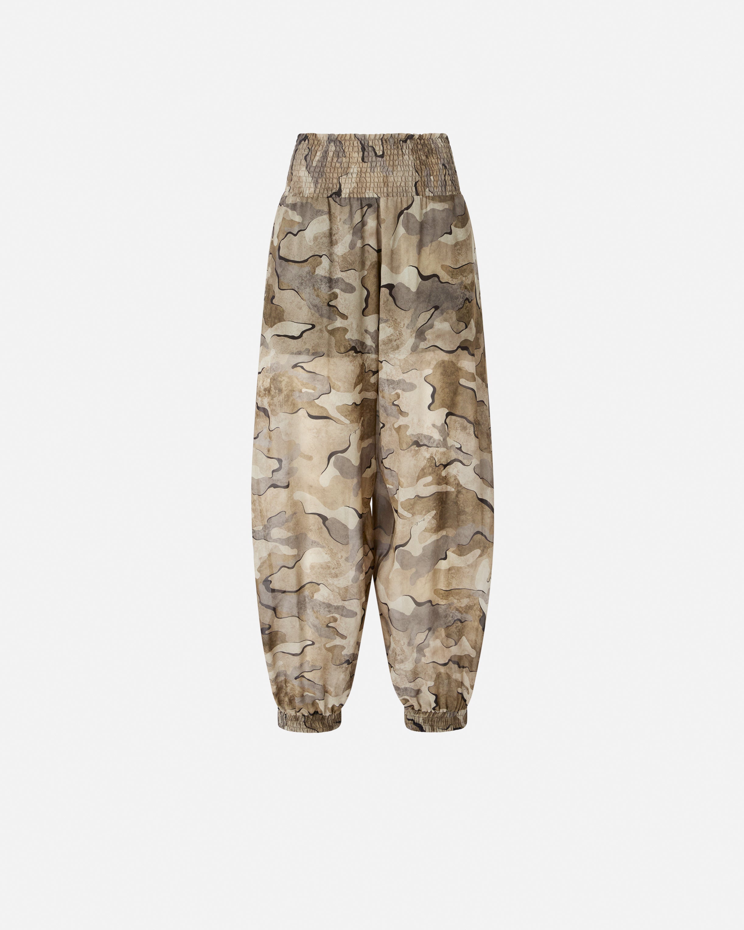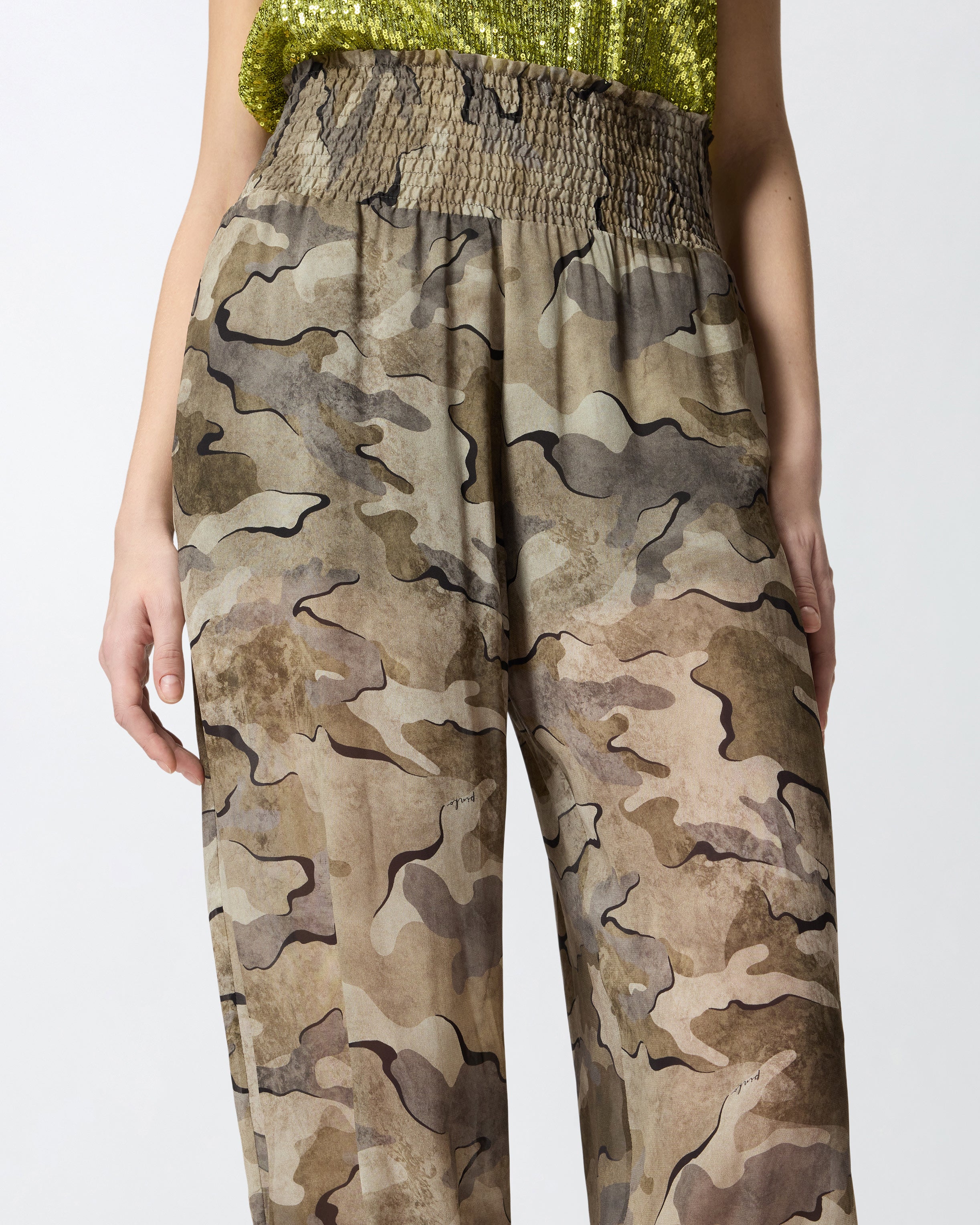 Balloon-fit trousers with loose balloon leg that's rounded at the top and narrower at the bottom. Made from soft georgette fabric, this model stands out for its army-chic camouflage print all over and for the gathered and elasticated smocking on the high waist and at the bottom of the legs. A garment that combines streetwear vibes with a contemporary soul, to complete your summer outfits in pure PINKO style. - VELATO TROUSERS