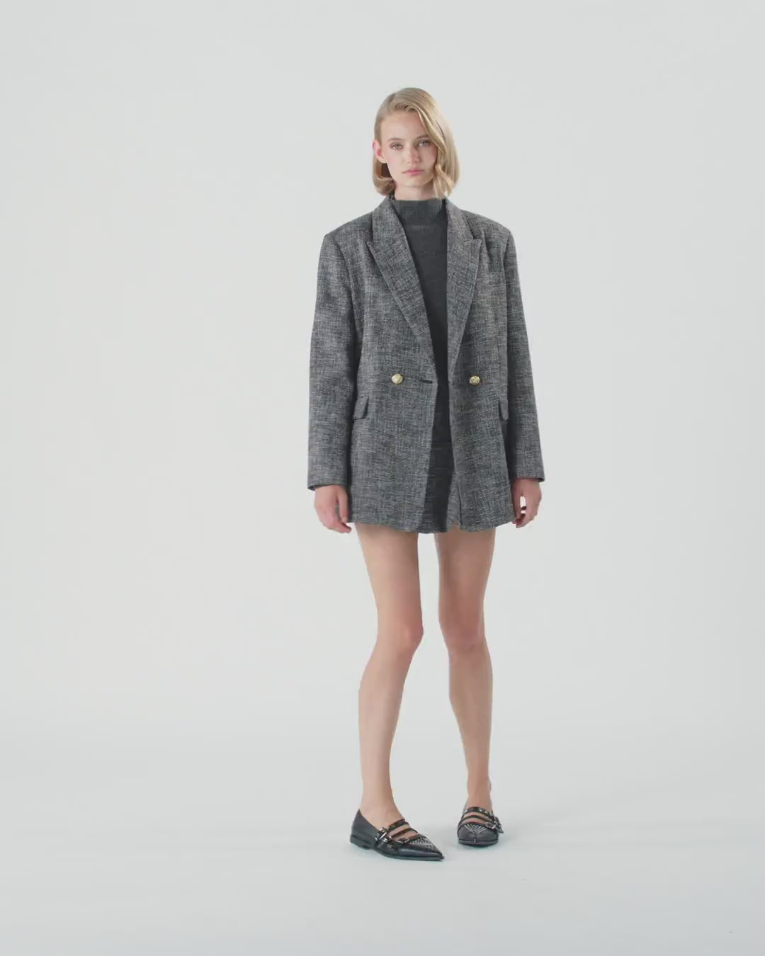 Double-breasted blazer with a straight cut and an oversized fit with lapel collar and front flap pockets. This garment is made from flannel with a pleasant and warm hand and features a classic-inspired tweed design. The style features a front fastening with metal star-decorated buttons and a rear slit, which is also buttoned. Pair the blazer with the trousers in the same fabric to create an elegant yet contemporary outfit.