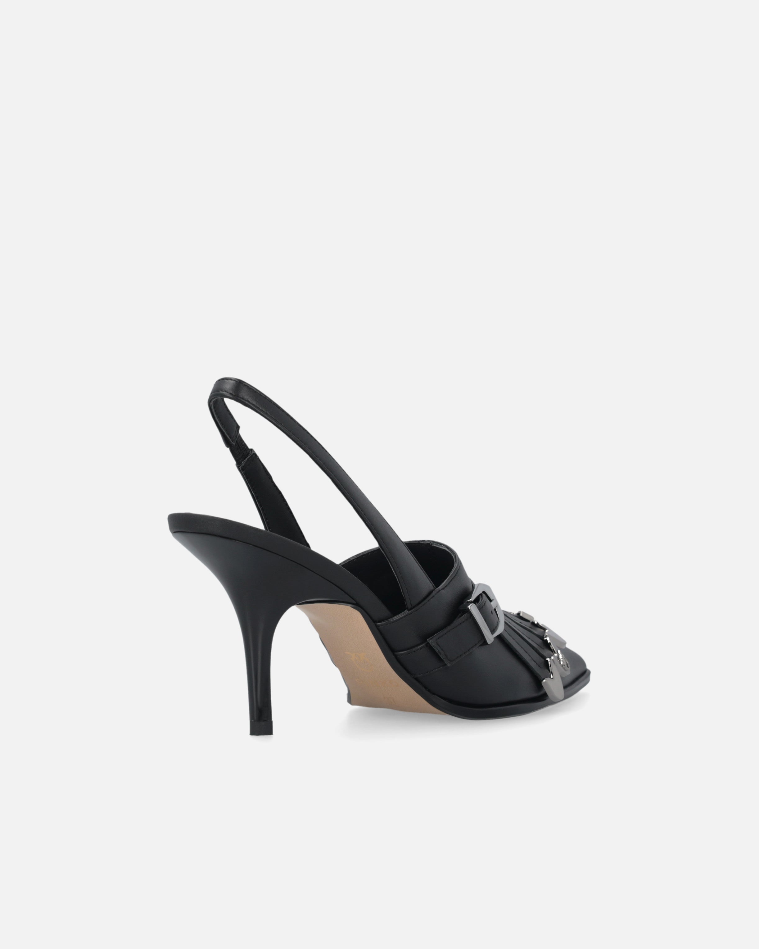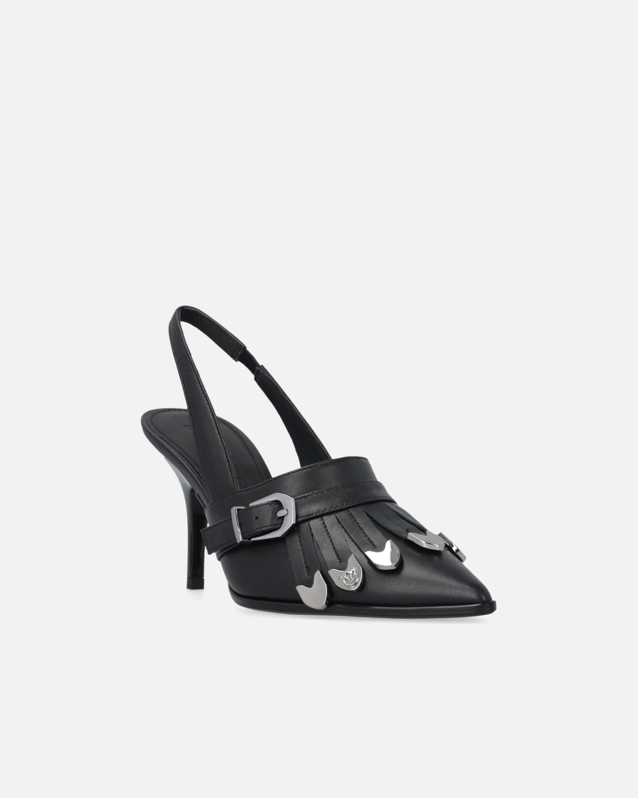 Made from soft leather, these PINKO slingbacks feature a sleek design with an elongated toe and slim heel that creates a slender, ultra-feminine silhouette. This model features details inspired by the world of saddlery that add a bold twist with an unmistakable style, such as the strap buckle and the metal-tipped front fringes, one of which is embellished with the Love Birds logo. A perfect balance between tailoring heritage and contemporary sensuality, these shoes will instantly enhance your daytime and evening outfits. - LADY 04