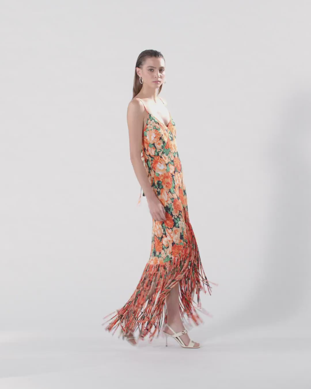 Long dress with fringing and Botanic Garden print