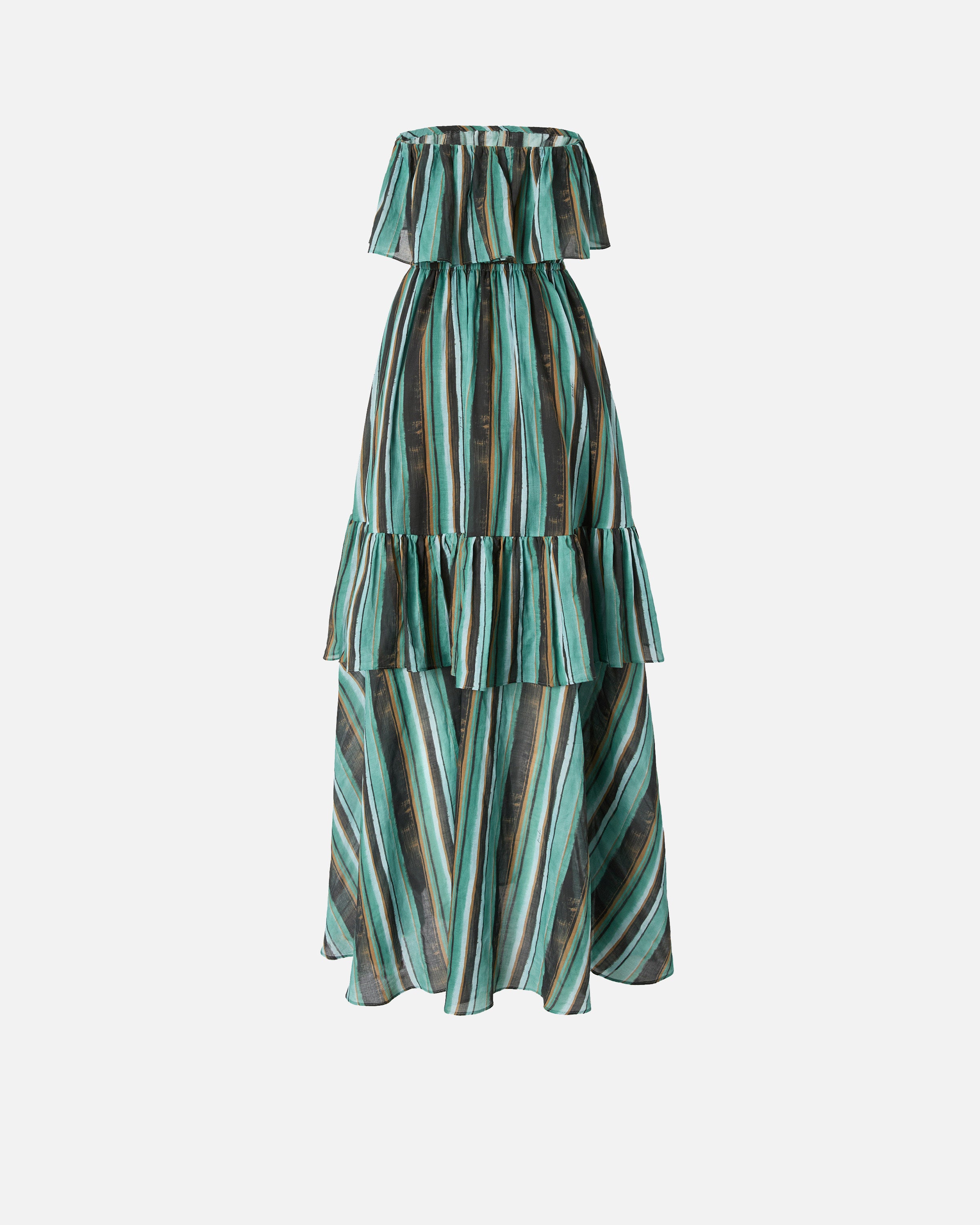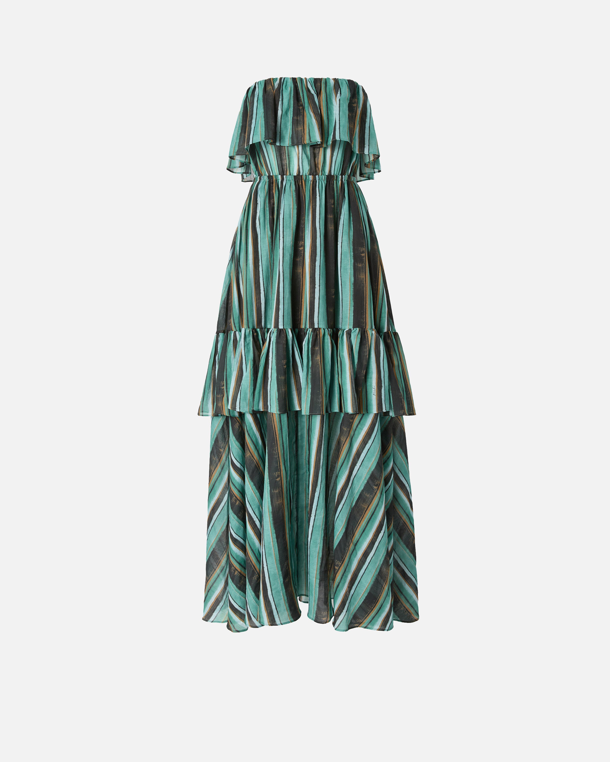 Long dress in light muslin with brushstroke-effect striped print and fluid silhouette, characterized by a bardot neckline with maxi ruffles and flounced construction that gives movement and volume to the entire garment. The asymmetrical length creates an elegant play of solids and voids, enhancing the verticality of the imagination. Perfect with minimal sandals and essential clutch for a sophisticated and scenic summer look.