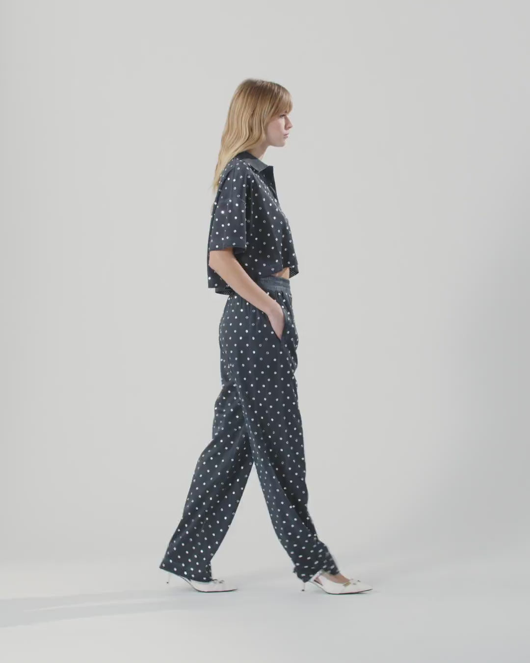 Trousers with elasticated waist, made from jersey fabric with slight fading. This model features basketball-inspired mesh detailing and is embellished with small circular mirrors all over. Wear this garment with your favourite T-shirt or with the matching polo shirt in a head-to-toe outfit, for modern style that doesn't sacrifice femininity.