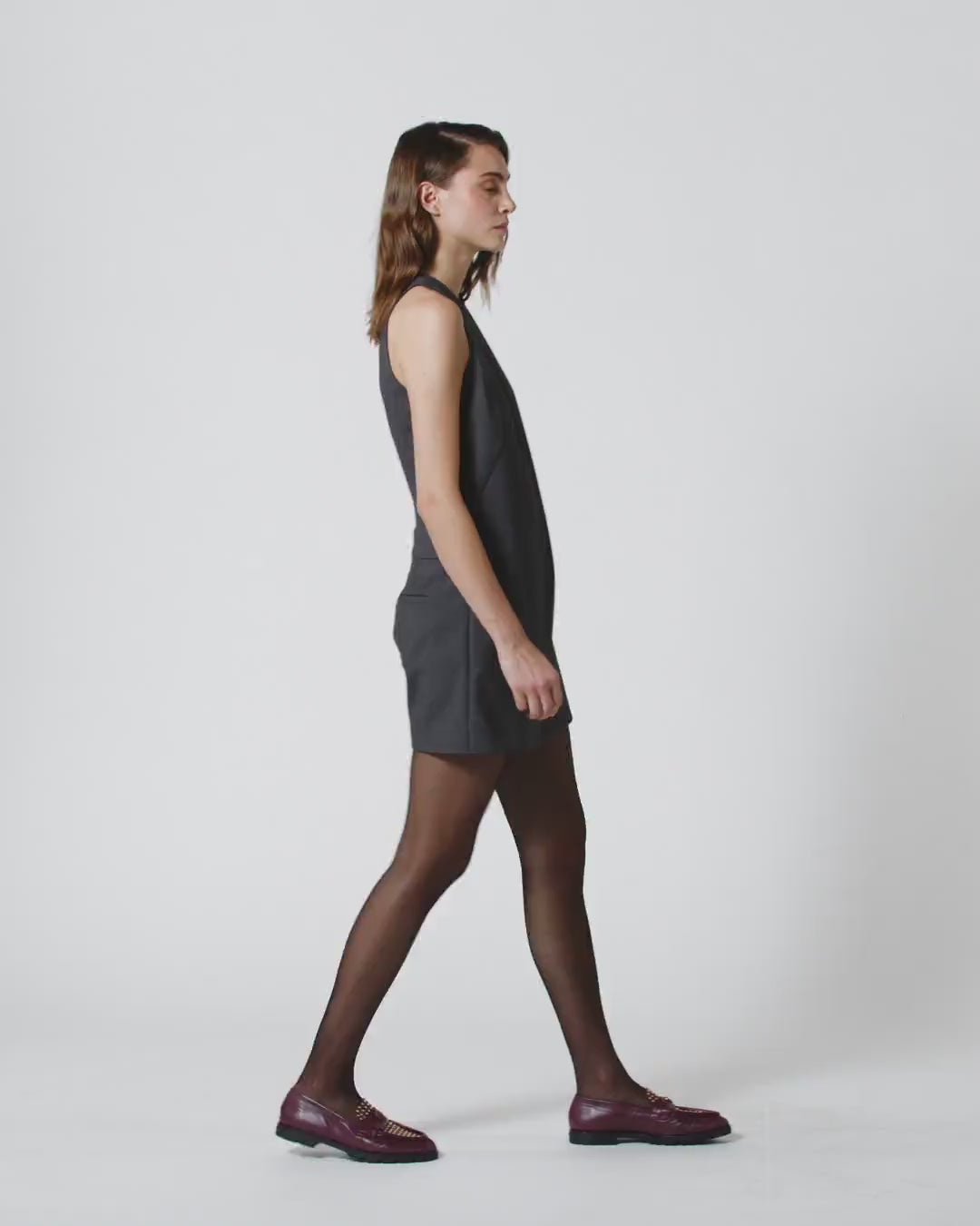 Short fitted-waist playsuit in classic-inspired melange canvas bonded with technical jersey. A perfect example of reimagining a classic, formal design, this garment stands out for its striking dress-effect front part and shorts-effect back part. This sleeveless crew-neck piece is complete with convenient side pockets, refined rear welt pockets and invisible zip fastening at the back.