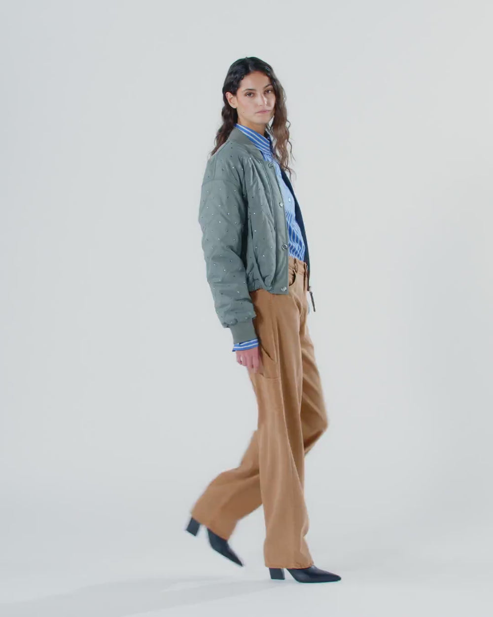 Bomber jacket made from matte-finish twill fabric with quilting and light padding. This piece is functional thanks to the zipped side pockets with tonal straps, the concealed zip and press-stud fastening and the stretch knit fabric at the neck and cuffs that provides maximum comfort. Balancing out the practicality of the garment perfectly is its embellishment: an exquisite all-over motif featuring diamond-shaped heat-transferred rhinestones and metal micro studs ready to elevate your outfits in pure PINKO style.