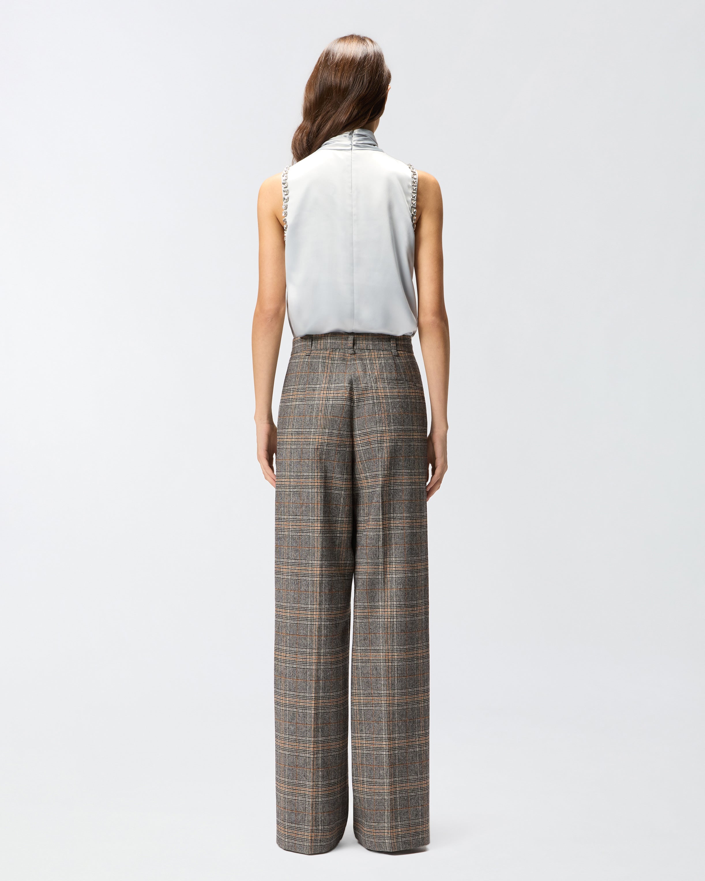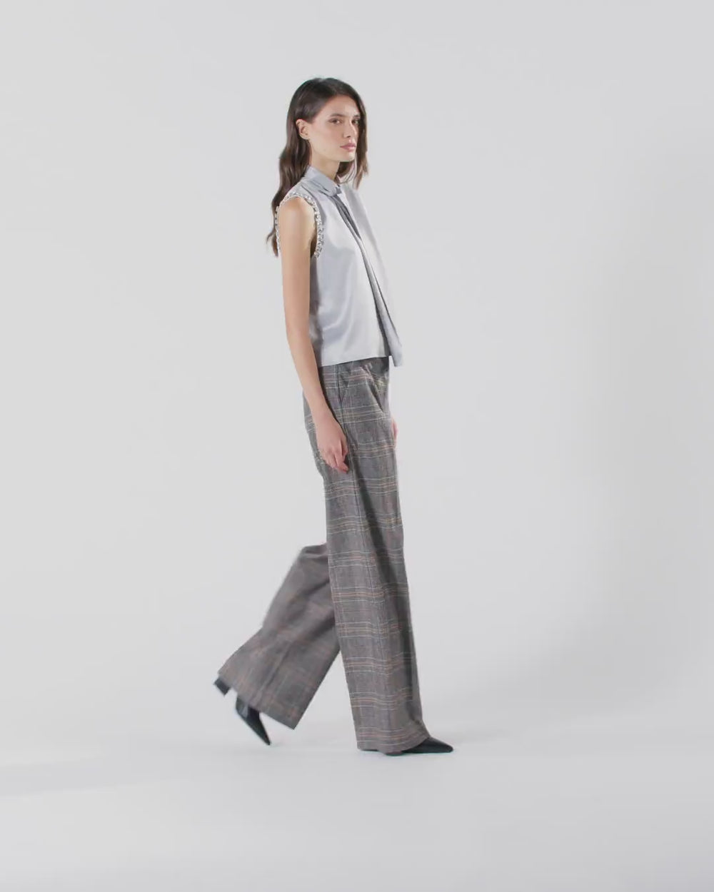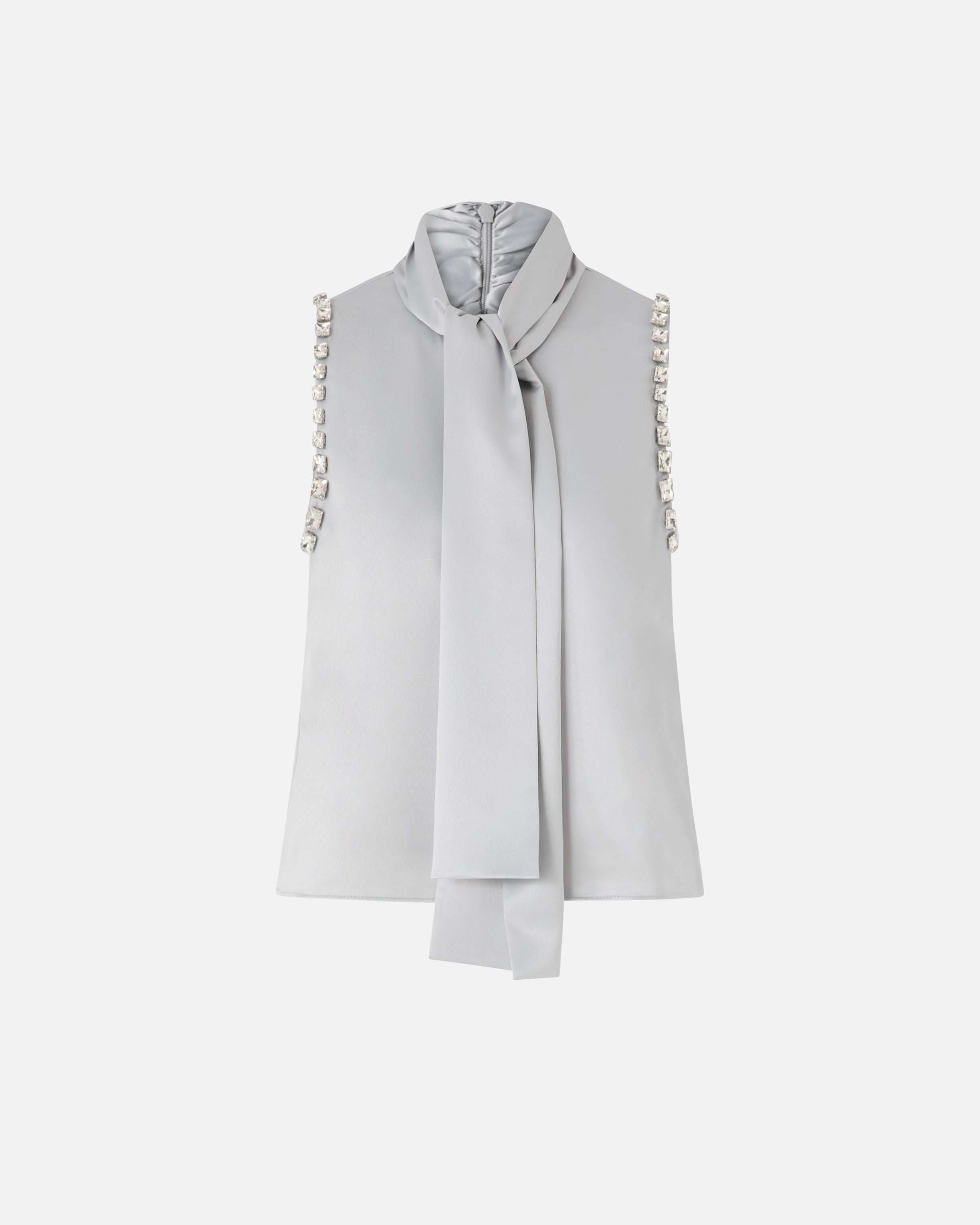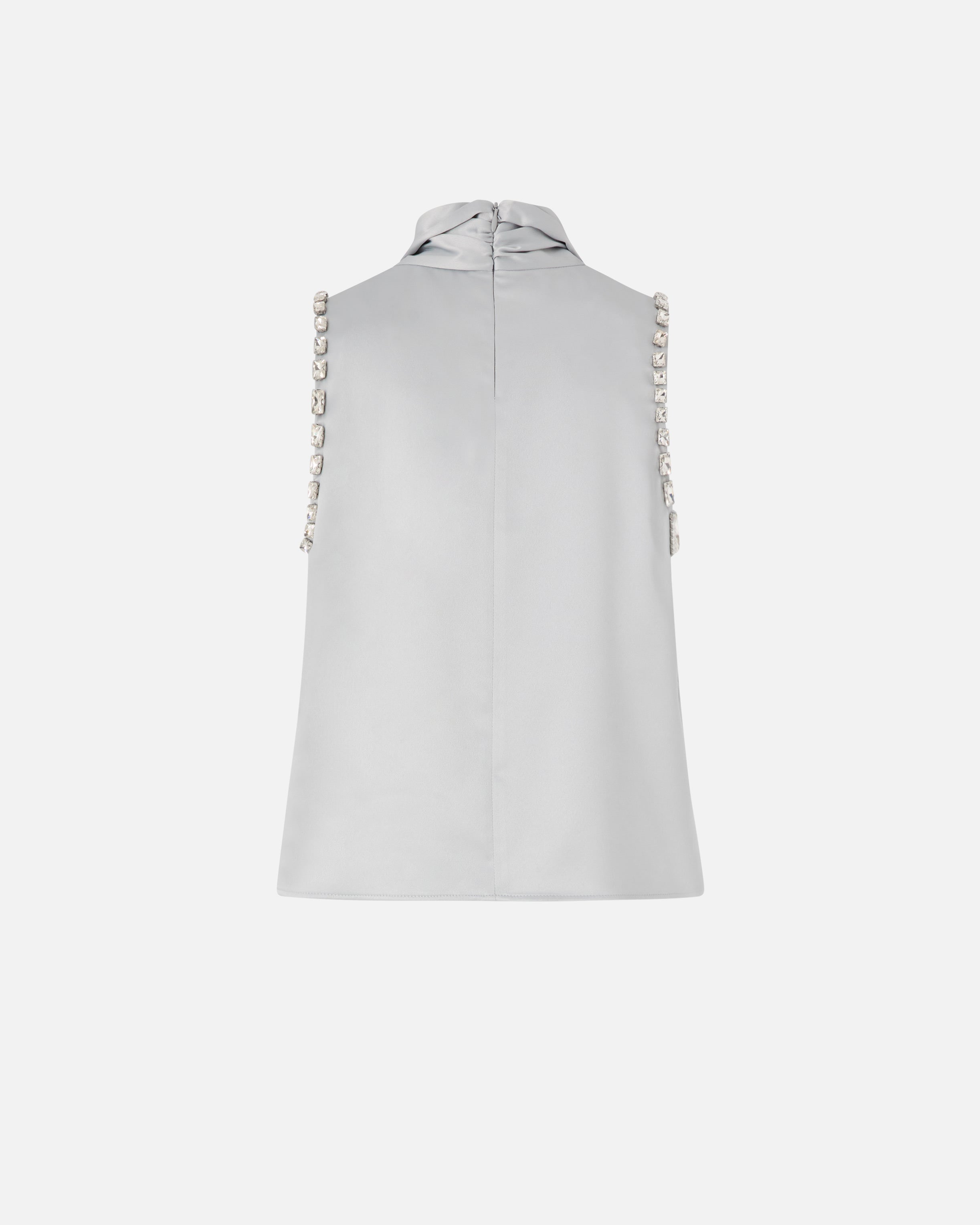 Loose-fitting sleeveless top in satin crepe fabric with a convenient invisible zip fastening at the back. This garment is embellished with bright square-shaped rhinestones embroidered along the entire armhole and an elegant sash integrated with a raised neck that you can wear in different ways for an original, personalised look with that pure PINKO style. Choose this piece for a fluid, slinky effect that brings out the female figure in a refined way.