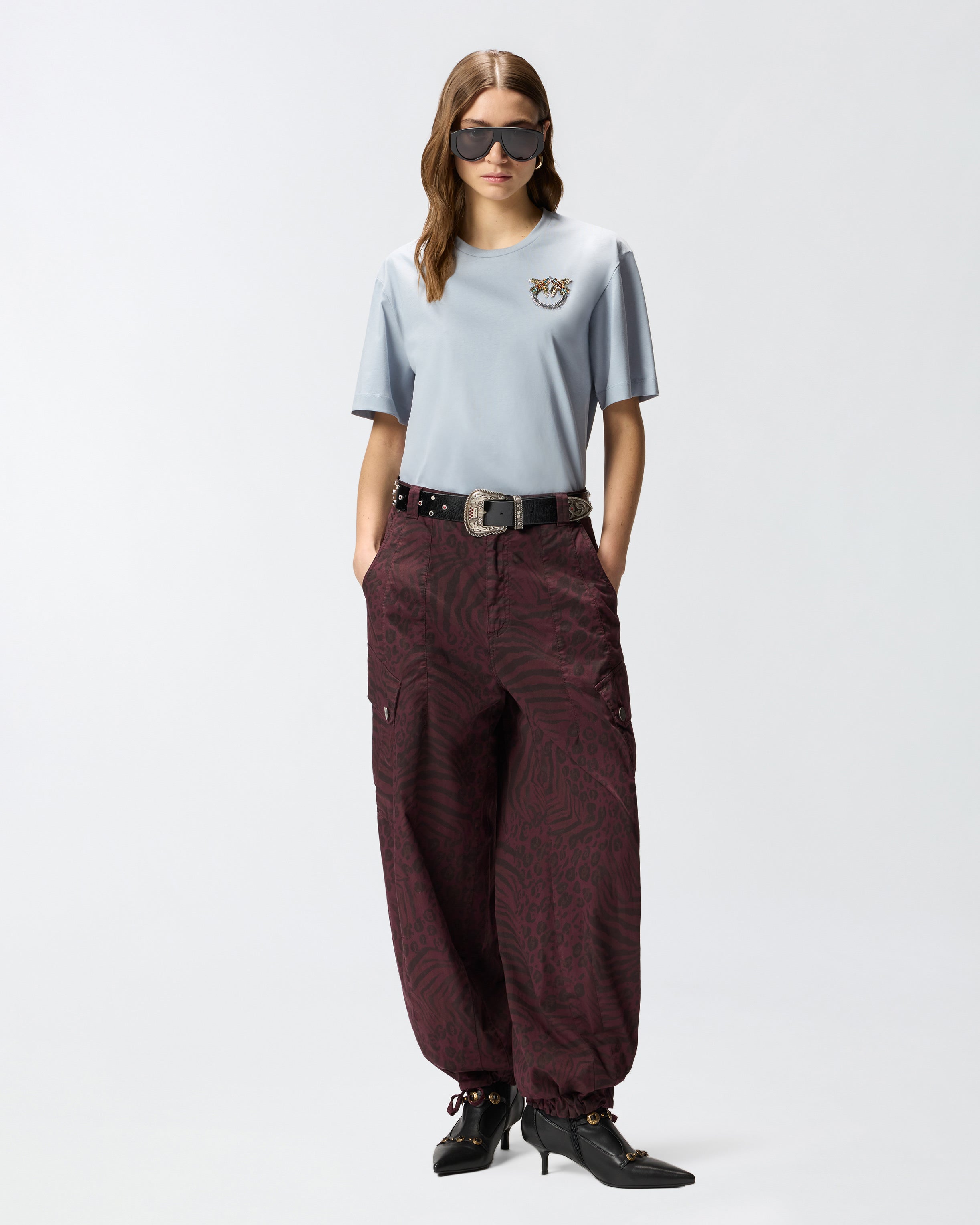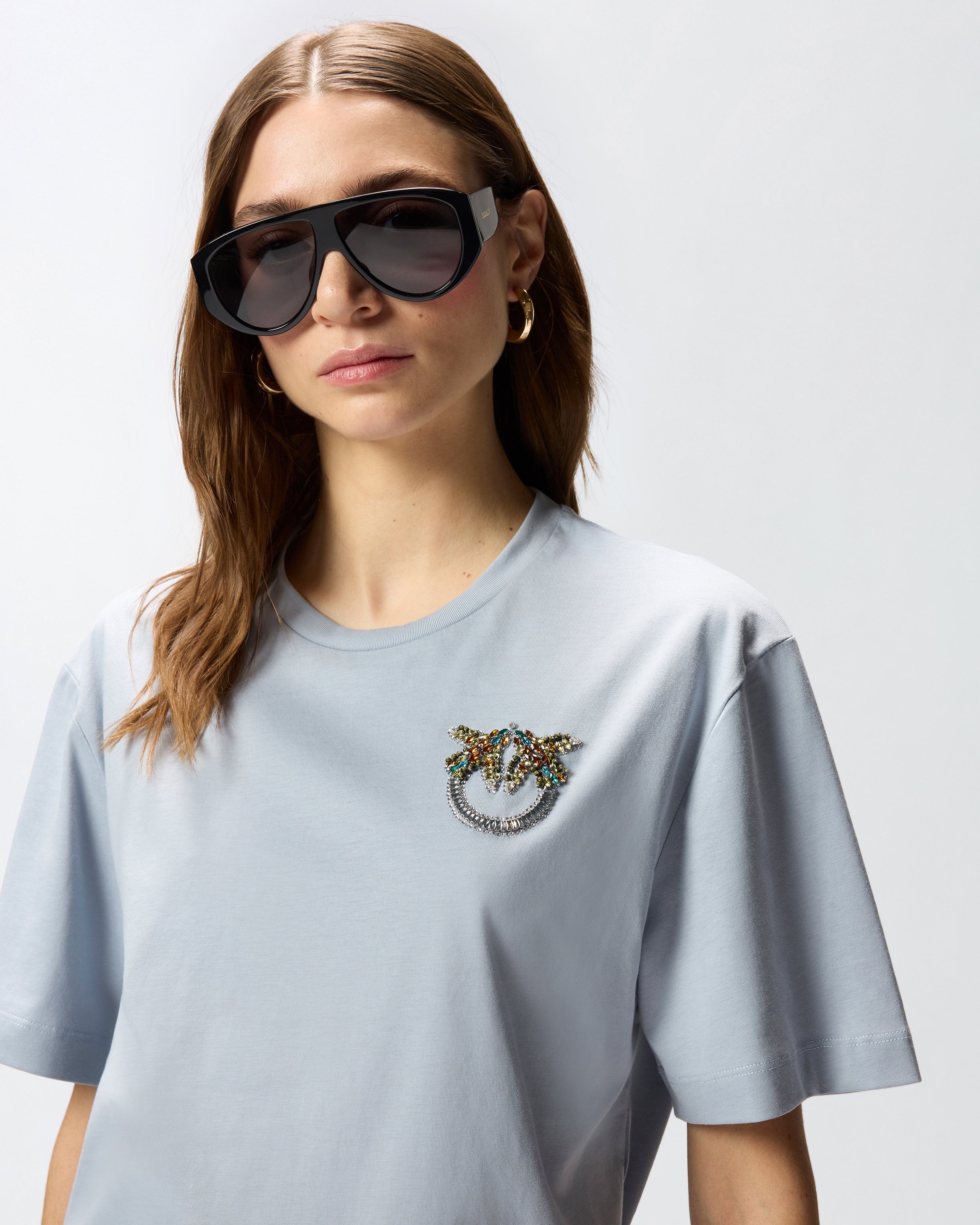 Crew-neck short-sleeved T-shirt in soft cotton jersey. The minimalist lines of the model are enhanced by the jewel embroidery on the chest formed by bright multi-coloured crystals that give life to the unmistakable Love Birds logo. Wear this T-shirt with your favourite jeans to give your casual outfits a sparkling touch in pure PINKO style.