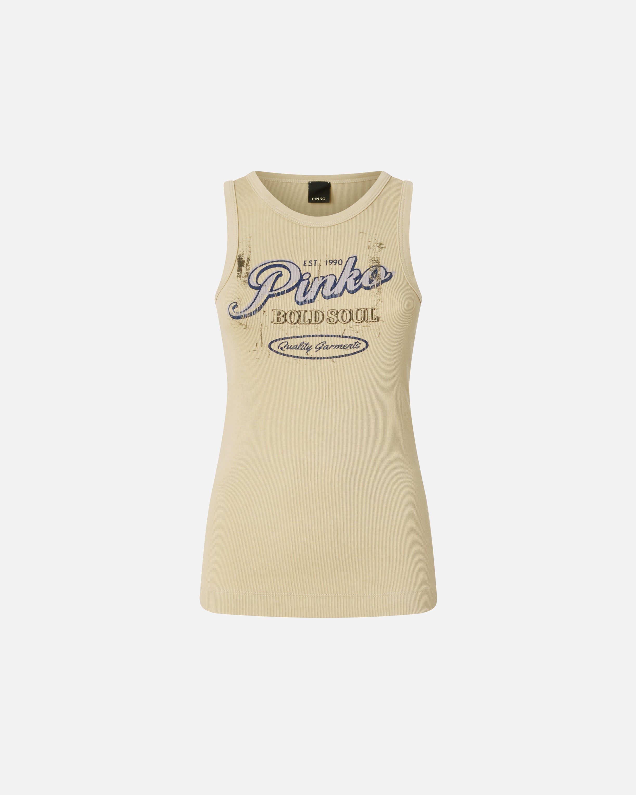 Crew-neck vest top in ribbed stretch cotton fabric, featuring a vintage-effect Pinko Bold Soul print on the front. A wardrobe staple reworked by PINKO, ideal for everyday outfits that are both functional and feminine.