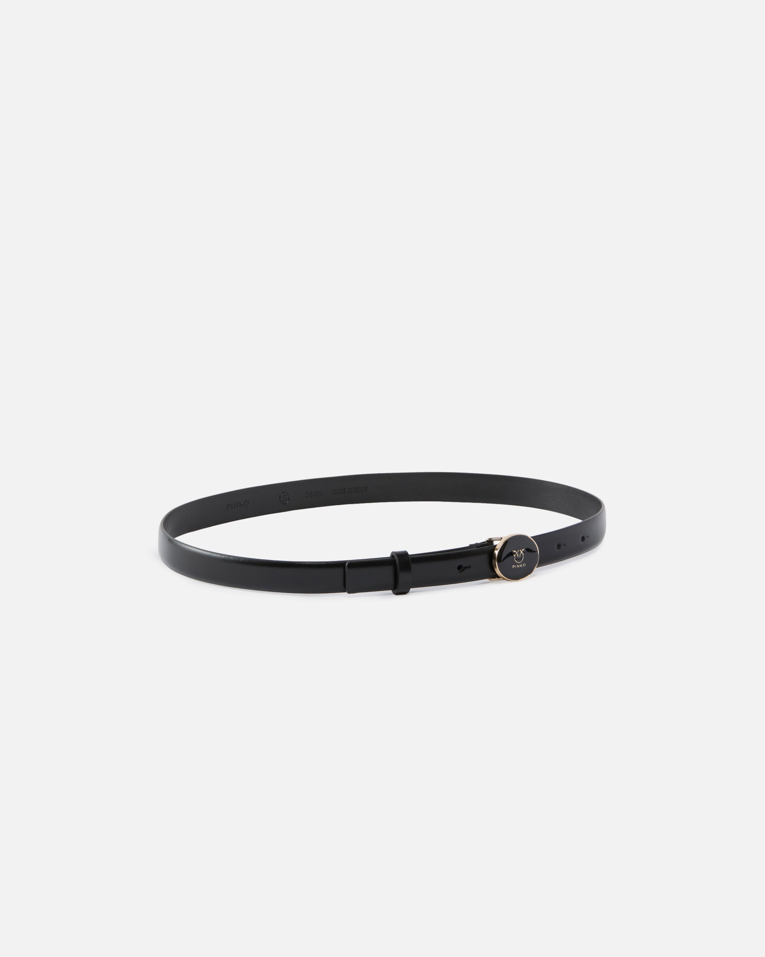 2-cm belt in soft leather. The hallmark of this model is undoubtedly the enamelled oval buckle with PINKO lettering logo and Love Birds logo. The interior is partly made from a material derived from regenerated leather fibres. Understated and refined, this accessory is the missing piece of your daytime looks and more.